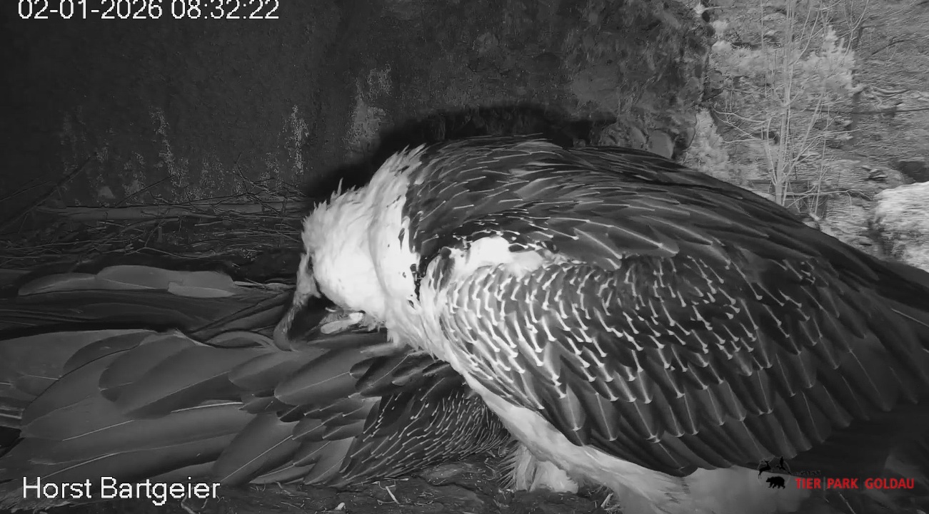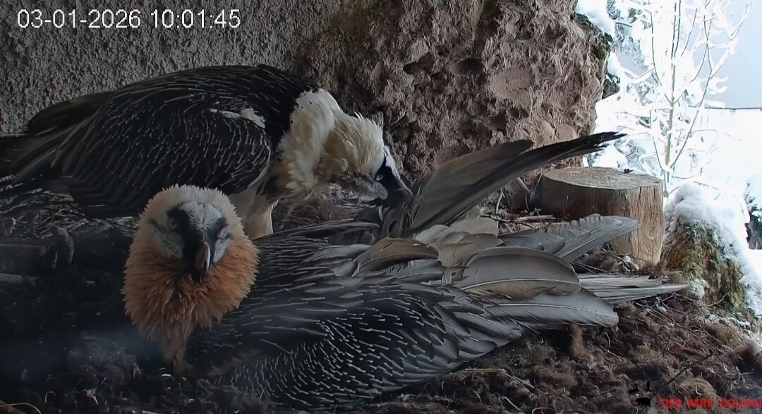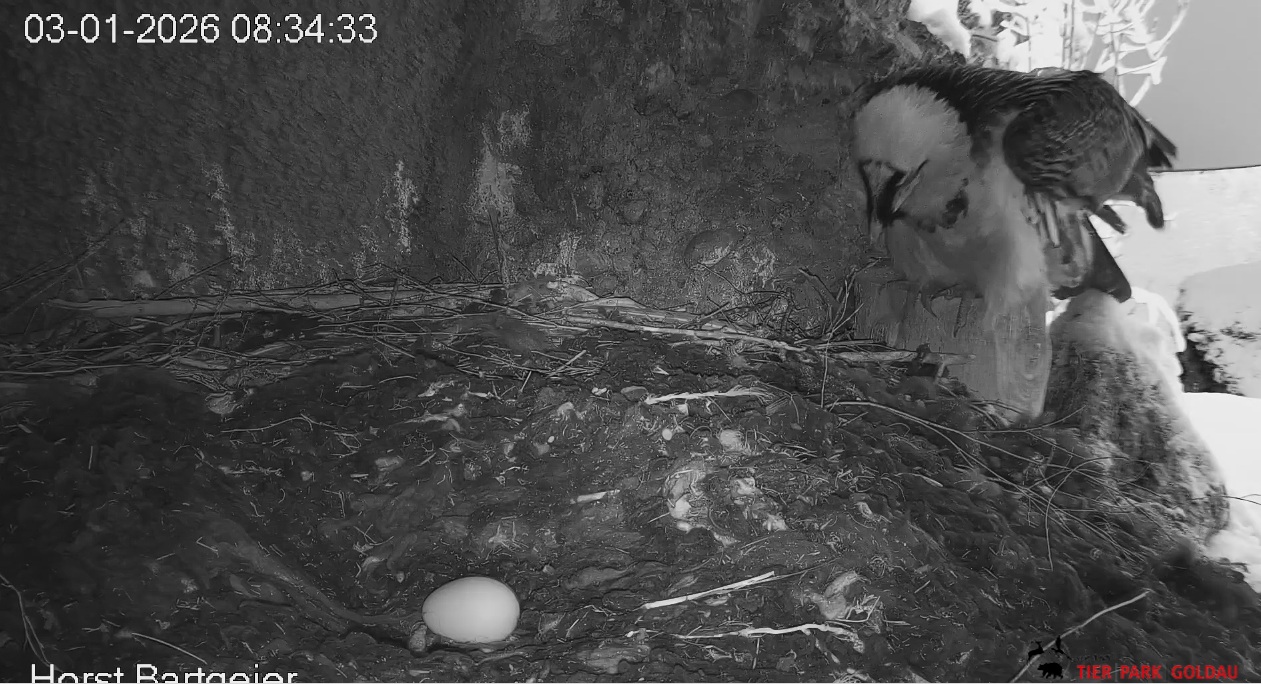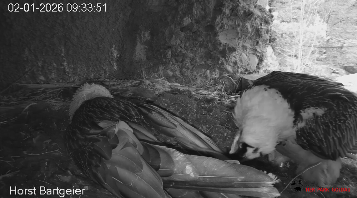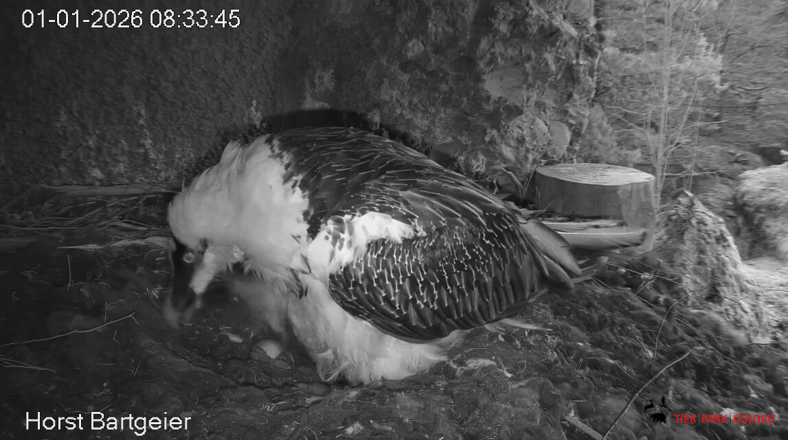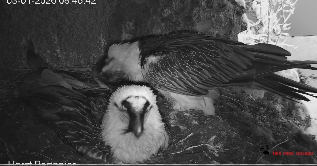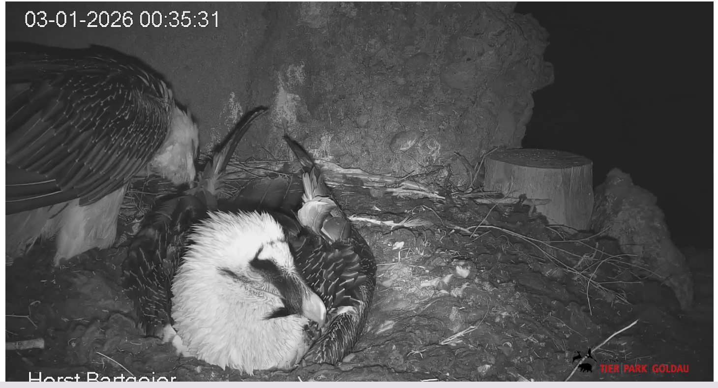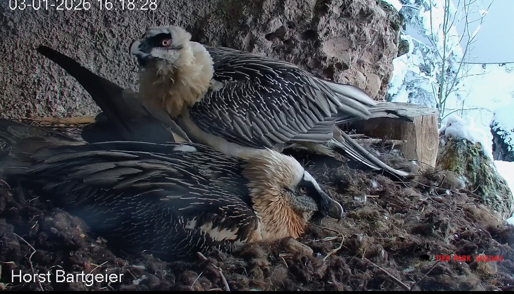 Sieht nach viel Schnee in Goldau aus. Hans schläft und Mascha ordnet ihr Gefieder. Als Hans aufsteht und unvermittelt nach draußen geht, übernimmt Mascha sofort das Brutgeschäft. Hans kommt aber schnell zurück und betreut Mascha liebevoll.