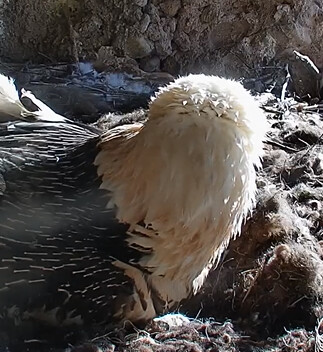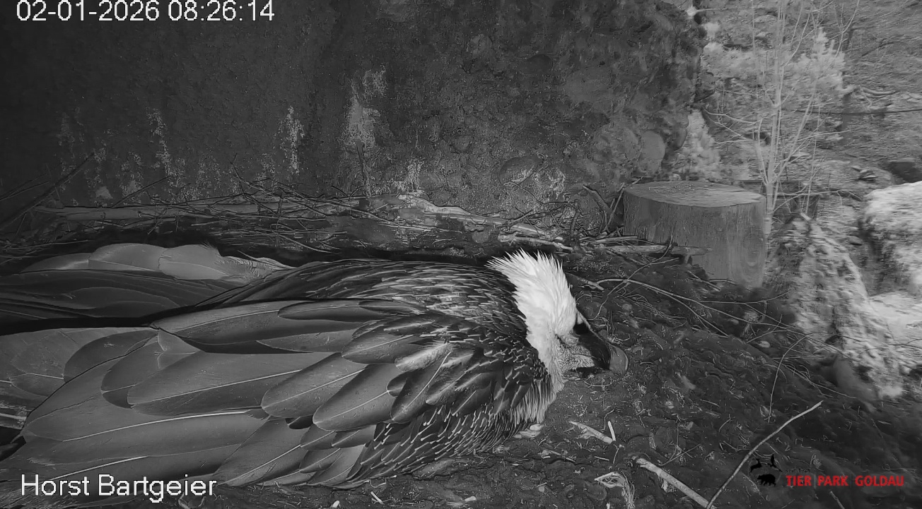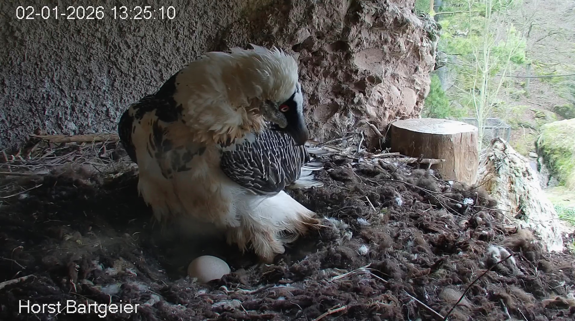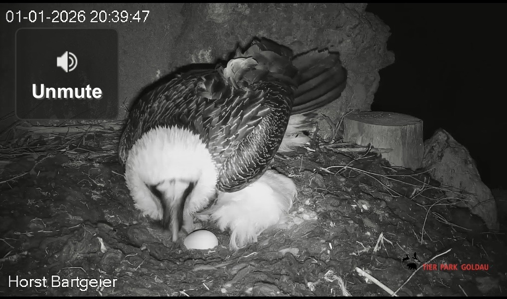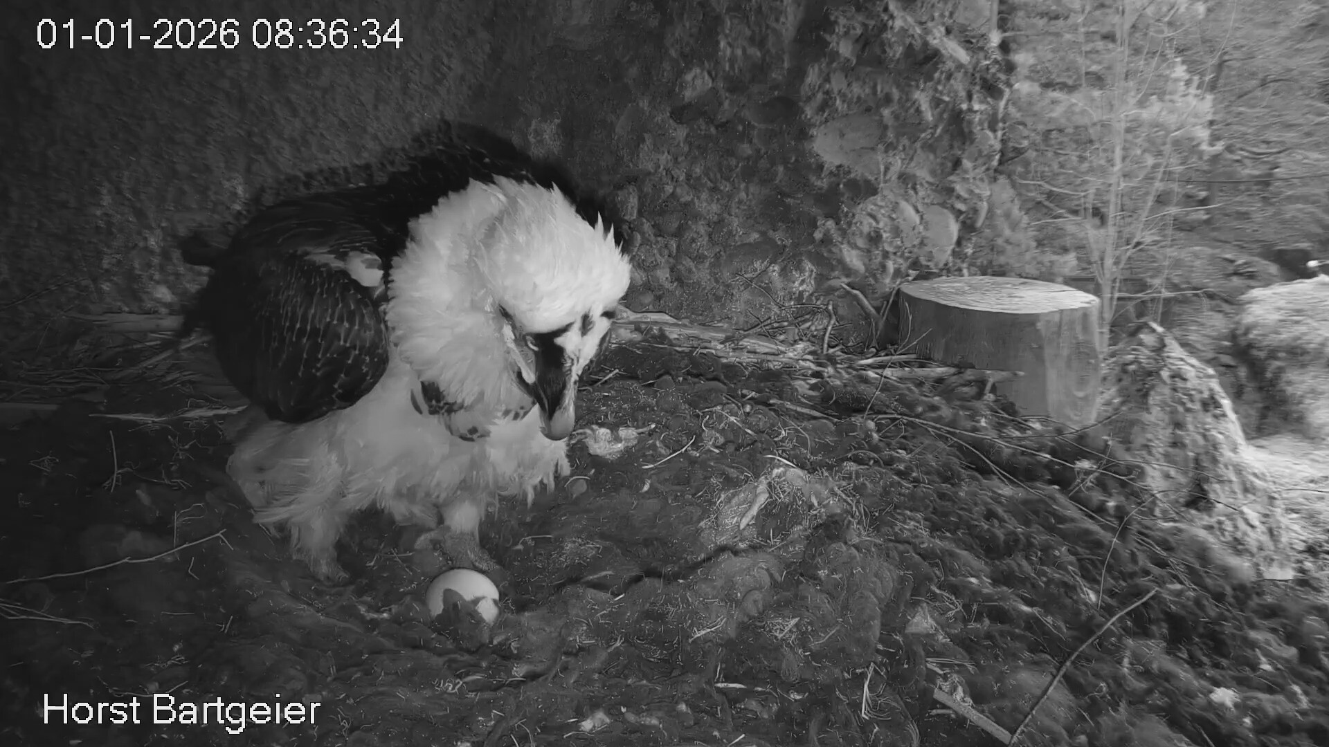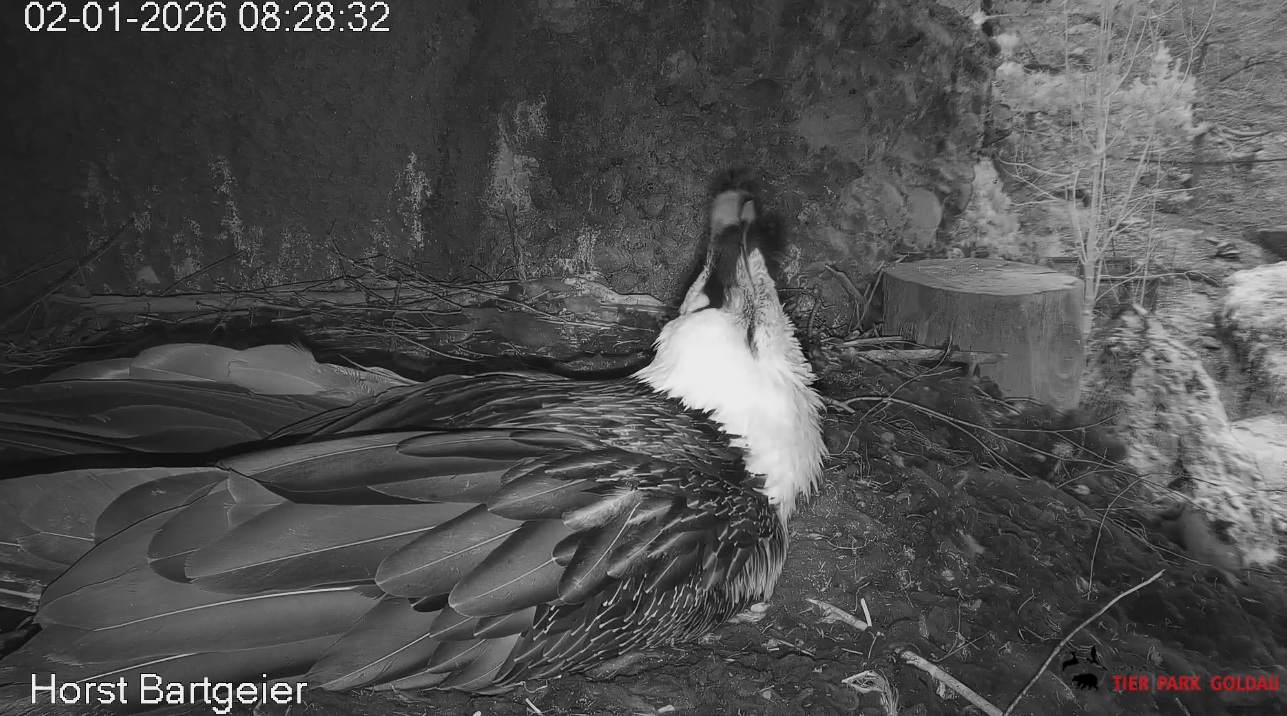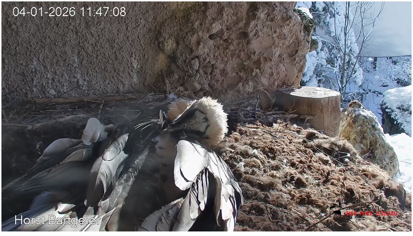 Sieht nach viel Schnee in Goldau aus. Hans schläft und Mascha ordnet ihr Gefieder. Als Hans aufsteht und unvermittelt nach draußen geht, übernimmt Mascha sofort das Brutgeschäft. Hans kommt aber schnell zurück und betreut Mascha liebevoll.
