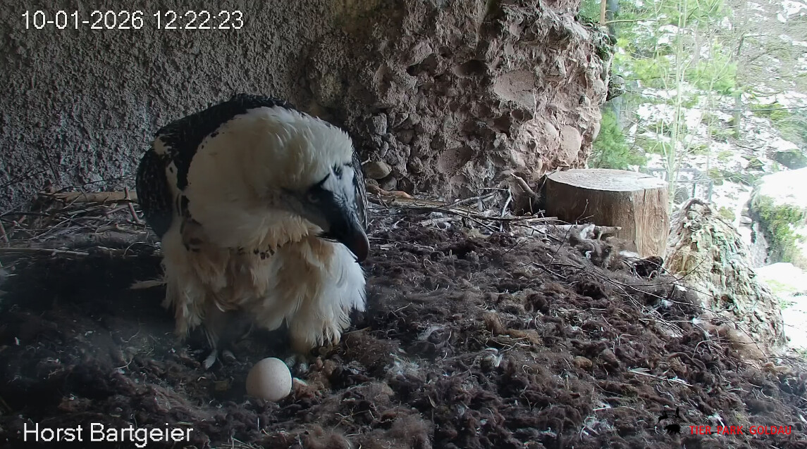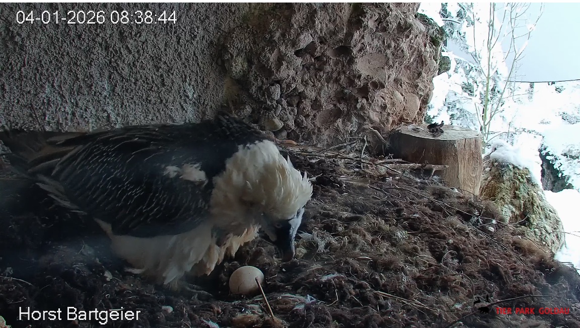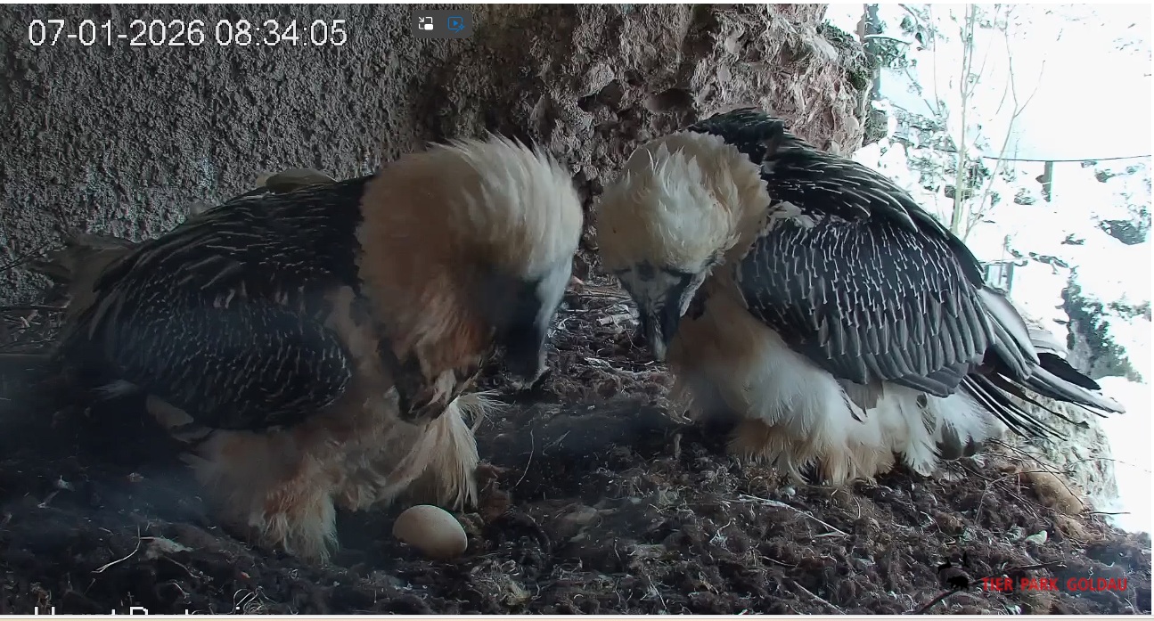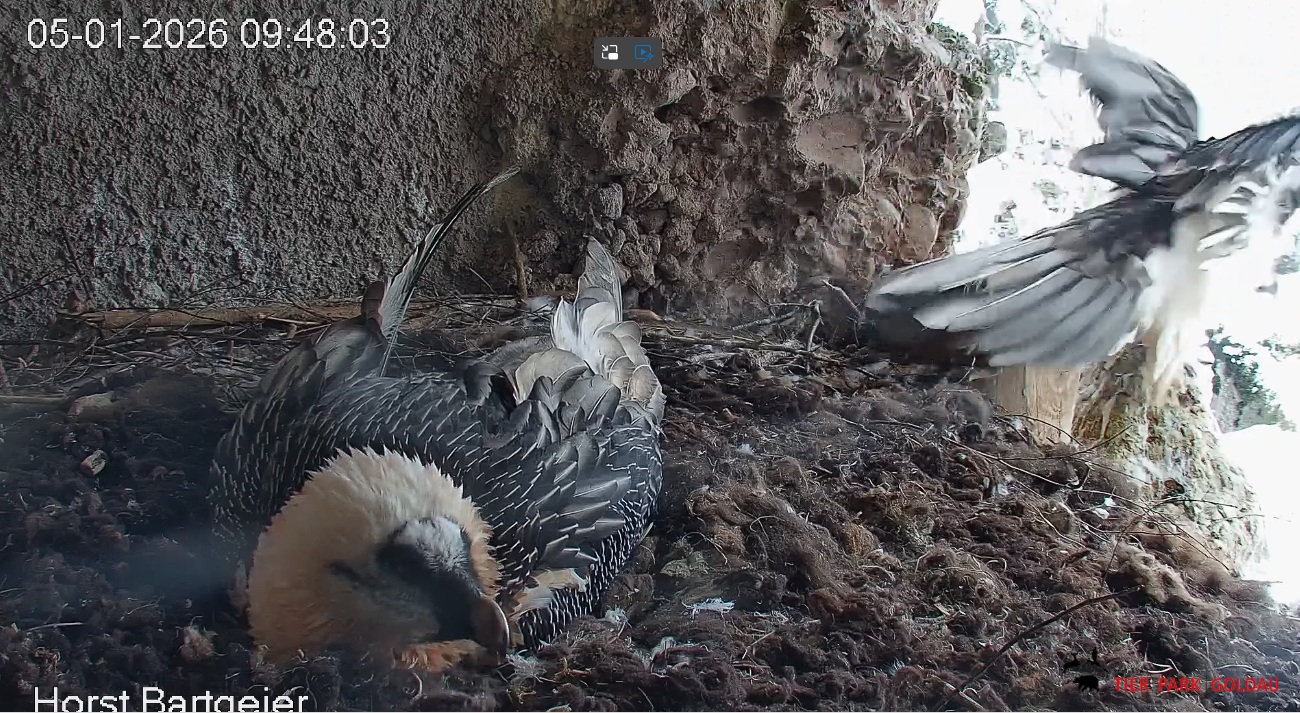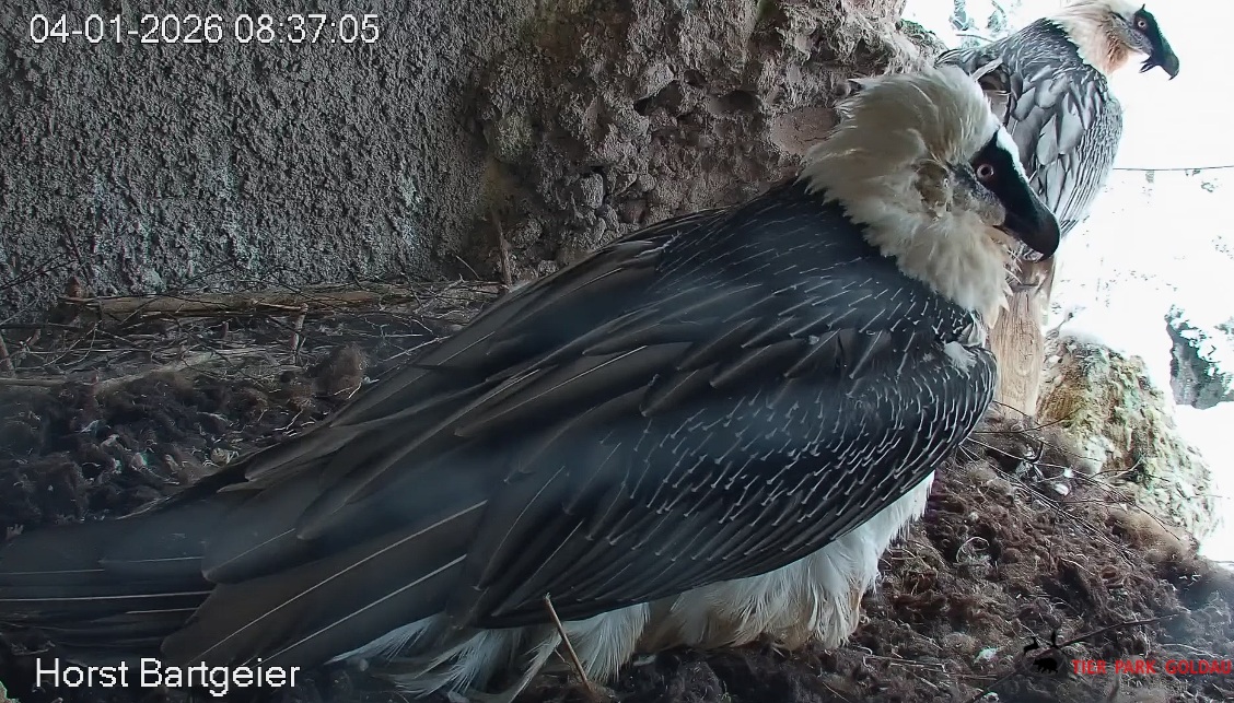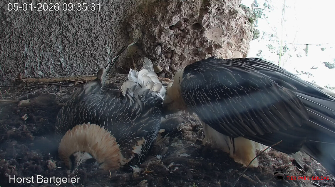 Eiübergabe, jetzt ist Hans an der Reihe. Kurze “Besprechung”, dann geht Mascha auf den Ansitz zur Gefiederpflege. Hans zupft am Nistmaterial mit einem herzhaften Gähnen.![]()