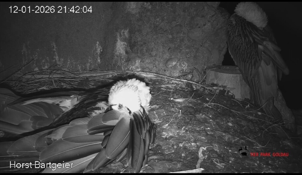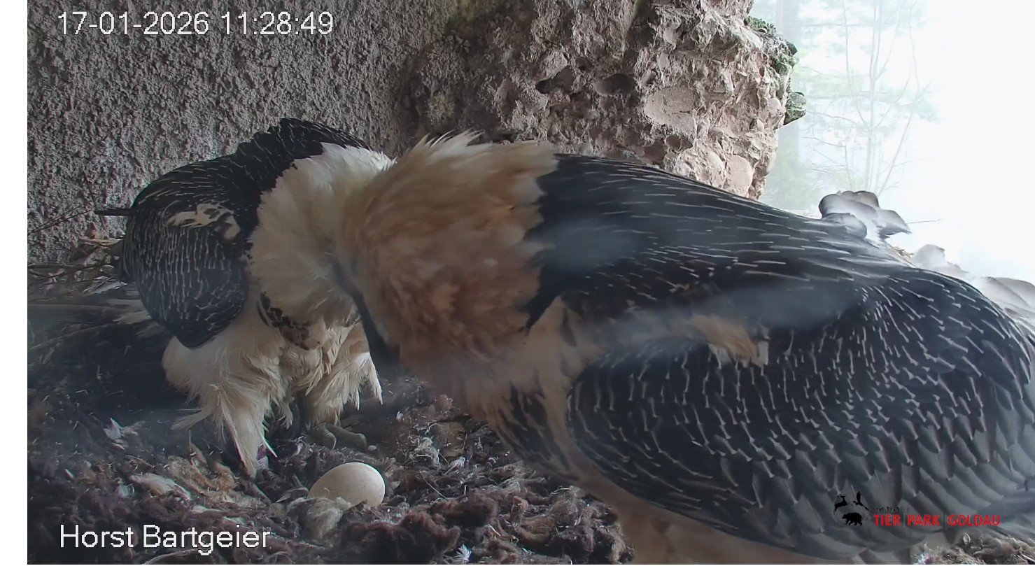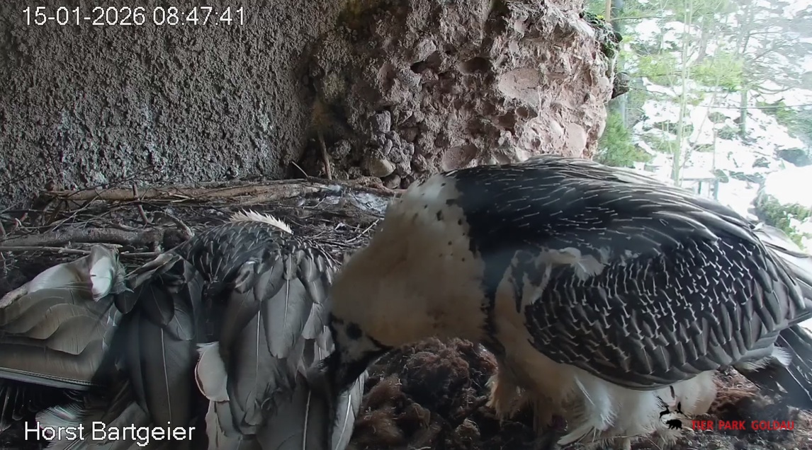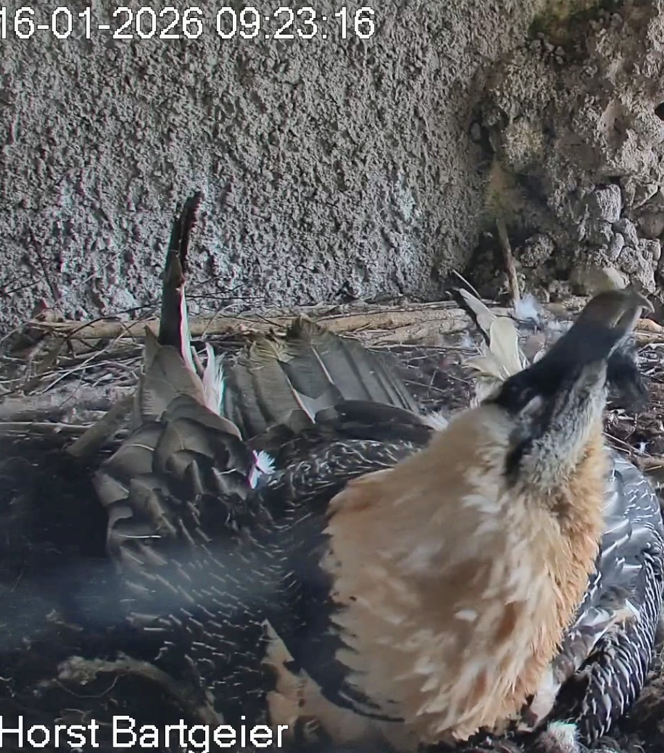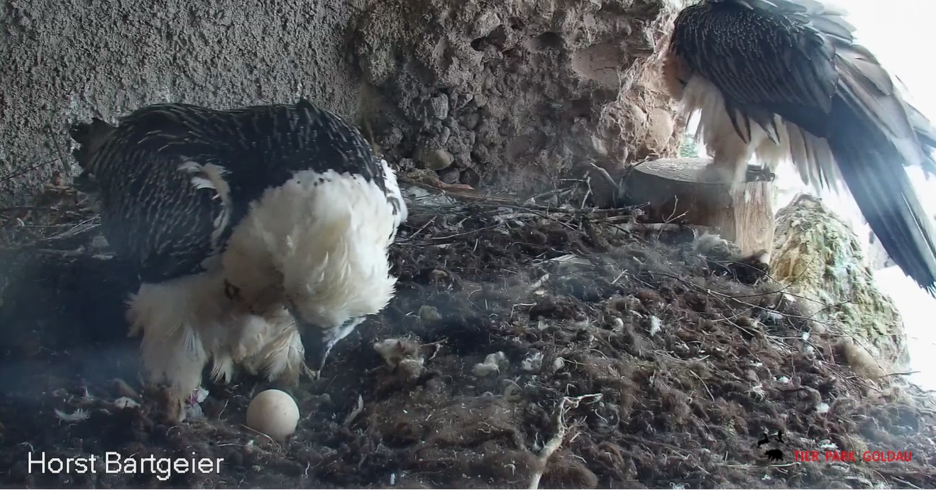 Schichtwechsel bei Fam. Bartgeier, Hans übernimmt das Ei zum Weiterbrüten. Für Mascha kommt jetzt die Gefiederpflege an die Reihe. ![]()