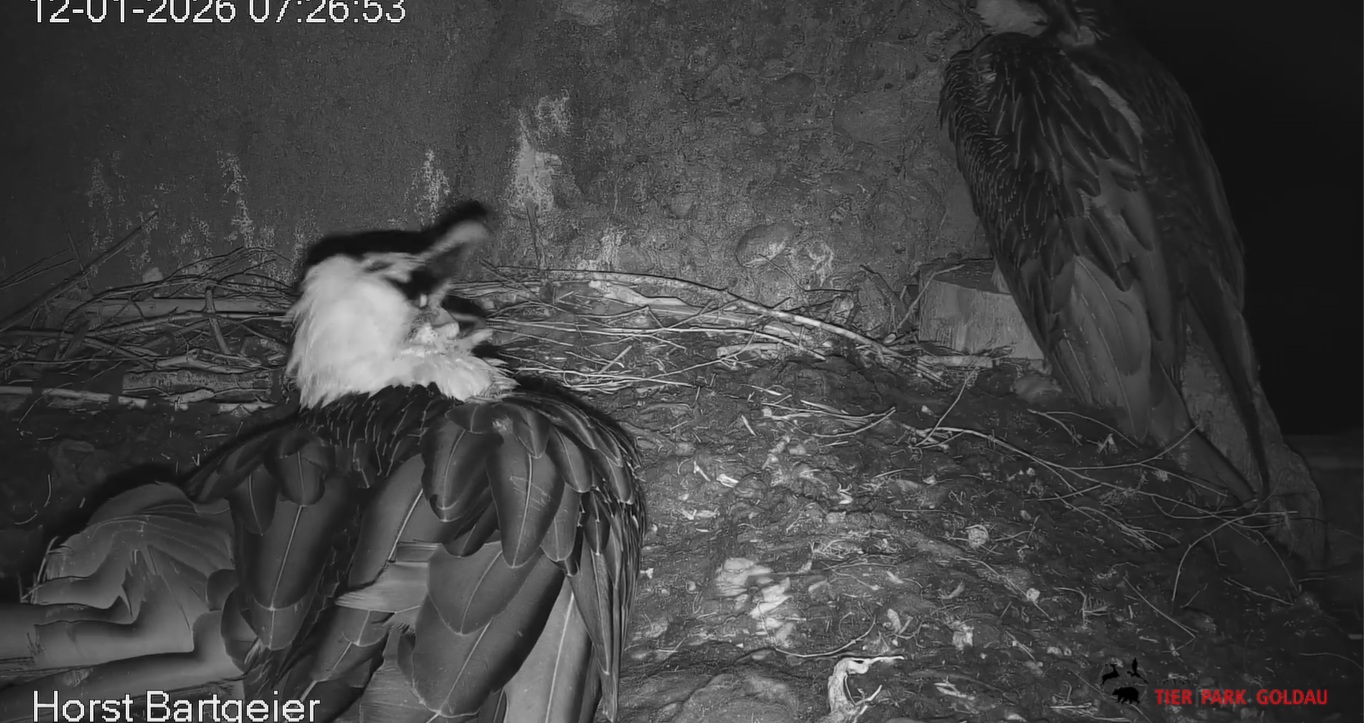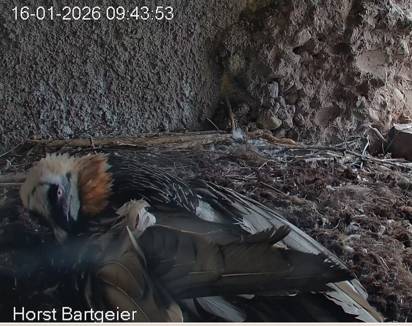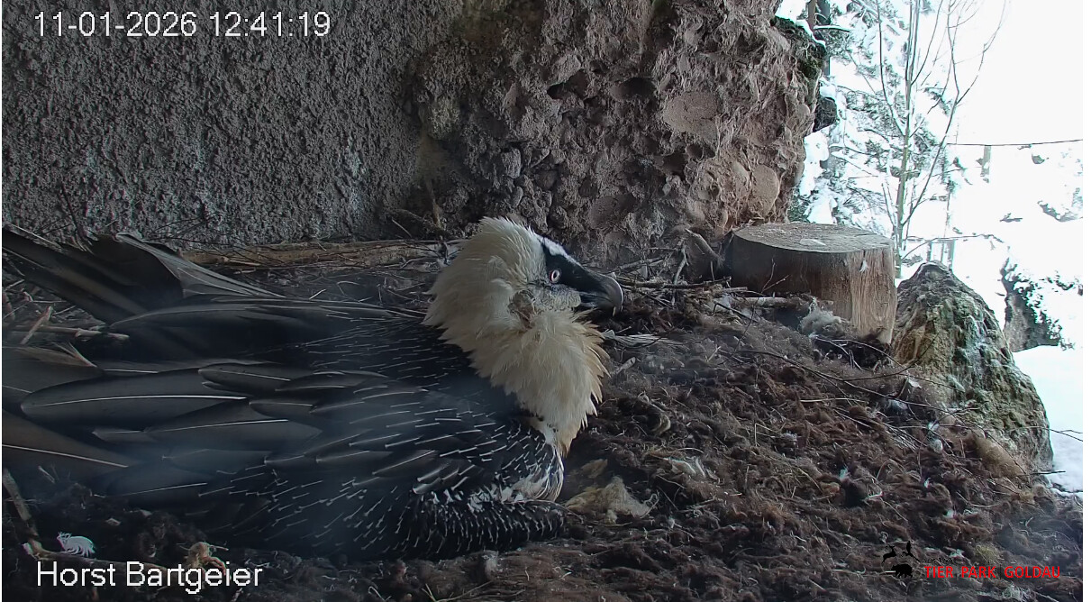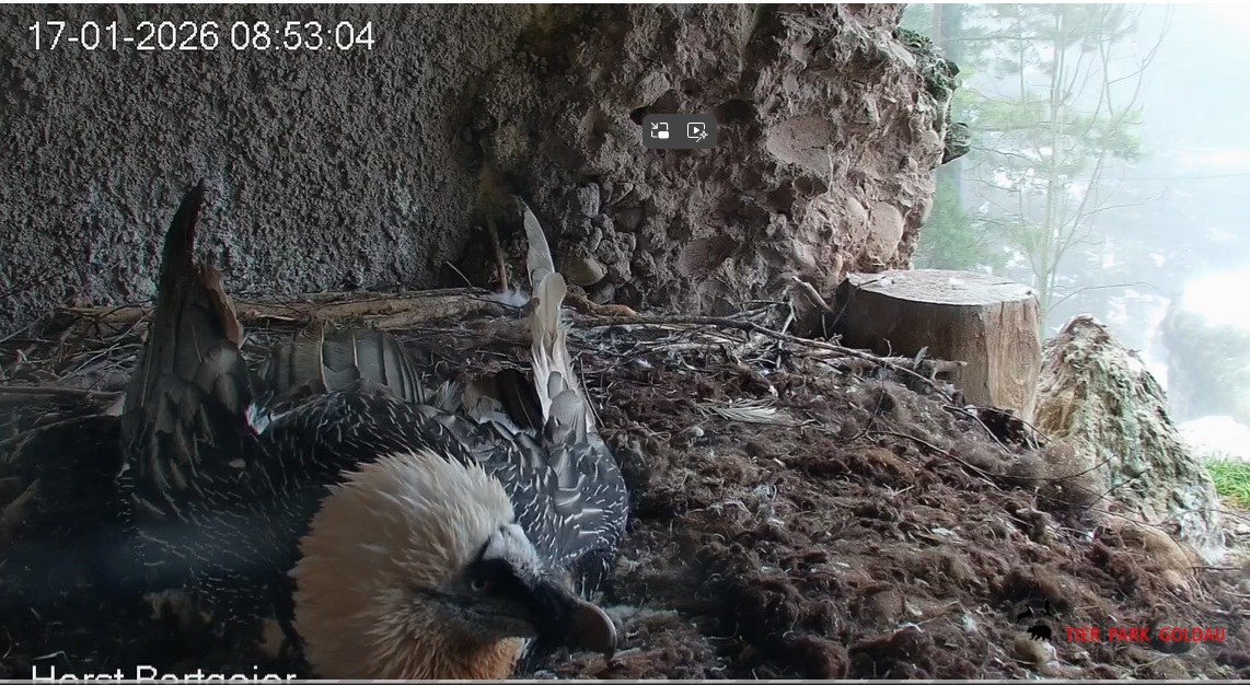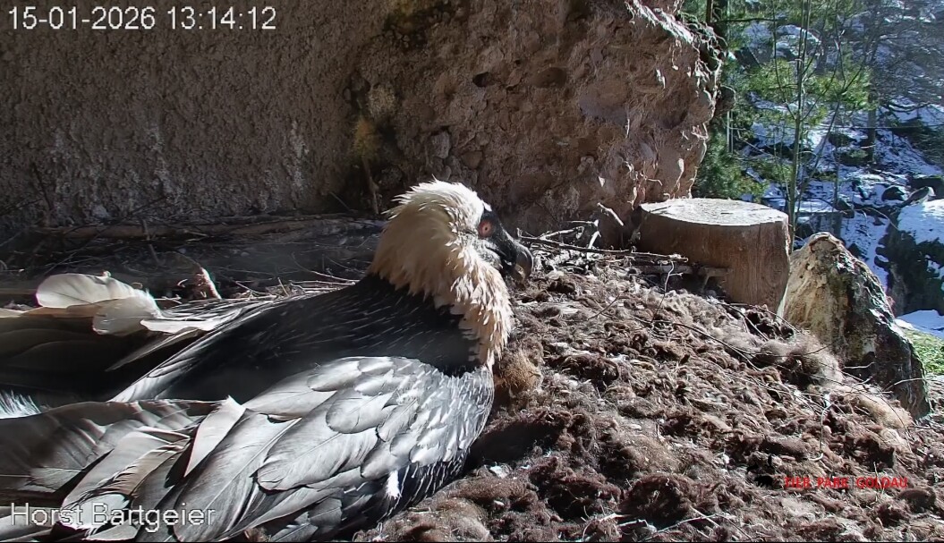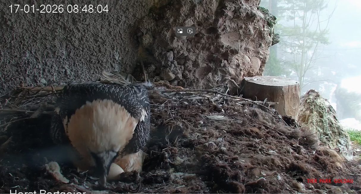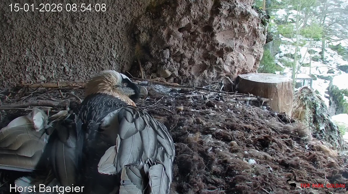 Schichtwechsel bei Fam. Bartgeier, Hans übernimmt das Ei zum Weiterbrüten. Für Mascha kommt jetzt die Gefiederpflege an die Reihe. ![]()
