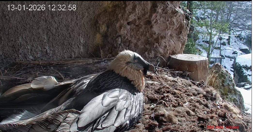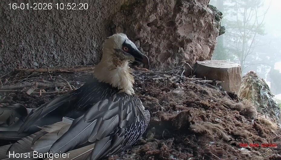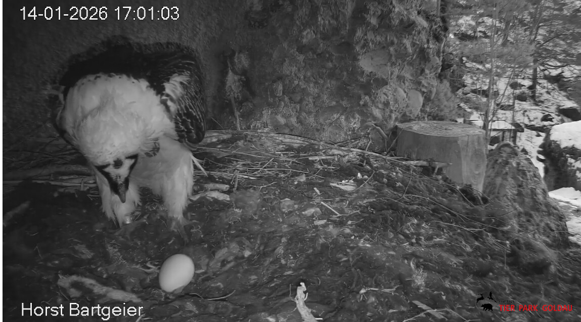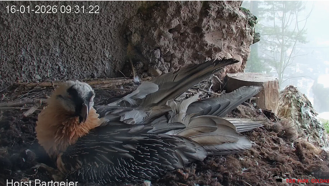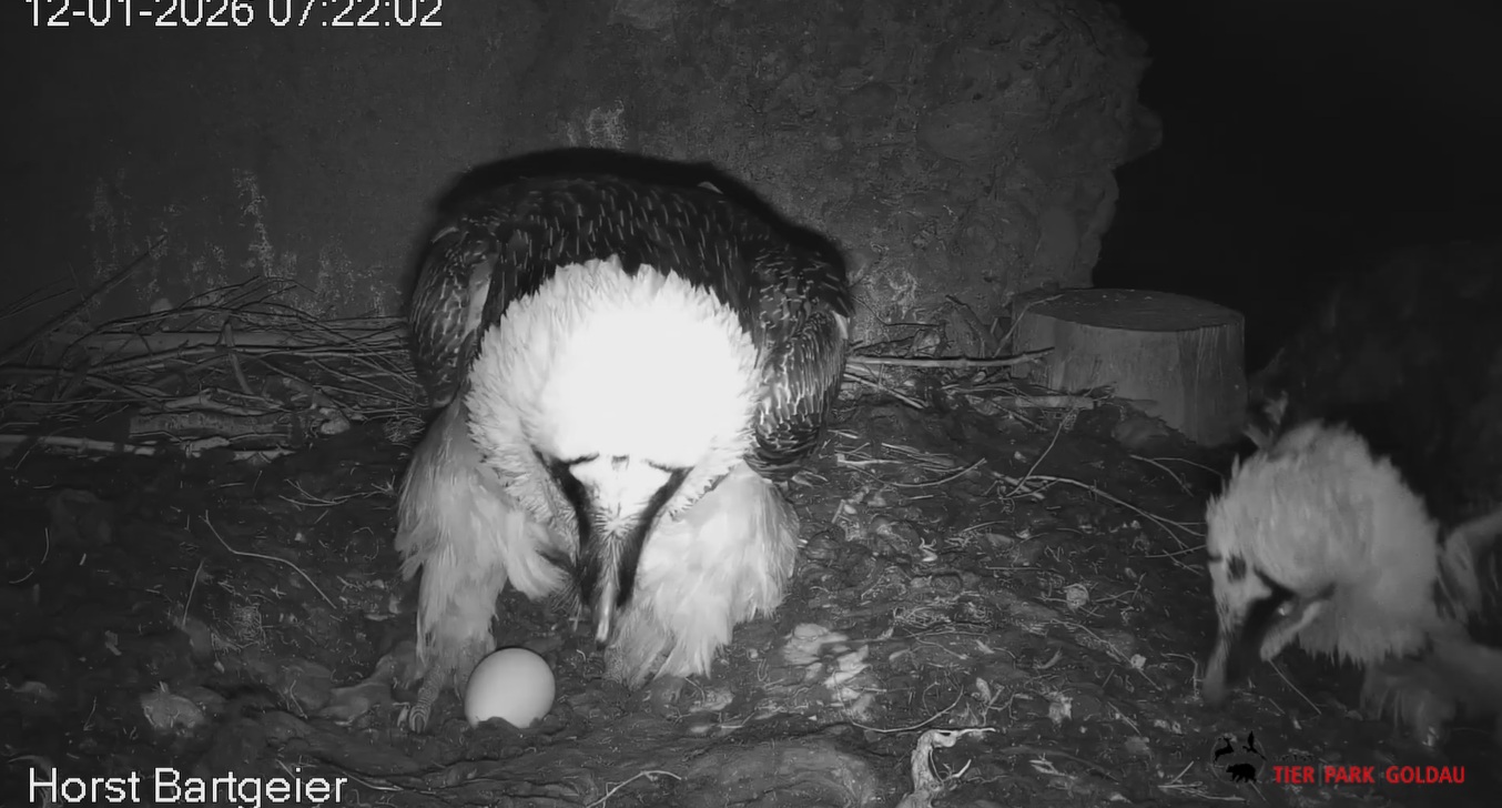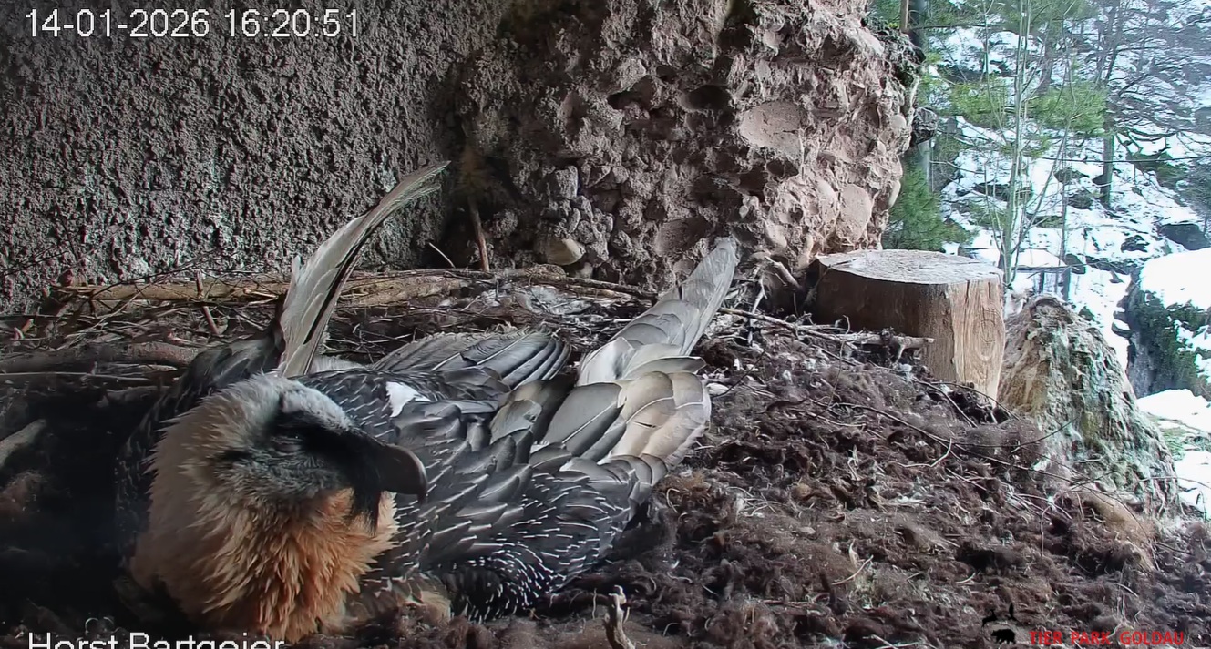 Schichtwechsel bei Fam. Bartgeier, Hans übernimmt das Ei zum Weiterbrüten. Für Mascha kommt jetzt die Gefiederpflege an die Reihe. ![]()