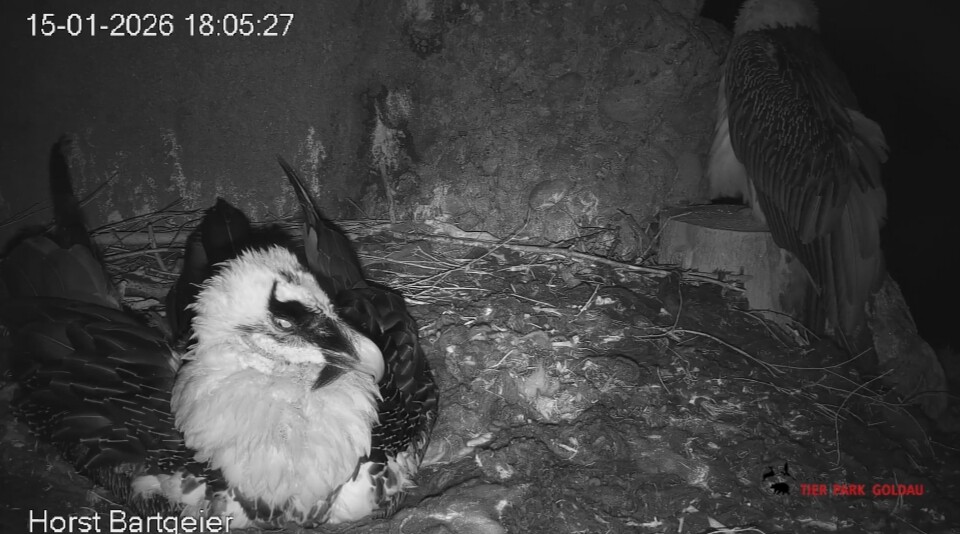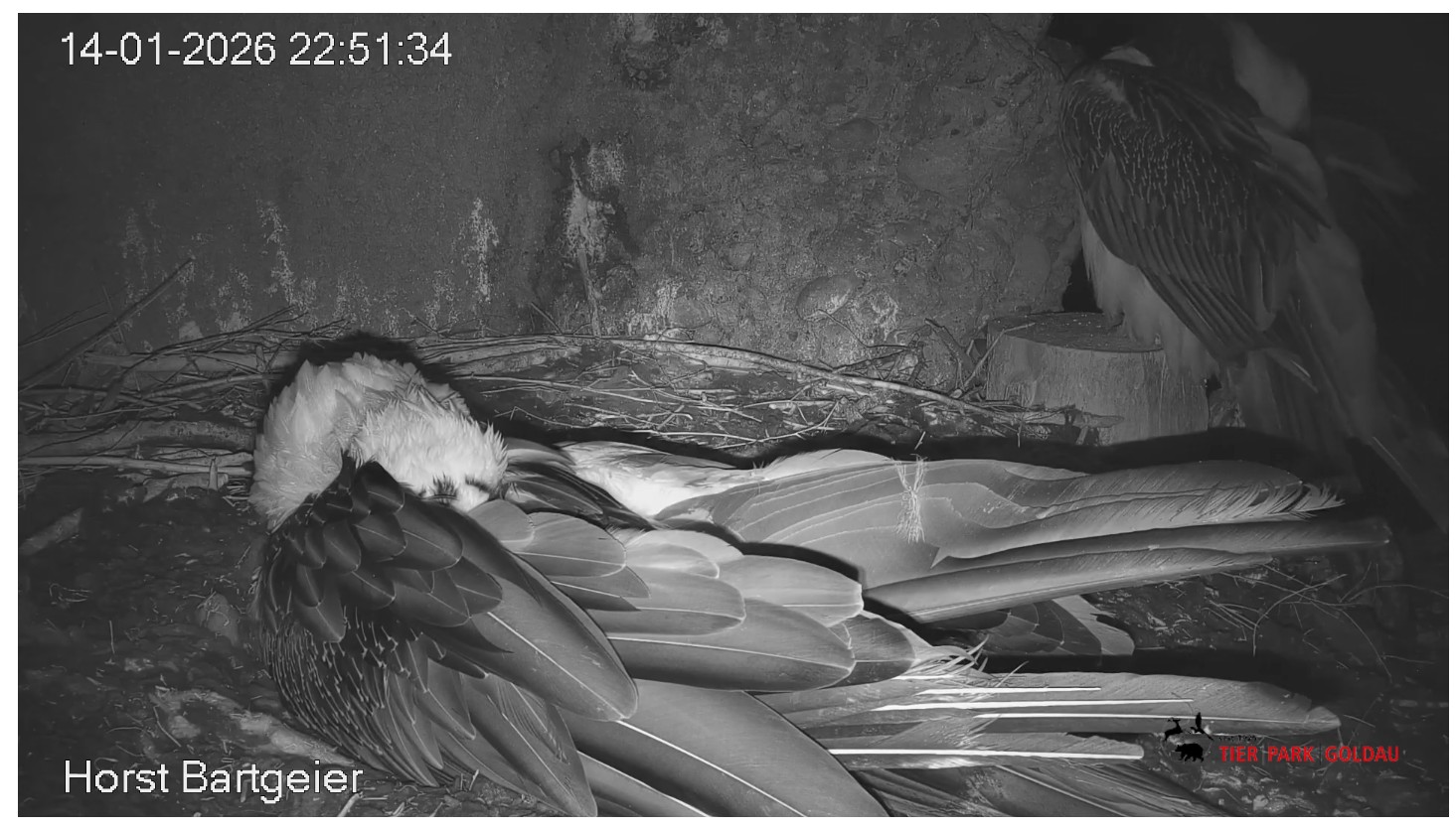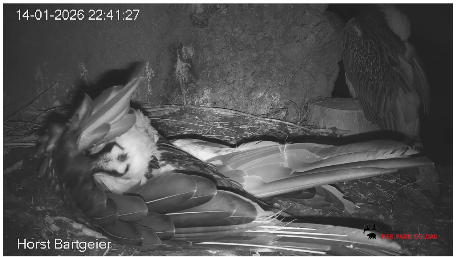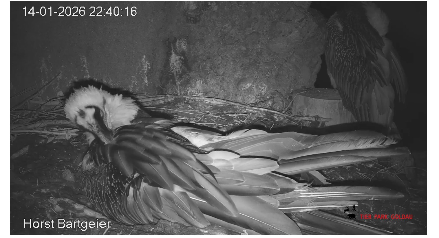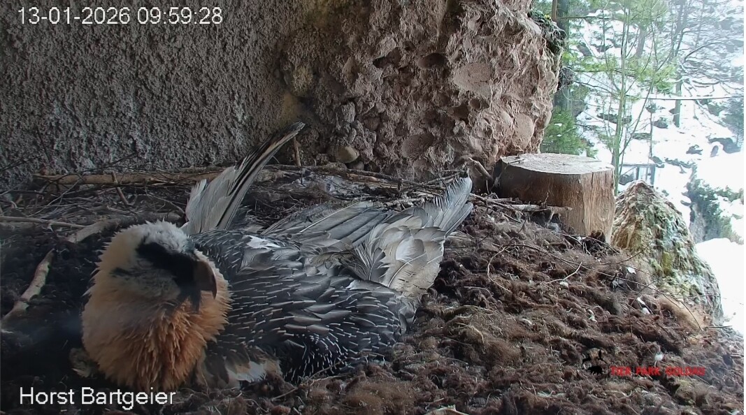 Schichtwechsel bei Fam. Bartgeier, Hans übernimmt das Ei zum Weiterbrüten. Für Mascha kommt jetzt die Gefiederpflege an die Reihe. ![]()