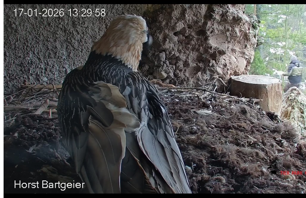 Ein Mitarbeiter geht durch das Bartgeiergehege. Hans verläßt sofort das Ei um draußen nachzuschauen. Mascha geht sogleich zur Nestmulde und übernimmt das Brutgeschäft. Die Störung ist gut ausgegangen. ![]()