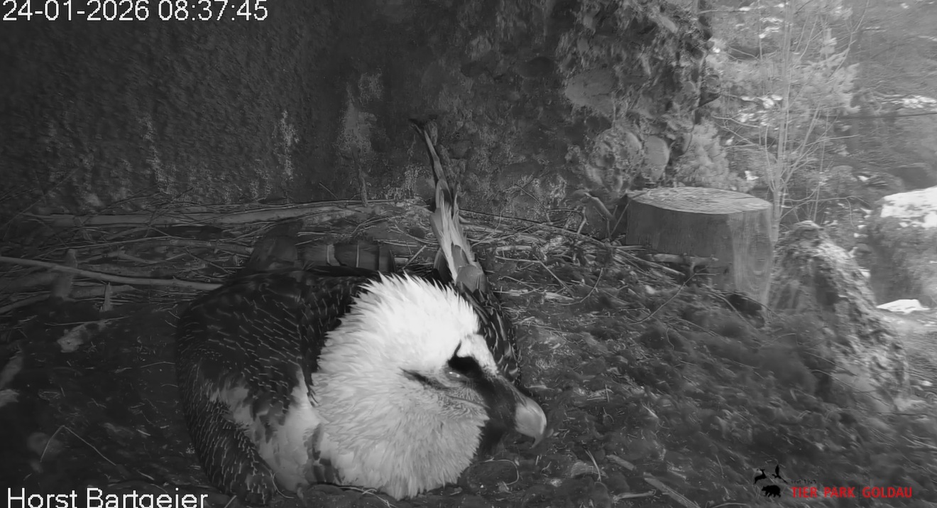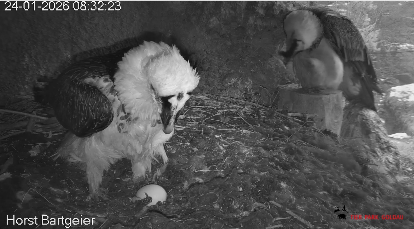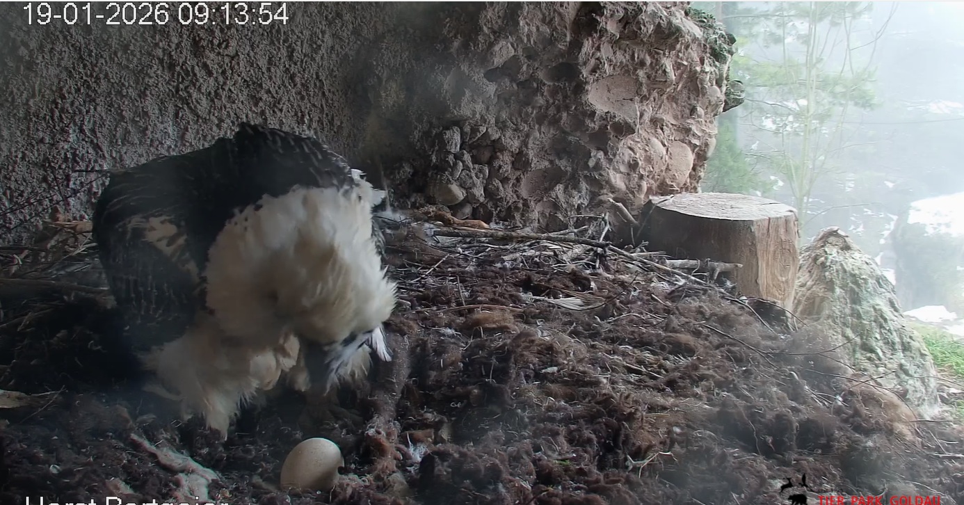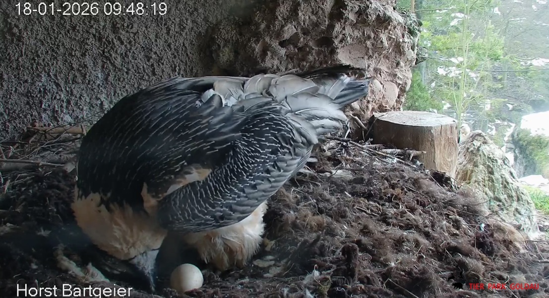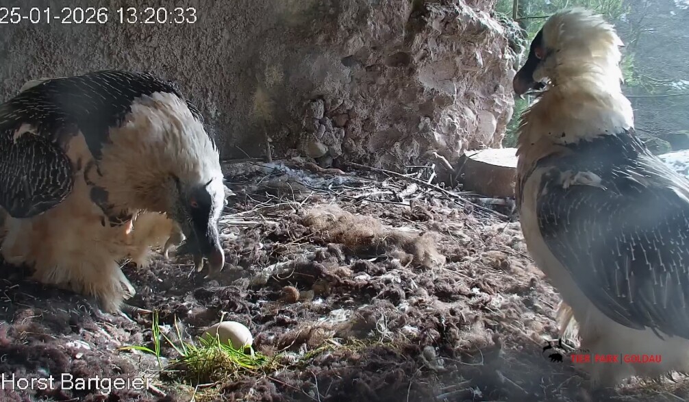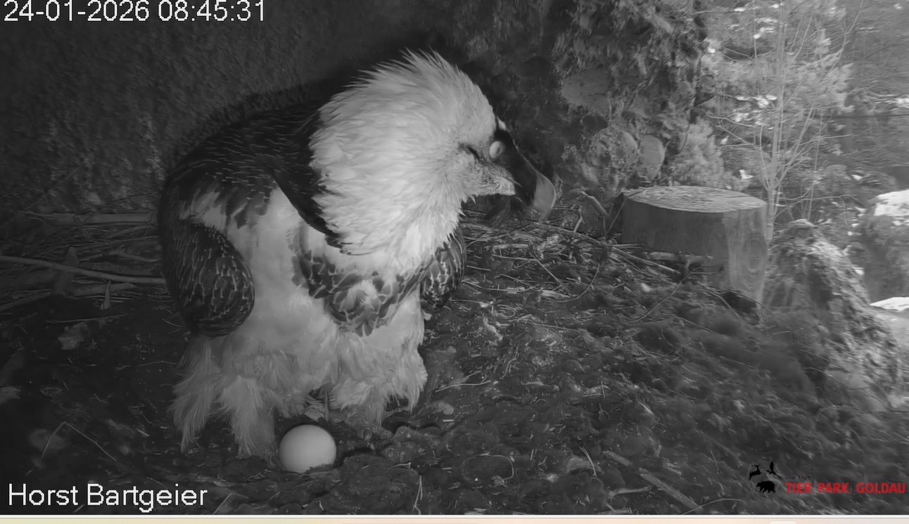 Heute Morgen wieder ein Moment erhöhter Aufmerksamkeit und Unruhe, als ein Pfleger vorbeiging. Mascha verließ dann den Ansitz, derweil Hans sich intensiv um das Ei gekümmert hat, trotz offensichtlicher Müdigkeit. ![]()