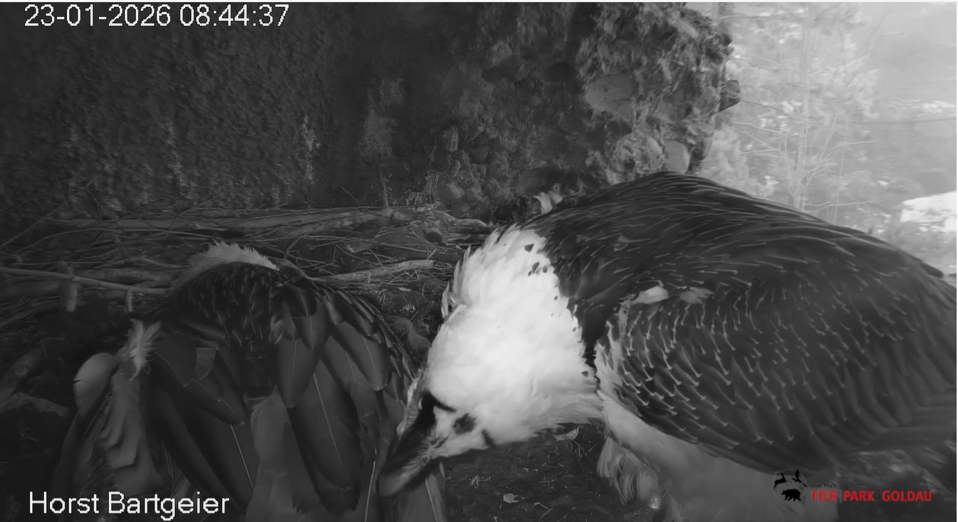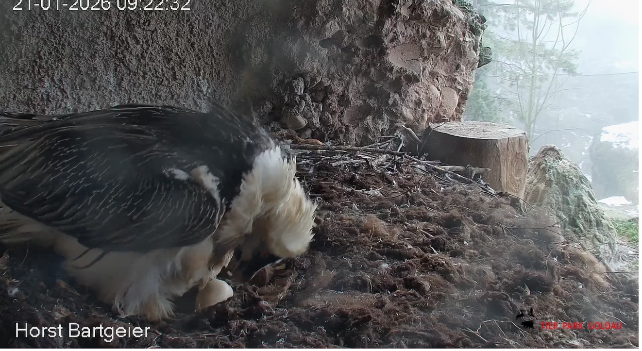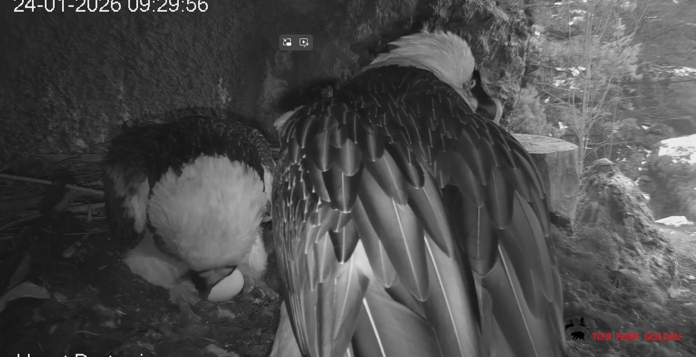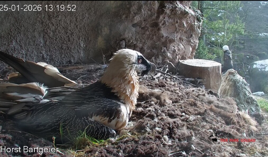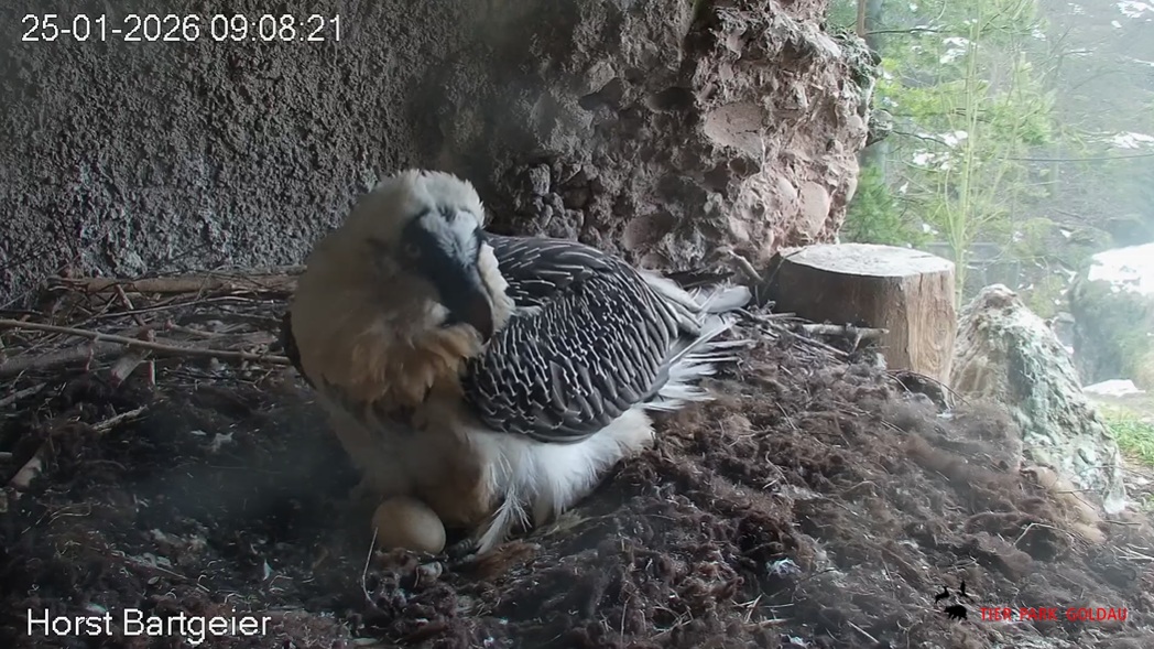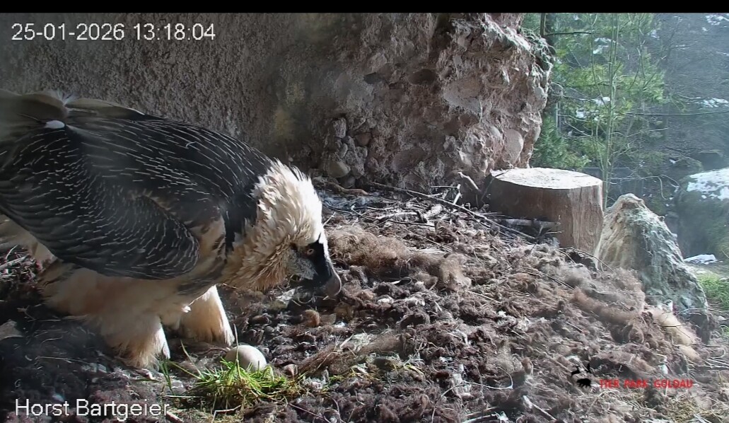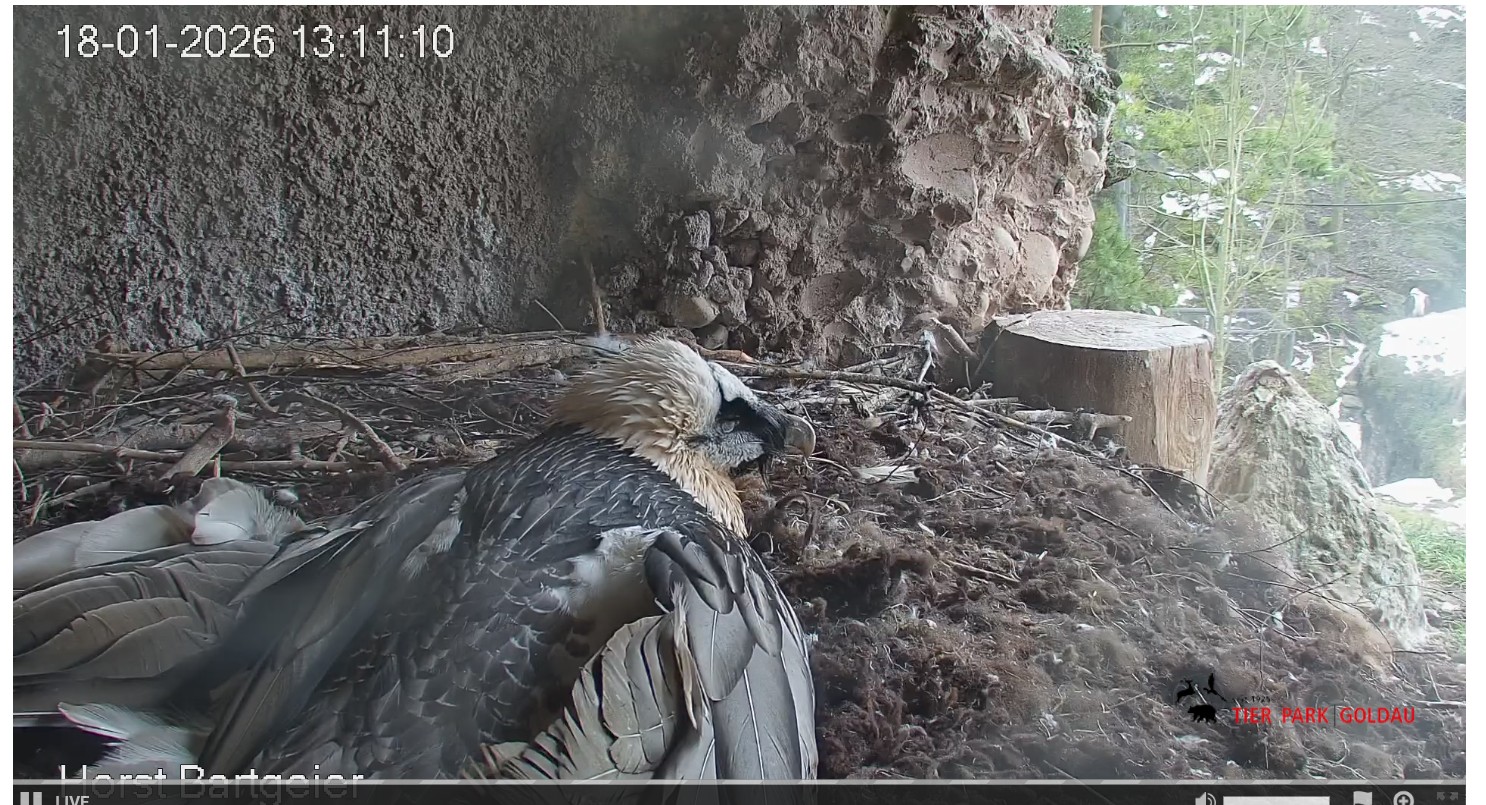 Heute Morgen wieder ein Moment erhöhter Aufmerksamkeit und Unruhe, als ein Pfleger vorbeiging. Mascha verließ dann den Ansitz, derweil Hans sich intensiv um das Ei gekümmert hat, trotz offensichtlicher Müdigkeit. ![]()