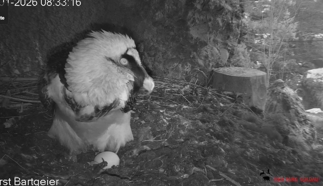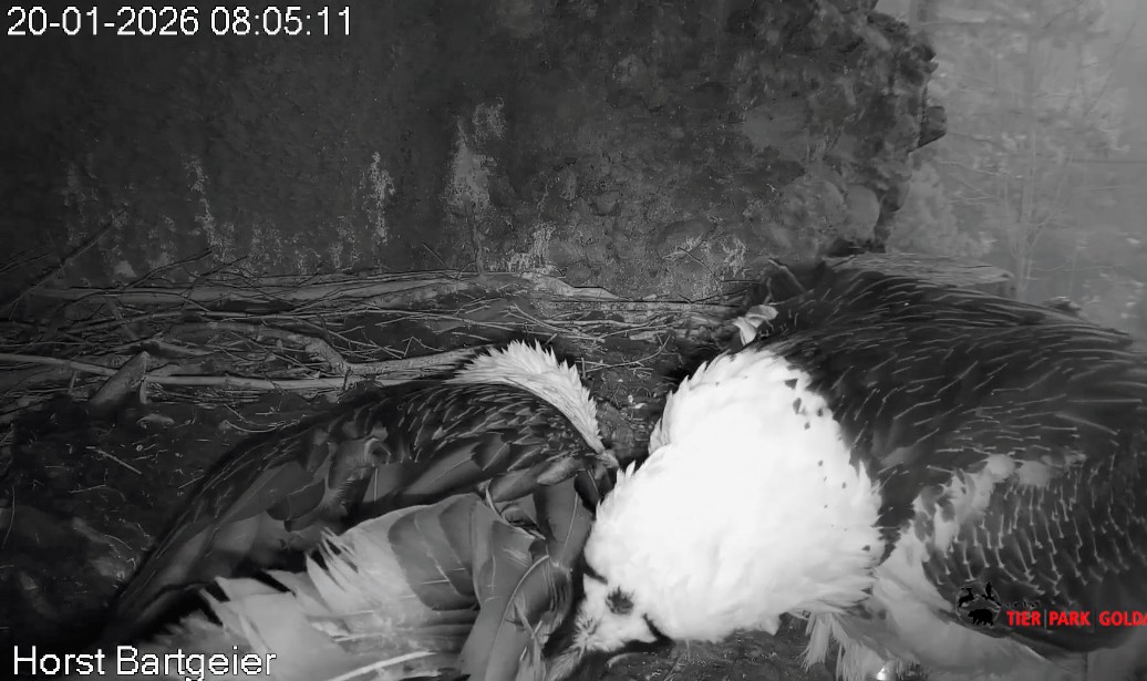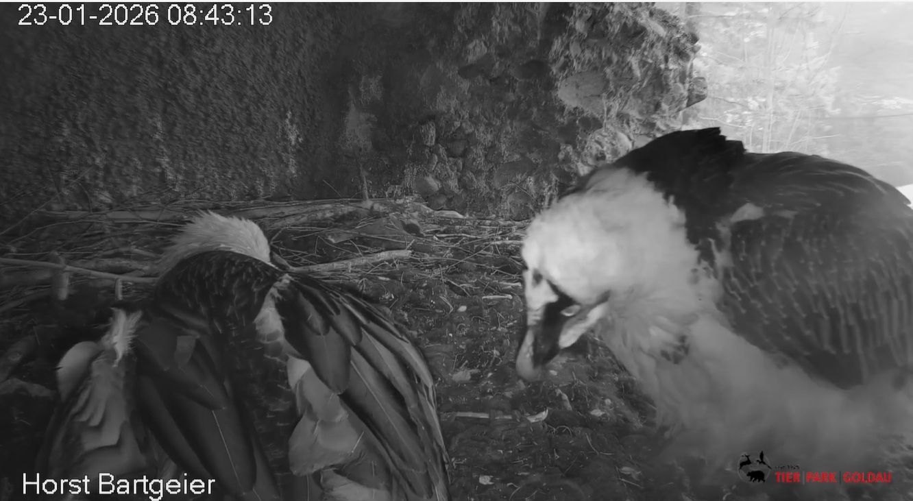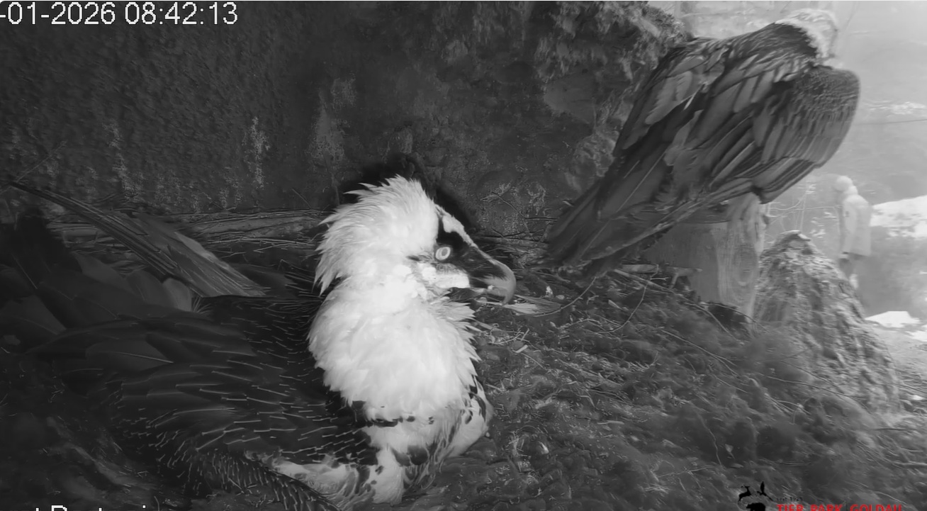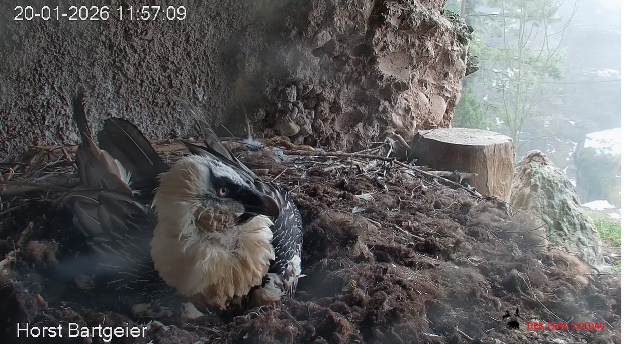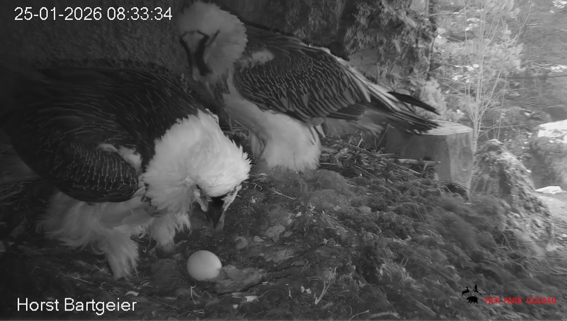 Heute Morgen wieder ein Moment erhöhter Aufmerksamkeit und Unruhe, als ein Pfleger vorbeiging. Mascha verließ dann den Ansitz, derweil Hans sich intensiv um das Ei gekümmert hat, trotz offensichtlicher Müdigkeit. ![]()