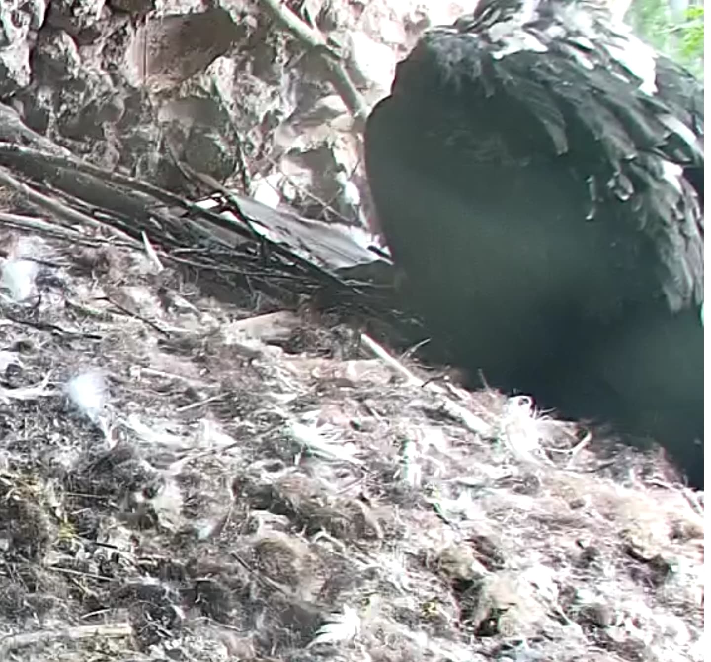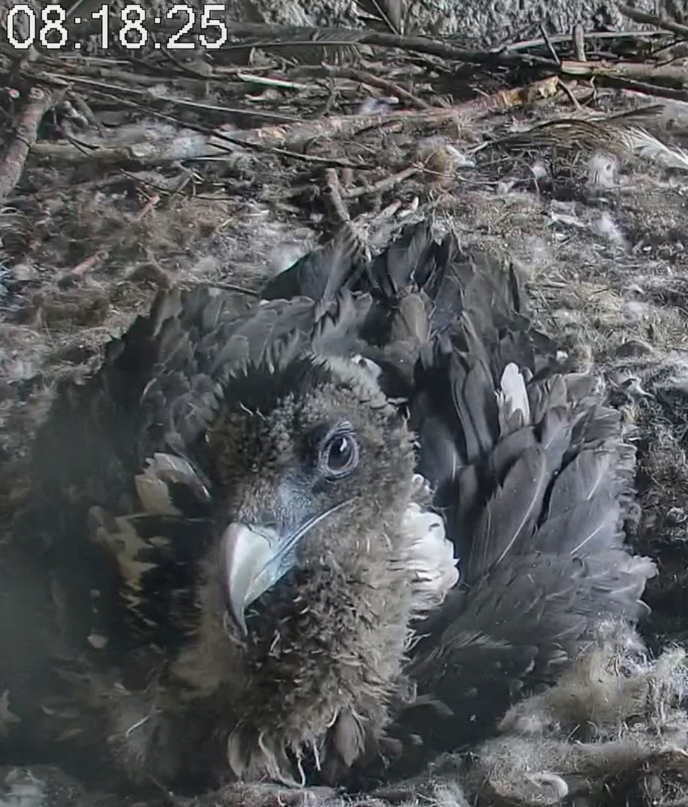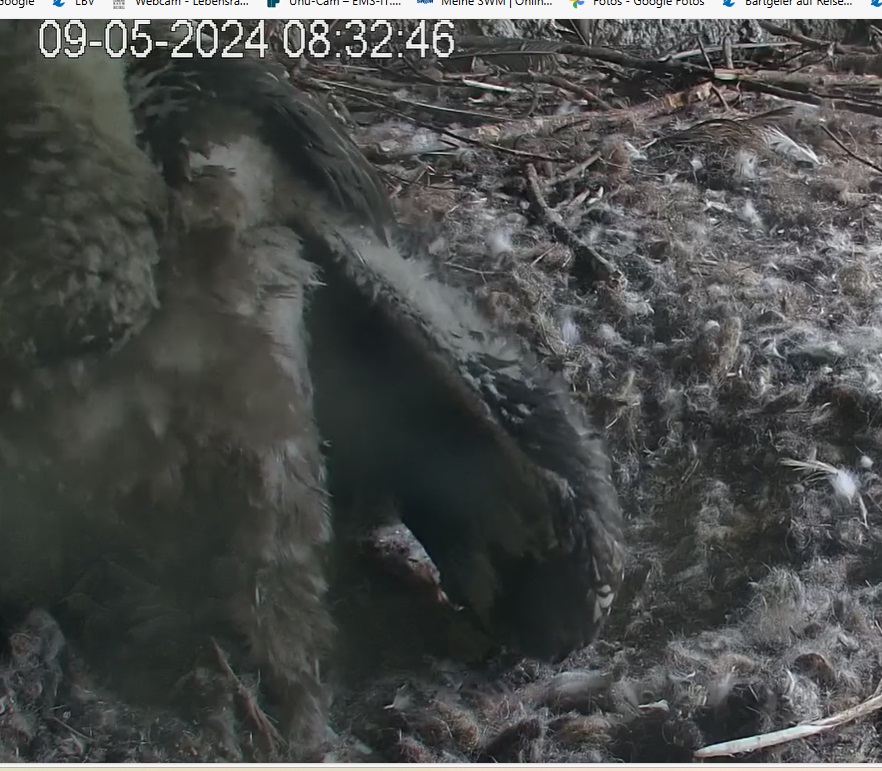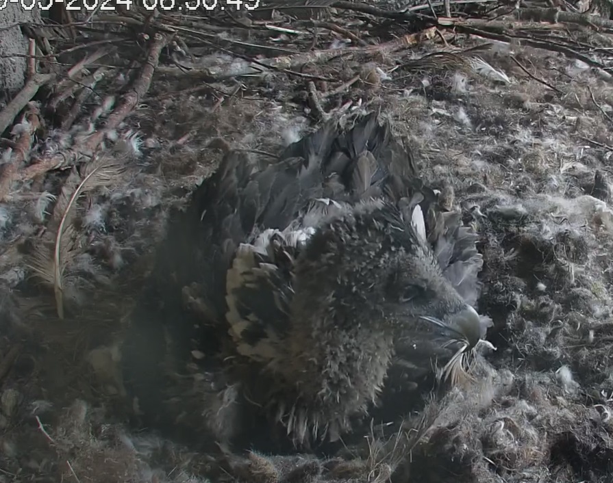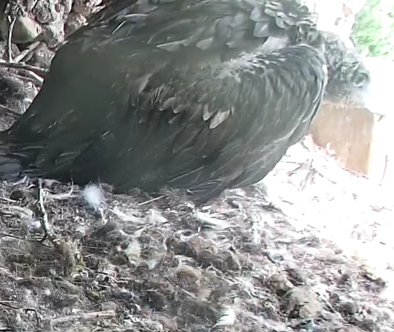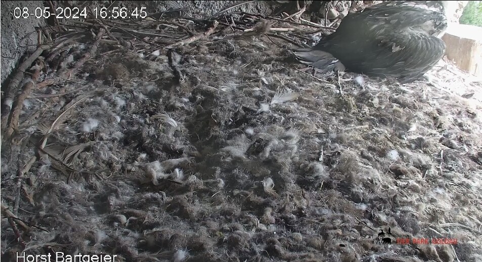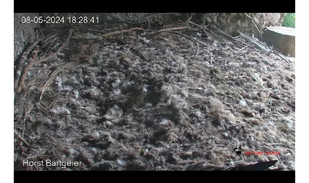 Heute morgen wird mit dem Schnabel geübt. Bartili zerlegt u.a. eine Feder unter den wachsamen Augen von Hans und marschiert Richtung Ansitz. Später räumt Hans seinen Platz und Bartili kann wieder in seine Schlafmulde, sich ausruhen.