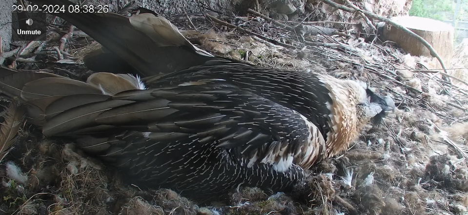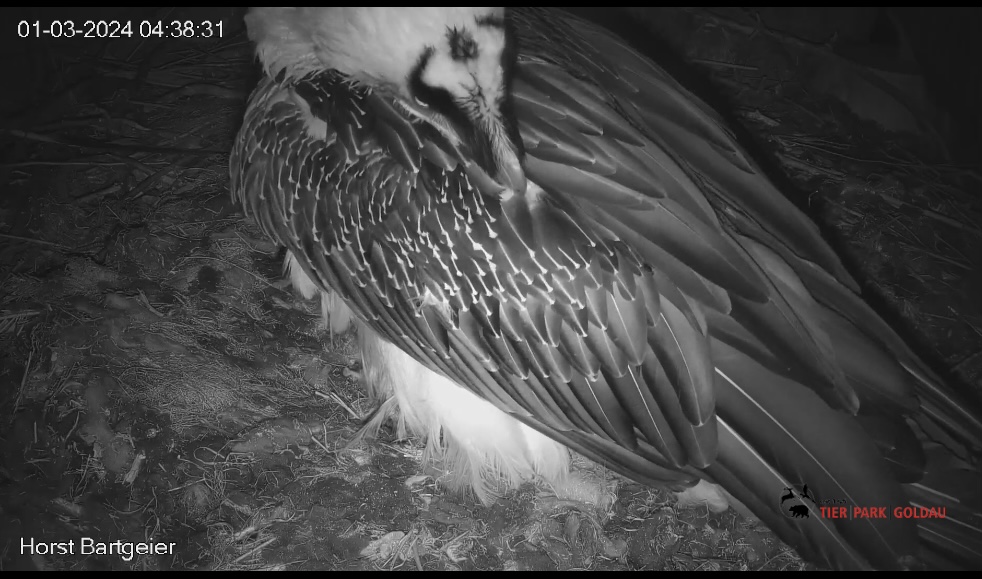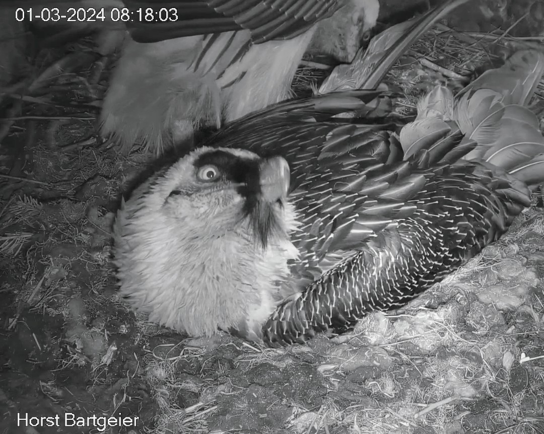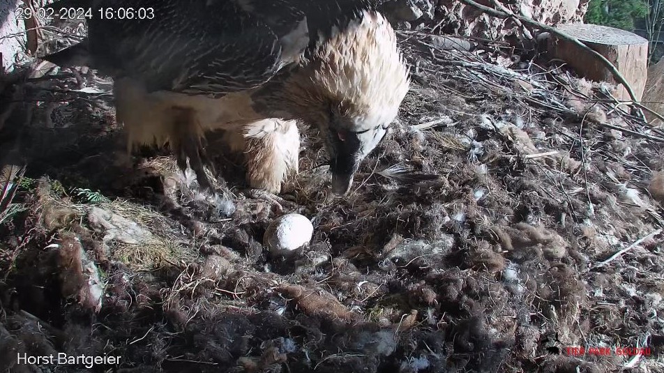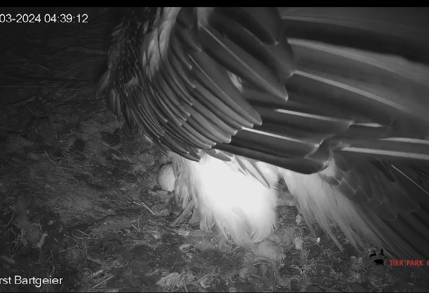 Bemerkenswert in dem Video finde ich auch, dass der kleine Bartgeier erst am 1.April geschlüpft ist und Mascha zu dem Zeitpunkt noch das Gipsei bebrütet hat. Sie hat das Küken akzeptiert, das ist immer ein kritischer Moment, der gut überwacht werden muss.
