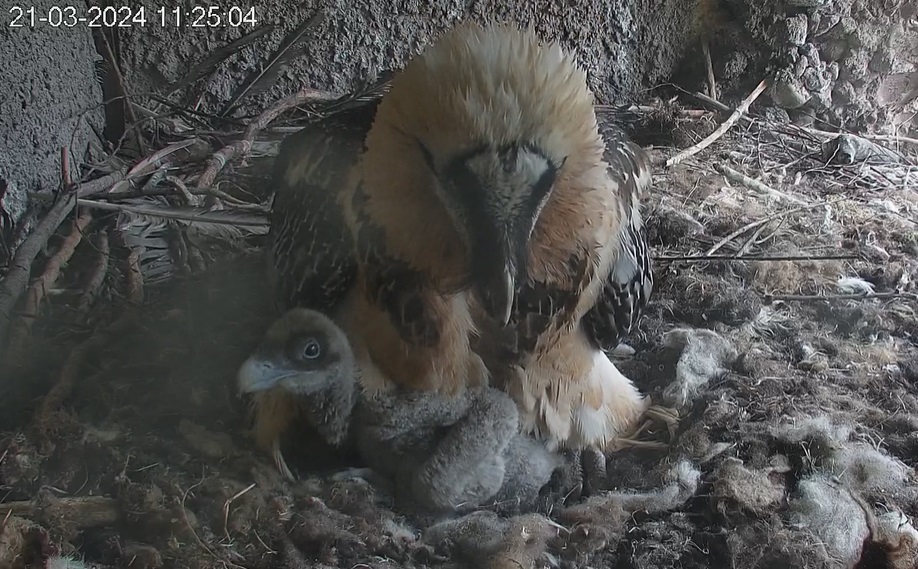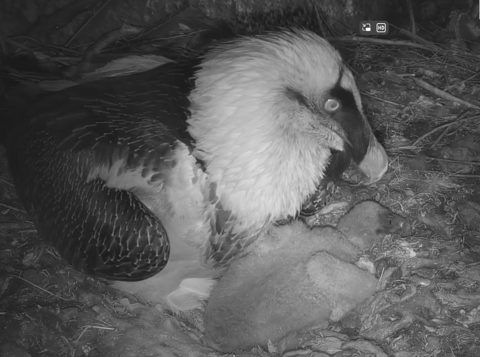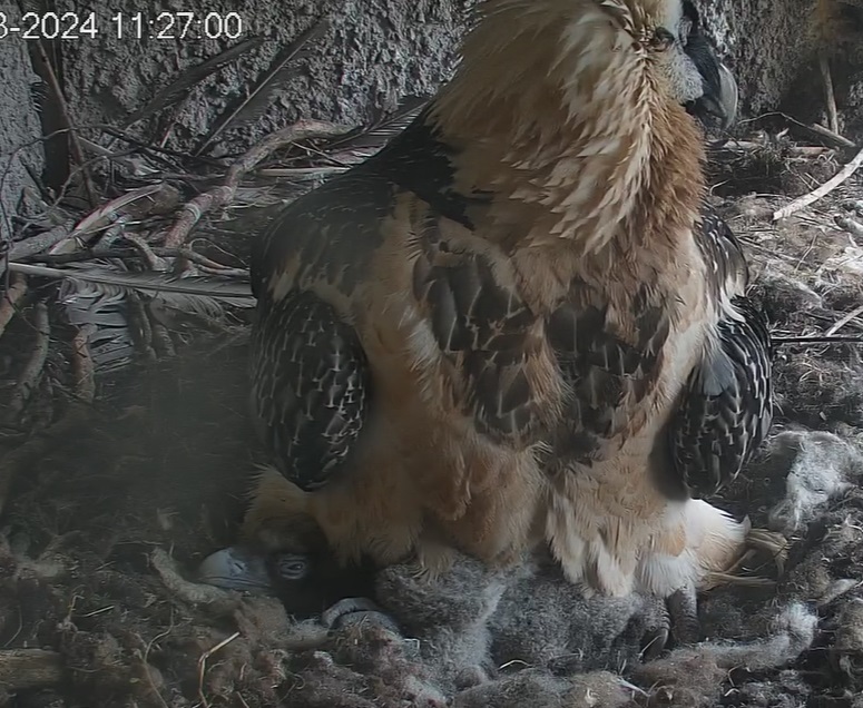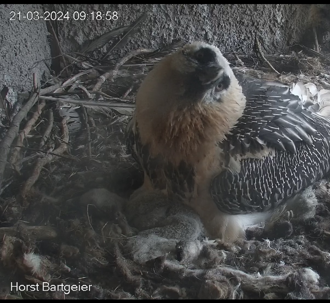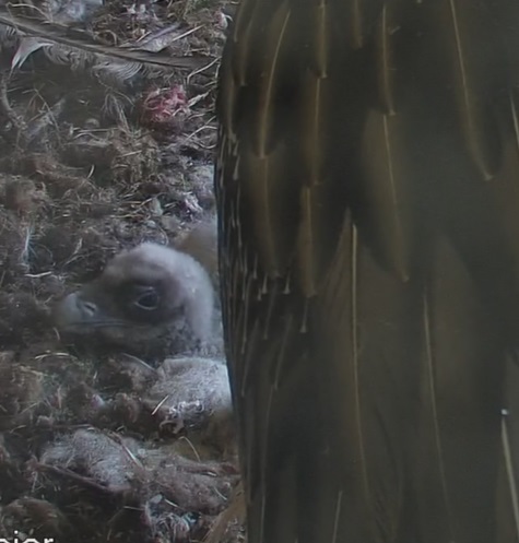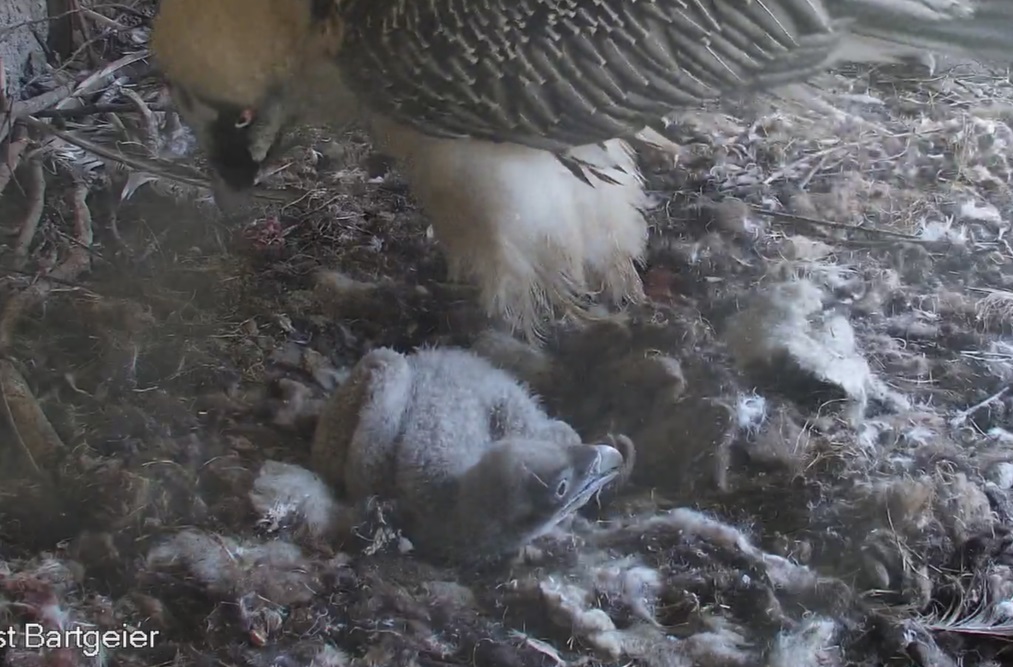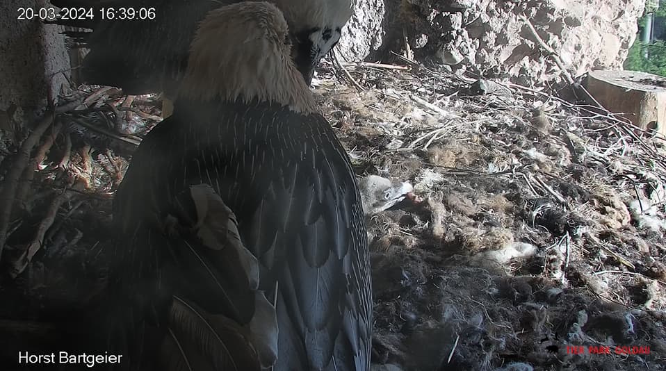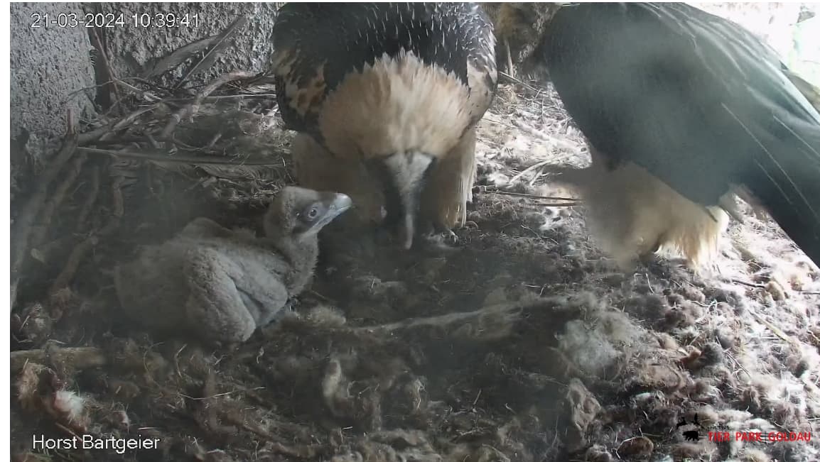 Endlich kann man einen Blick auf Junior werfen. Der Kleine wird dann sogar in die "Freiheit " entlassen, die er mit Flügeltraining und Nestbau bestens verbringt.