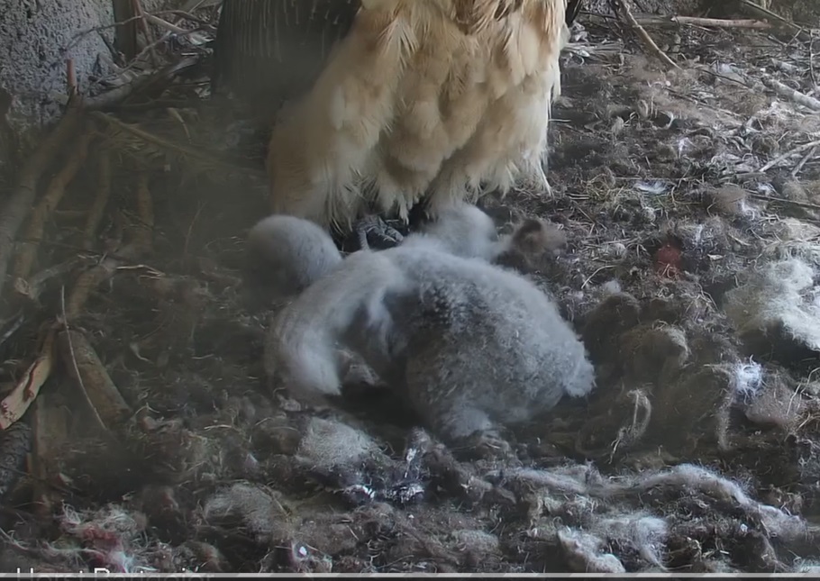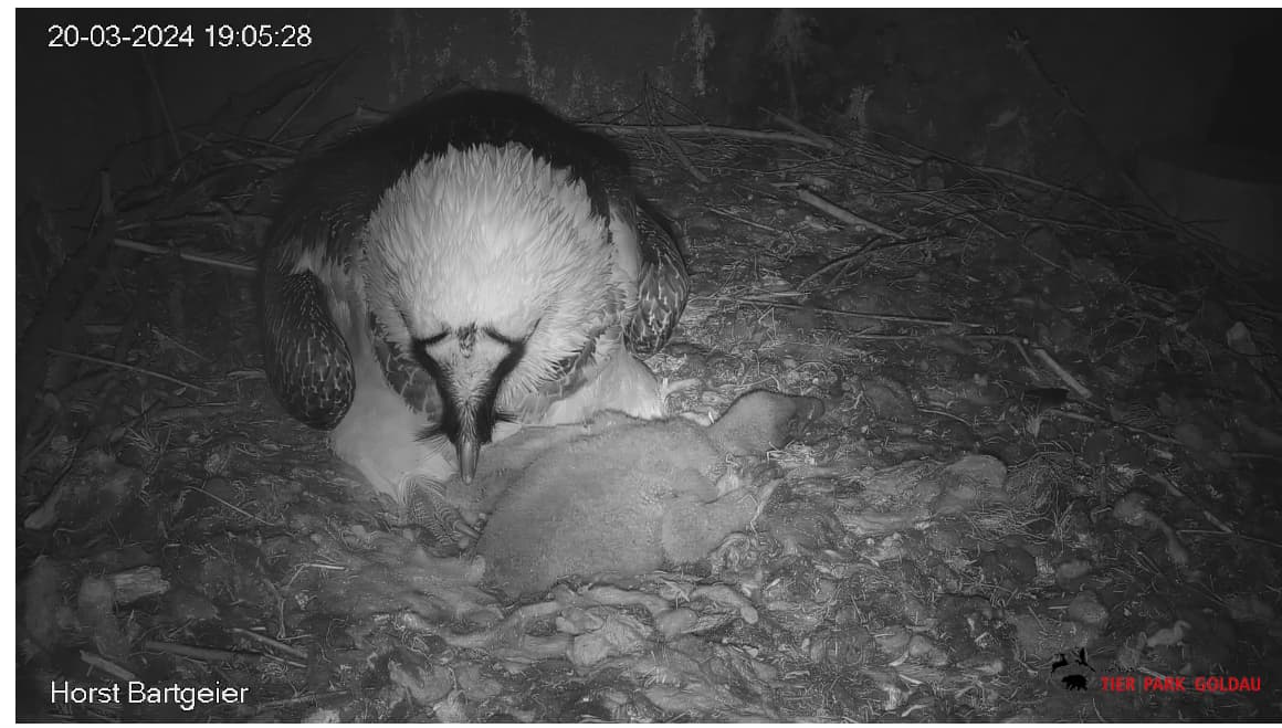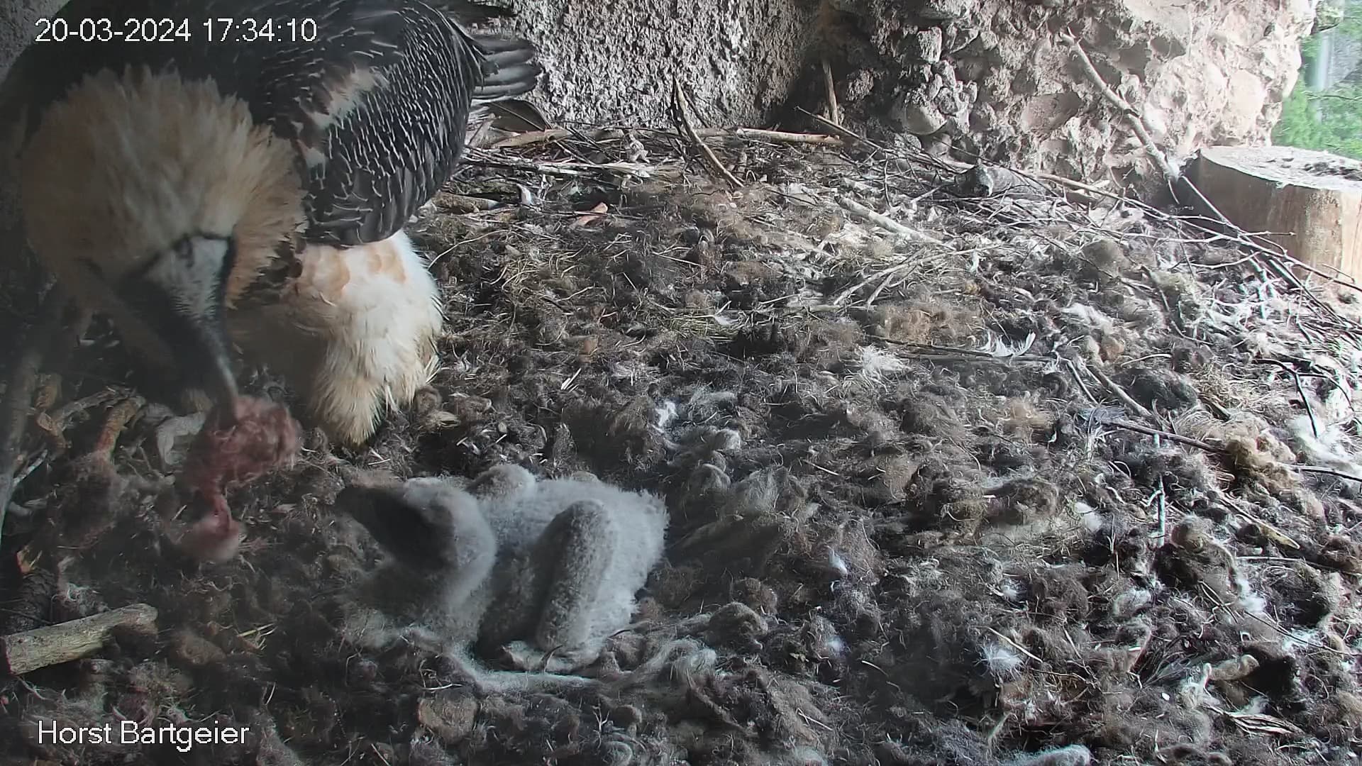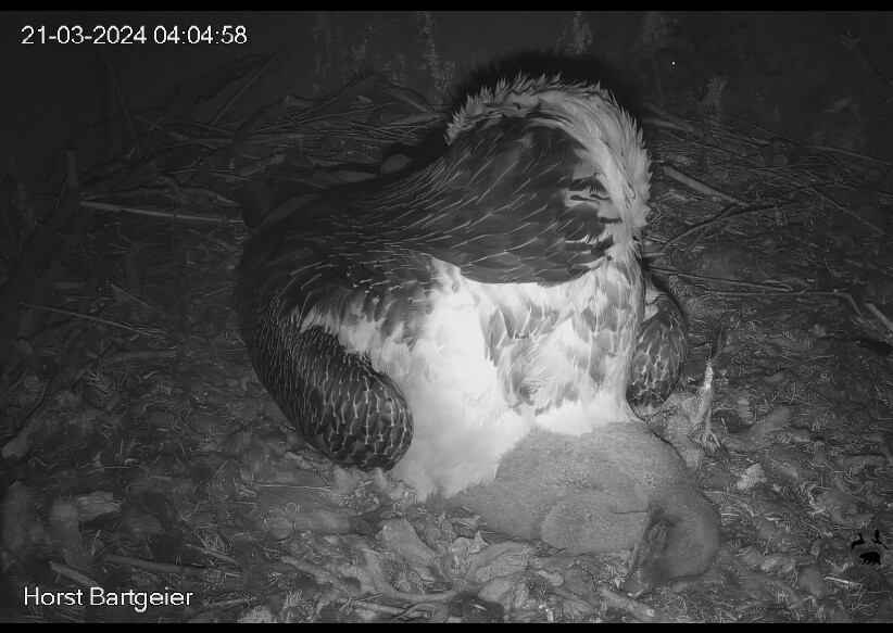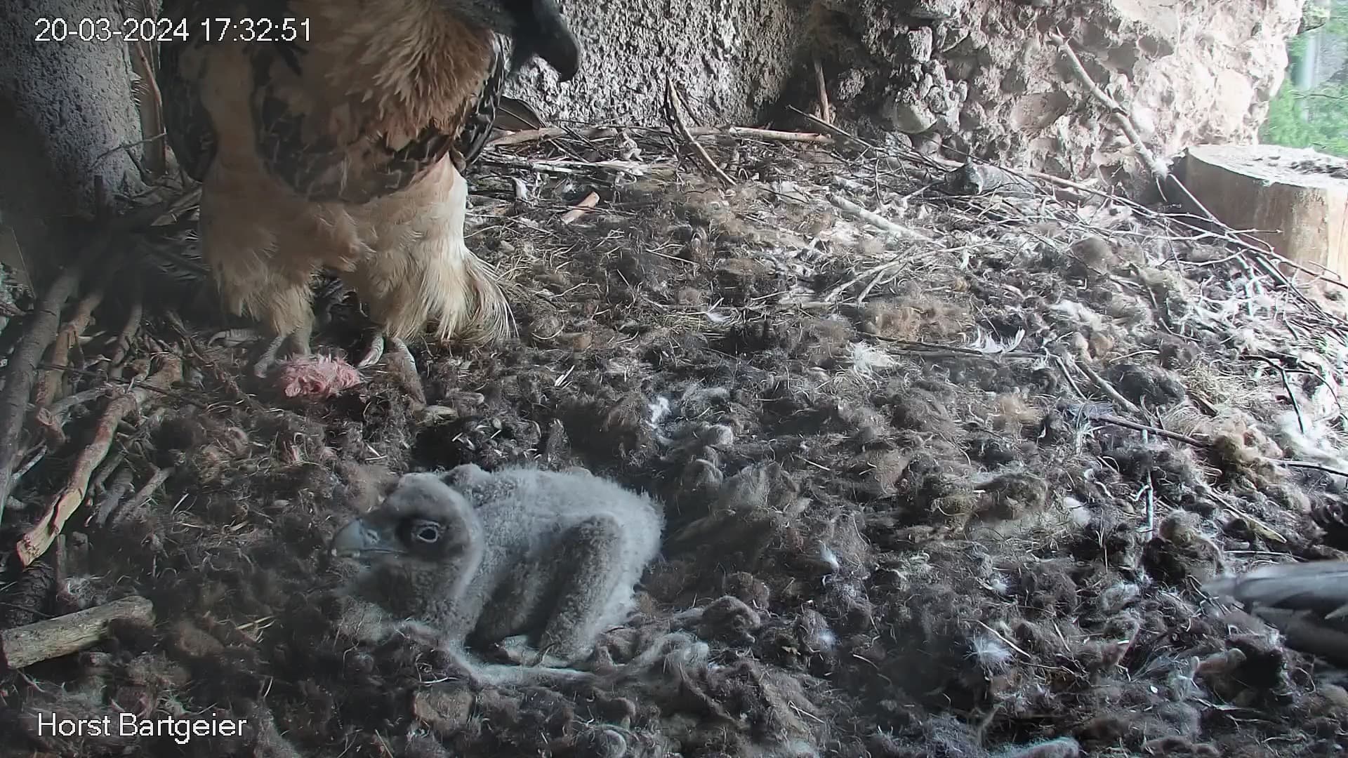 Endlich kann man einen Blick auf Junior werfen. Der Kleine wird dann sogar in die "Freiheit " entlassen, die er mit Flügeltraining und Nestbau bestens verbringt.
