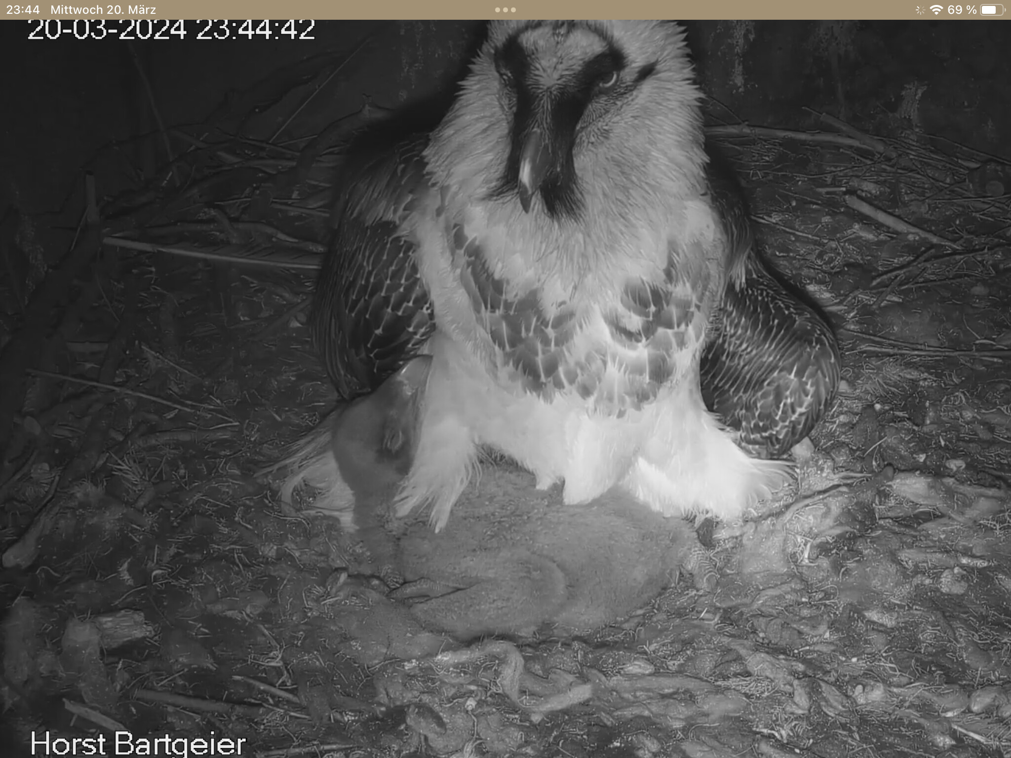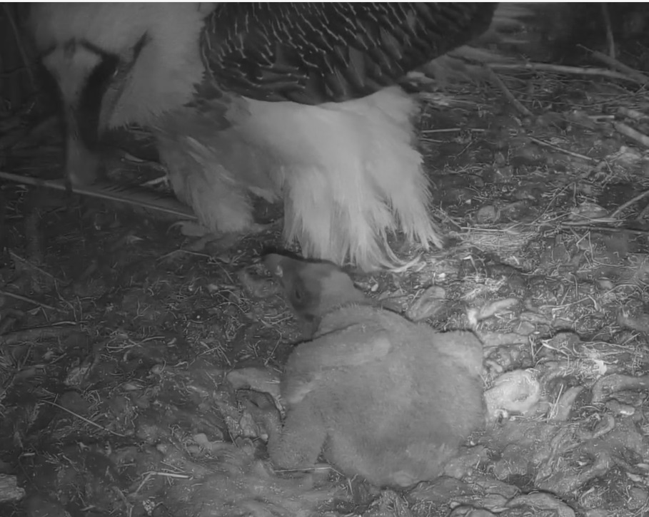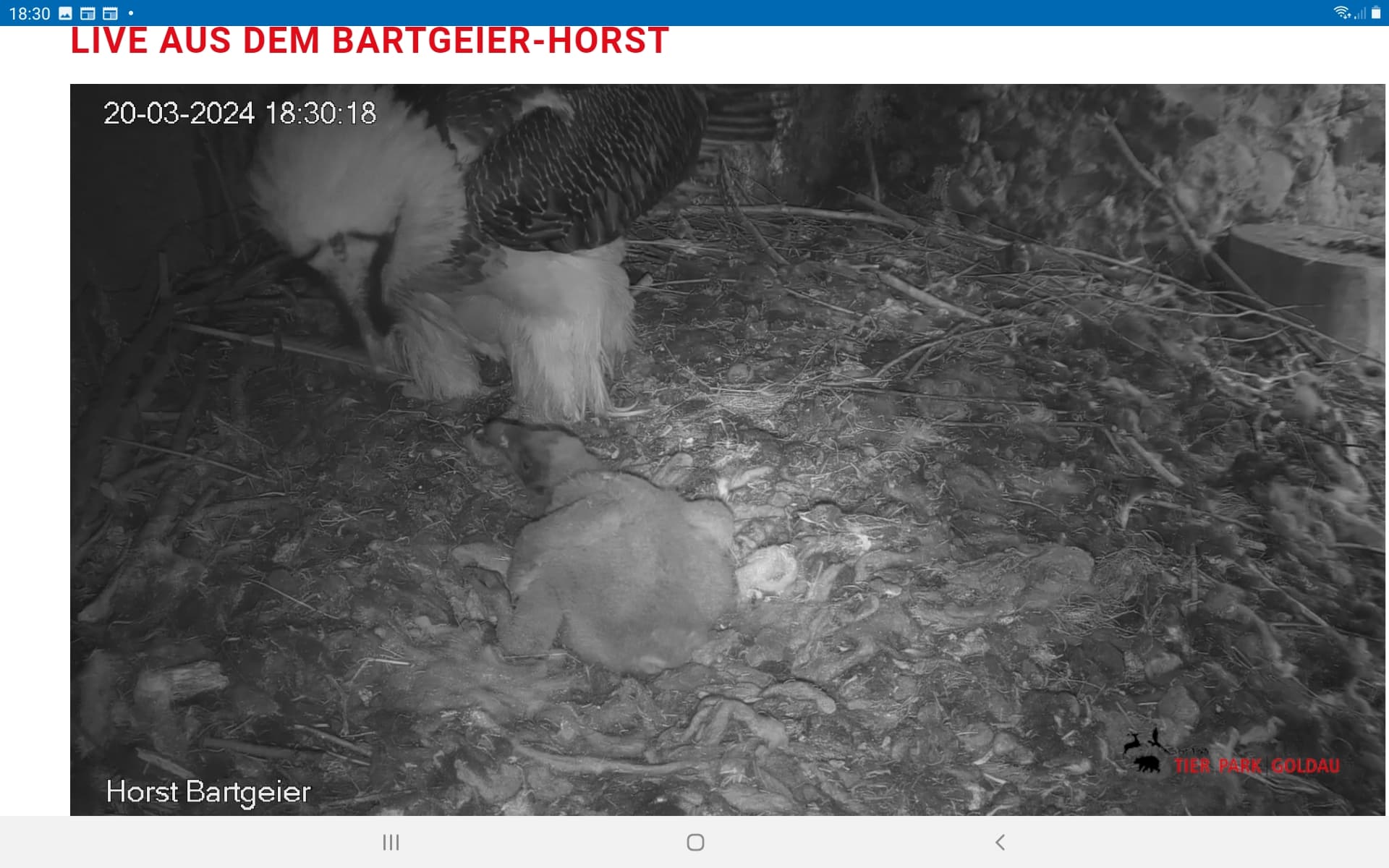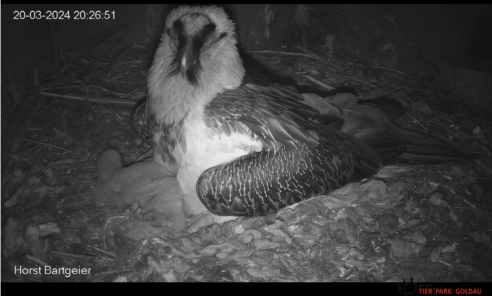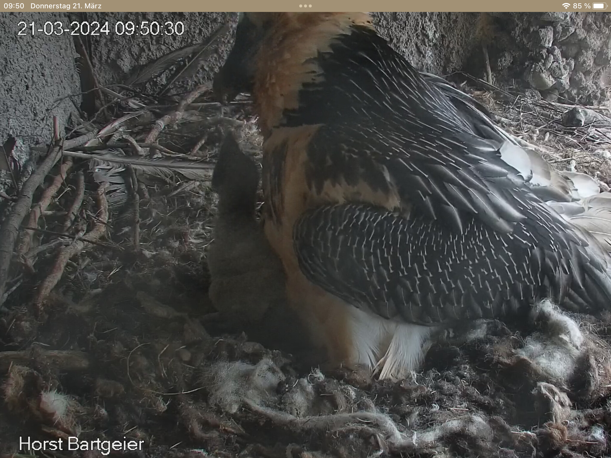 Endlich kann man einen Blick auf Junior werfen. Der Kleine wird dann sogar in die "Freiheit " entlassen, die er mit Flügeltraining und Nestbau bestens verbringt.