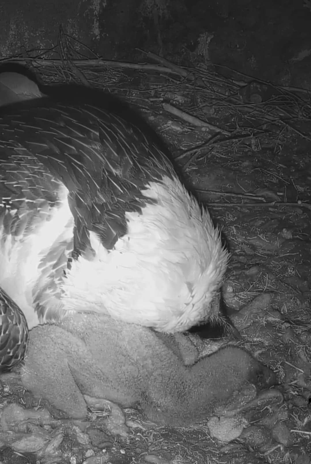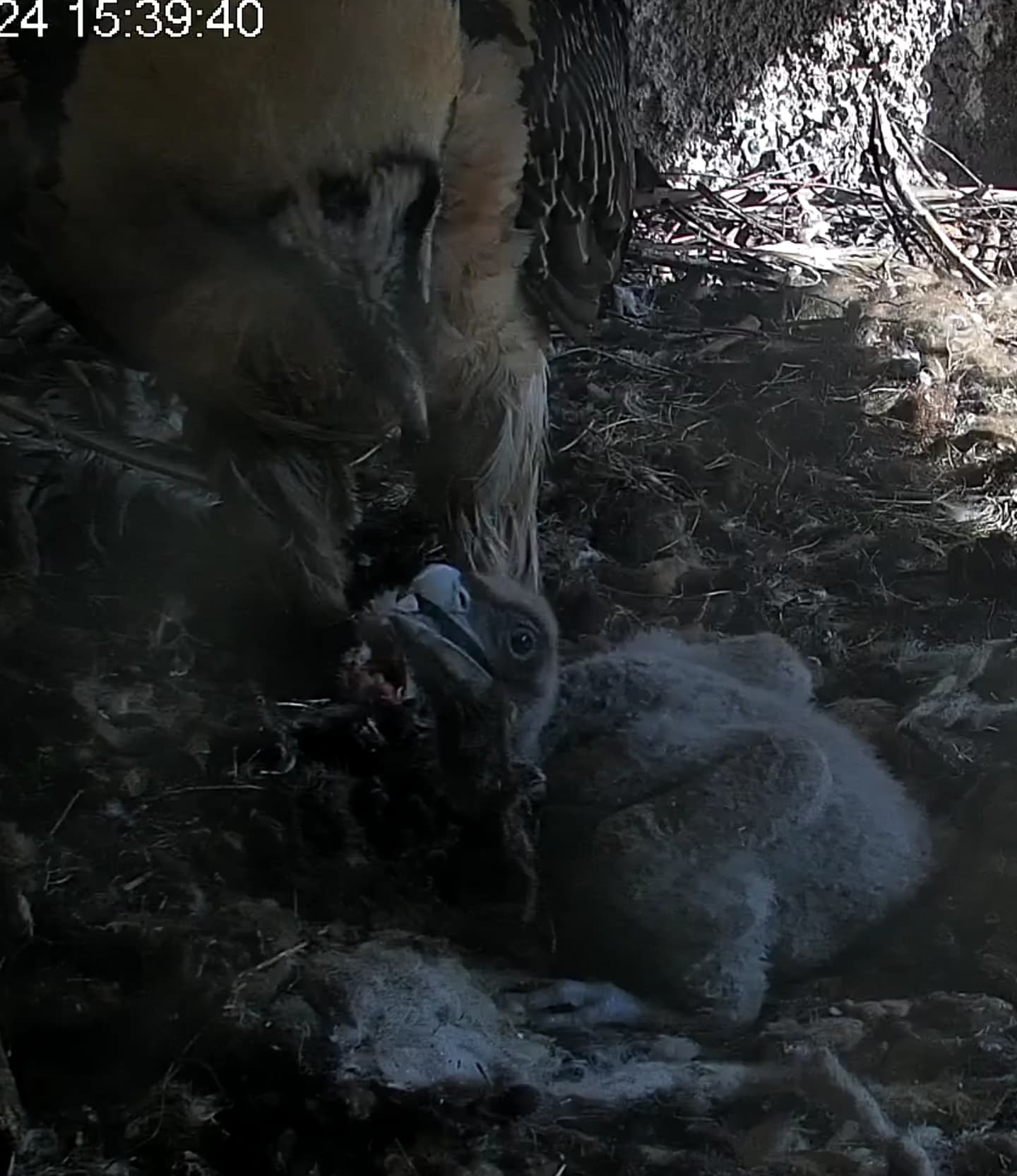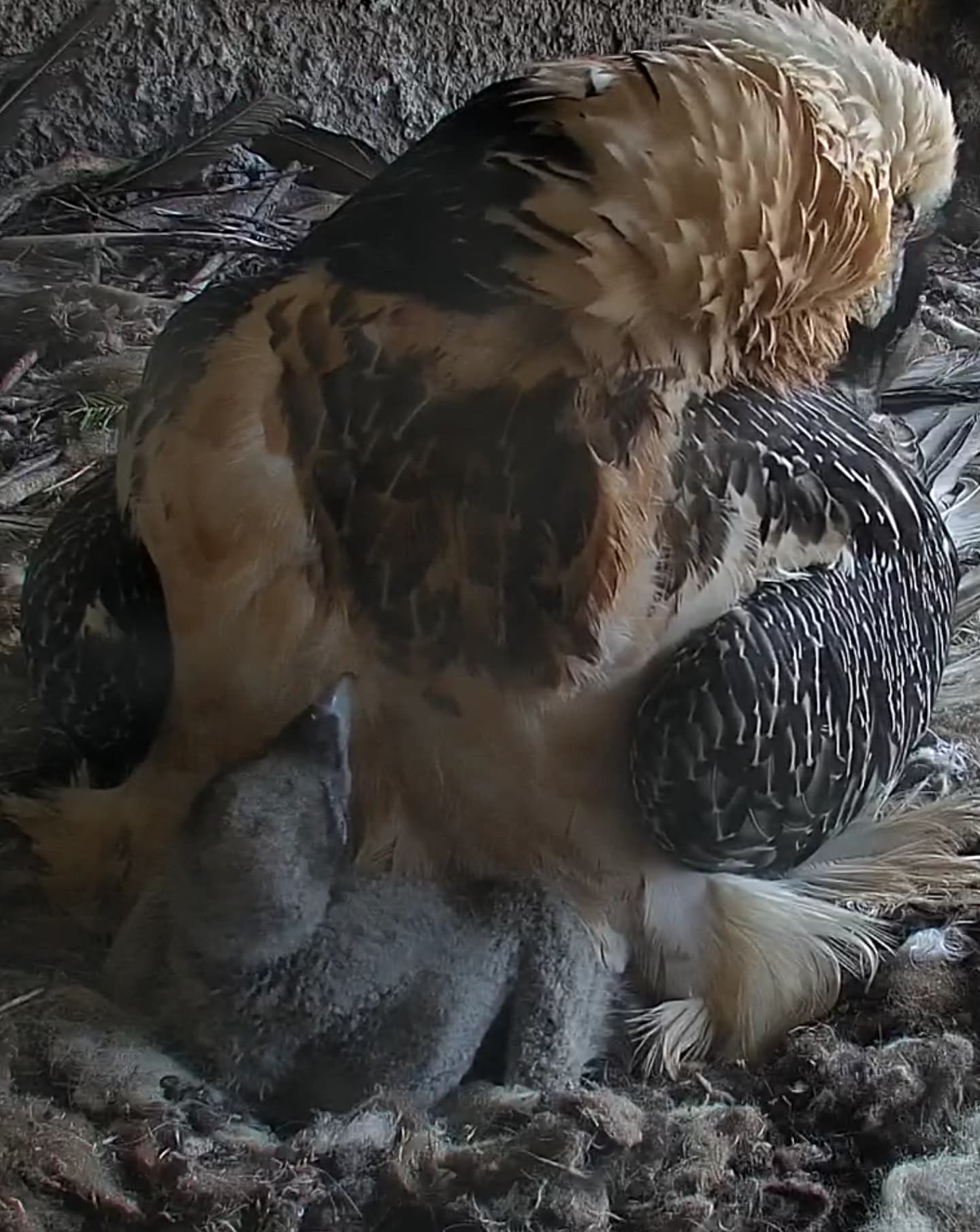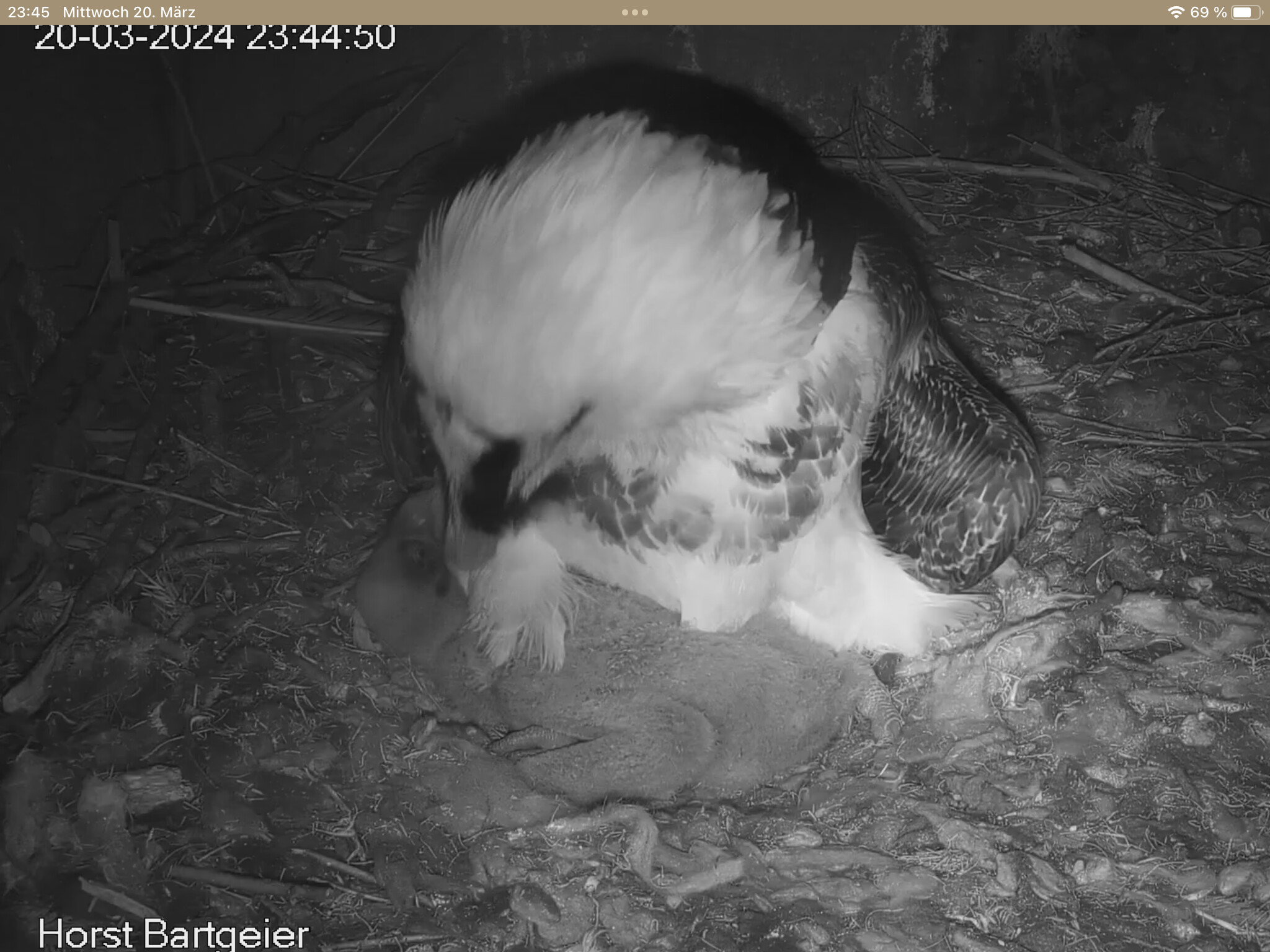 Endlich kann man einen Blick auf Junior werfen. Der Kleine wird dann sogar in die "Freiheit " entlassen, die er mit Flügeltraining und Nestbau bestens verbringt.