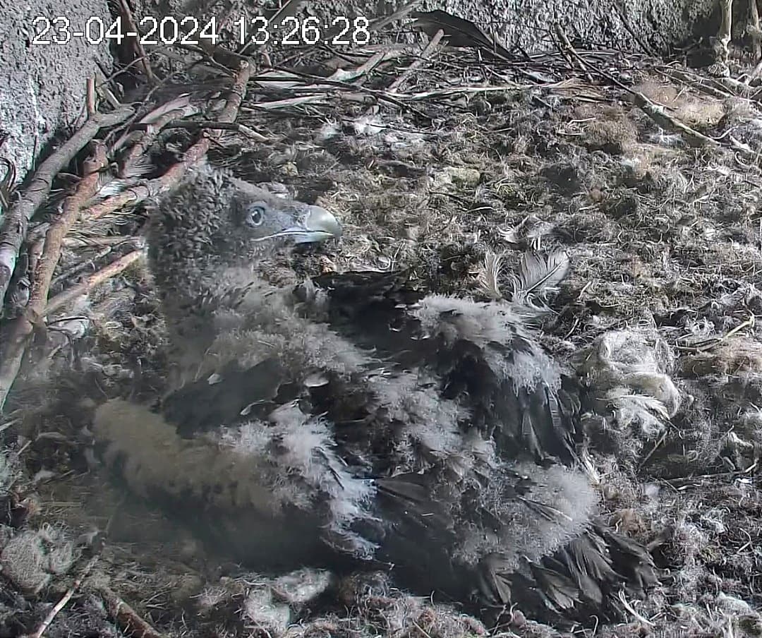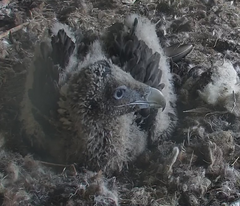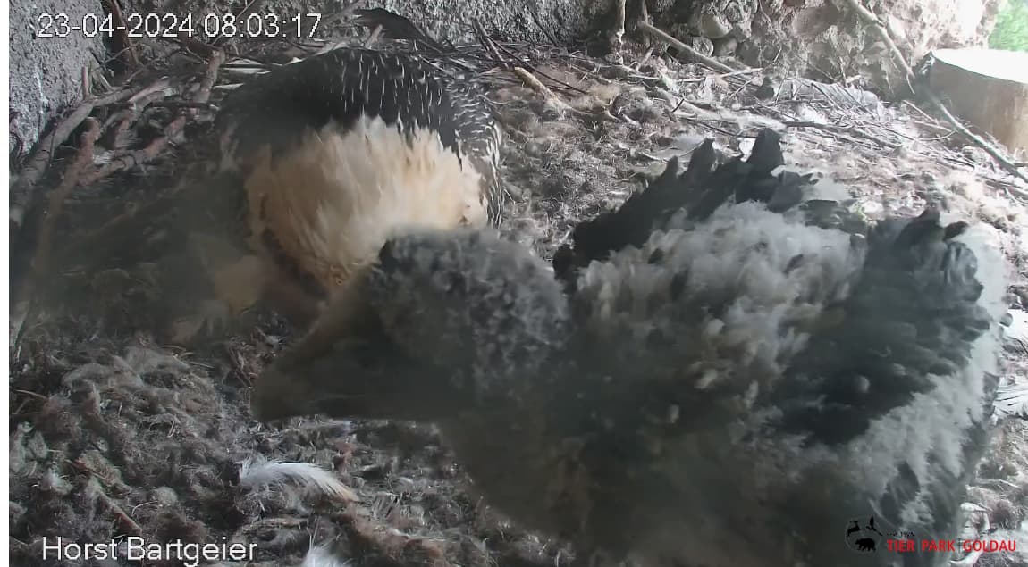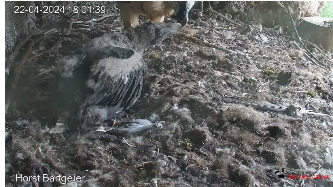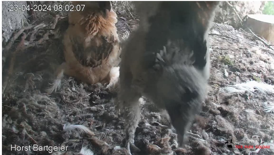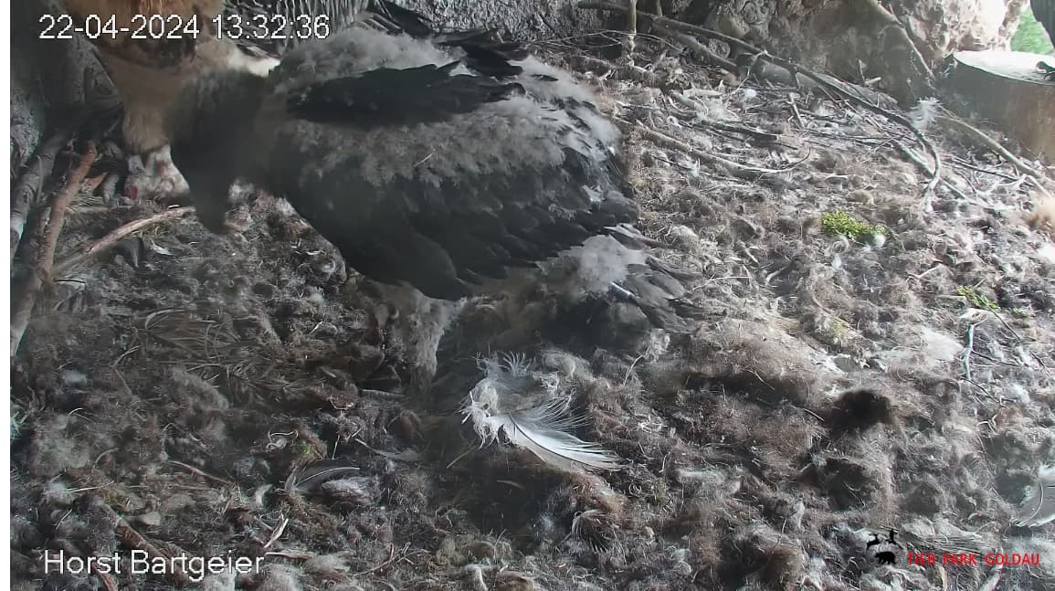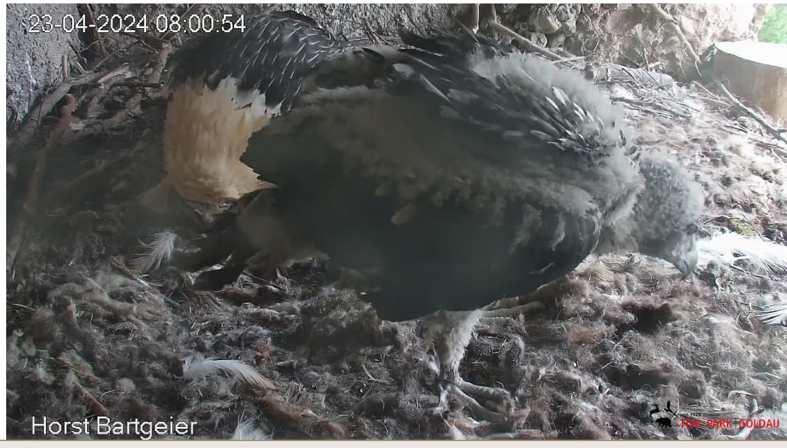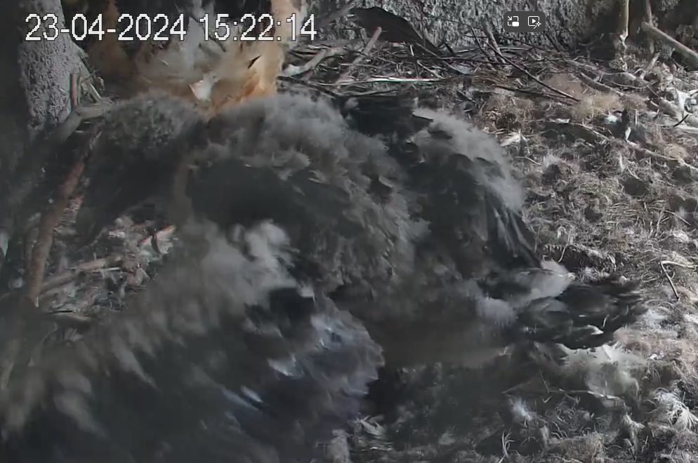 Ich konnte heute Nachmittag Goldie alleine im Horst beobachten. Sie stand, herrlich ihre Beinchen „befedert“. Dann ein paar Schritte nach vorne - plumps auf den Popo - dann hat sie sich ganz hingelegt. Laufen lernen ist ja so schwer, noch dazu ohne ausgleichende Schwanzfedern. ![]()