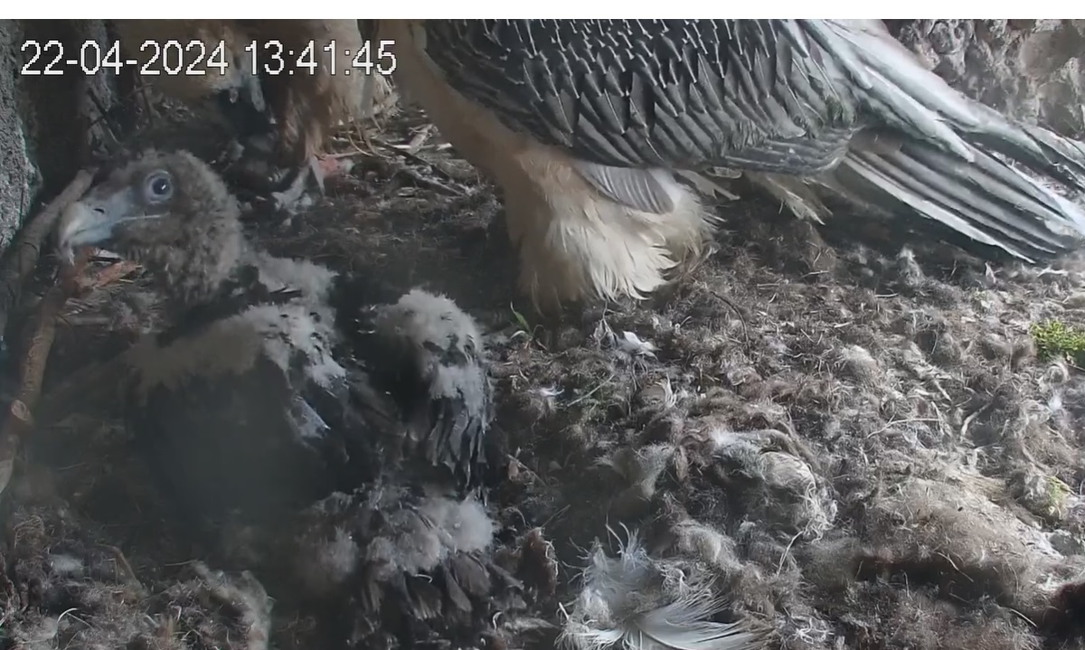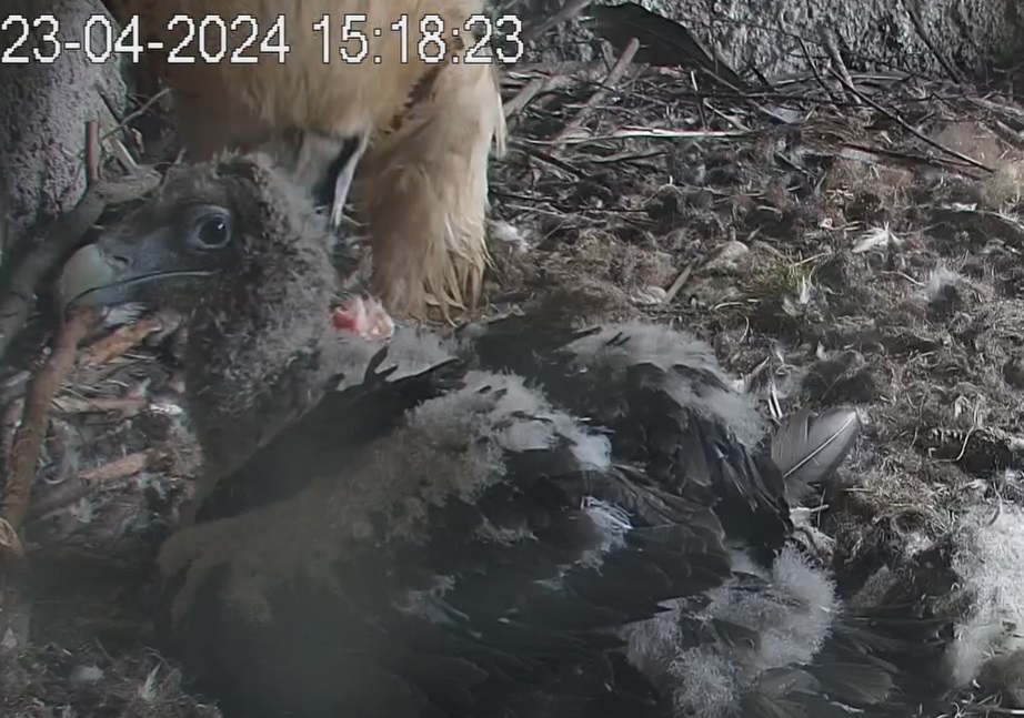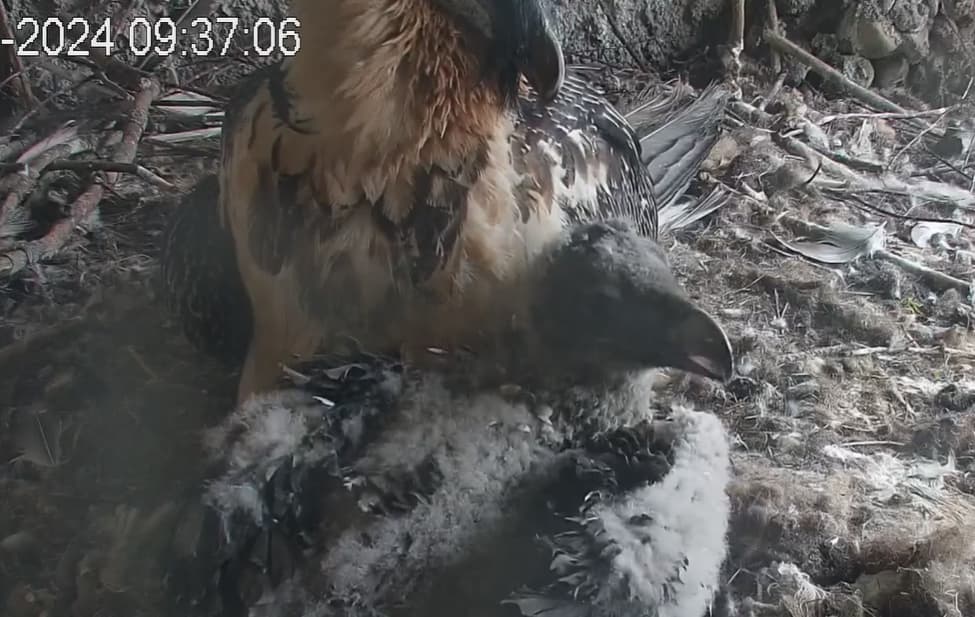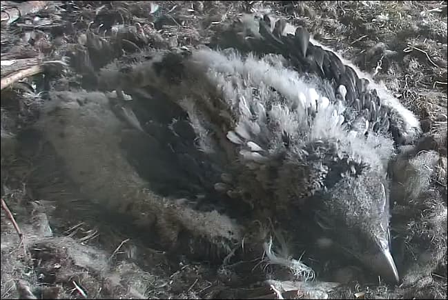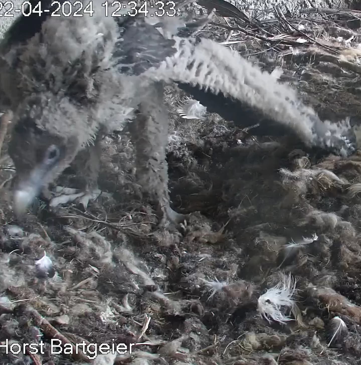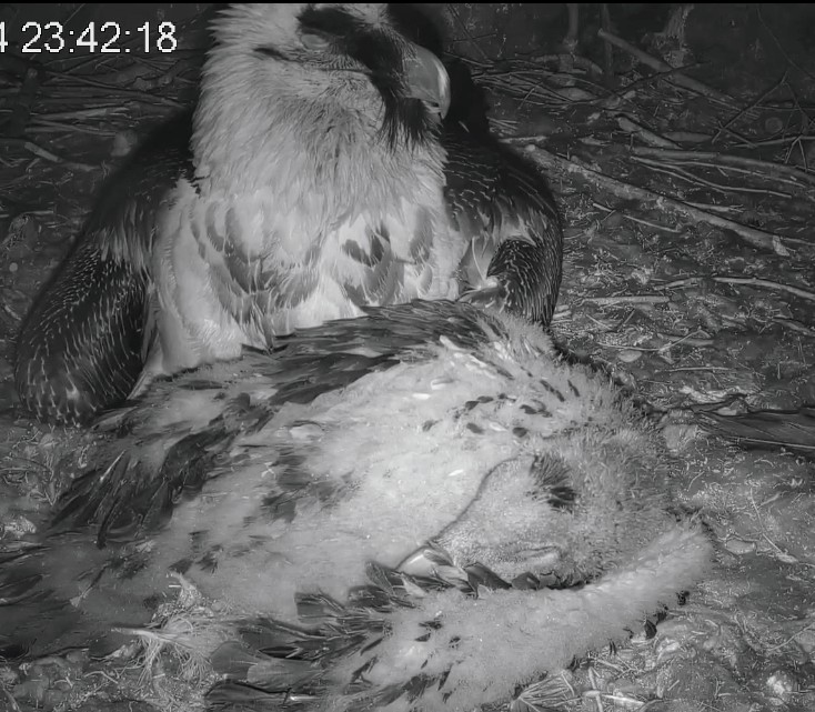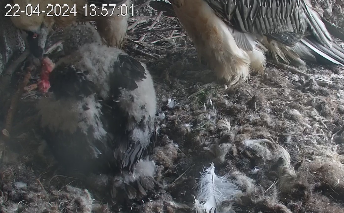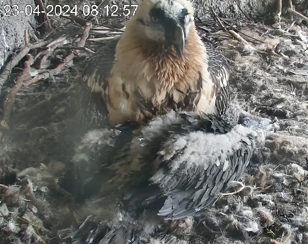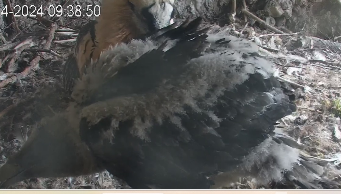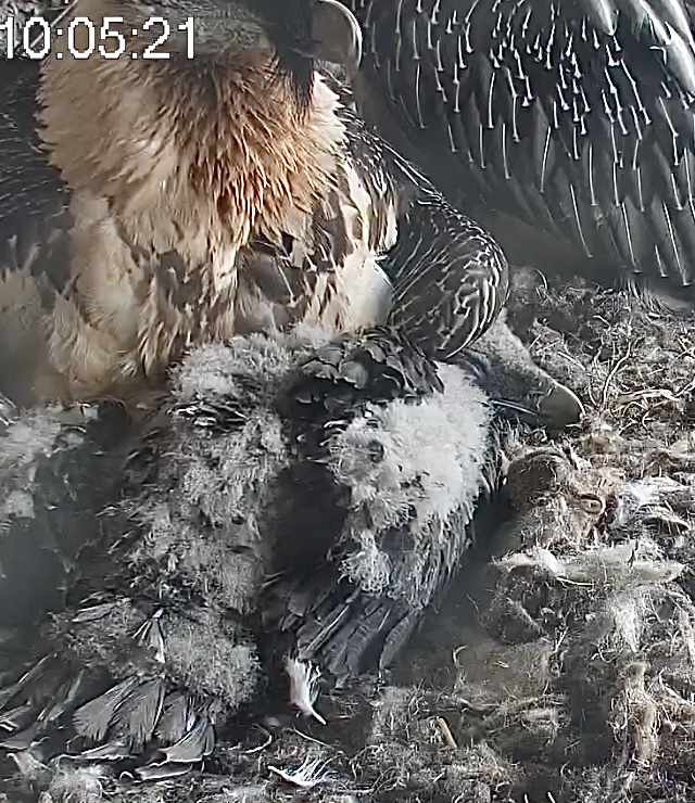 Ich konnte heute Nachmittag Goldie alleine im Horst beobachten. Sie stand, herrlich ihre Beinchen „befedert“. Dann ein paar Schritte nach vorne - plumps auf den Popo - dann hat sie sich ganz hingelegt. Laufen lernen ist ja so schwer, noch dazu ohne ausgleichende Schwanzfedern. ![]()