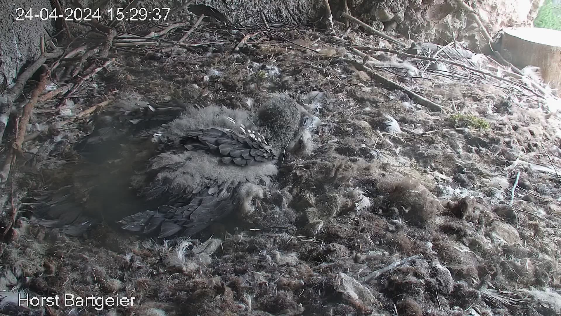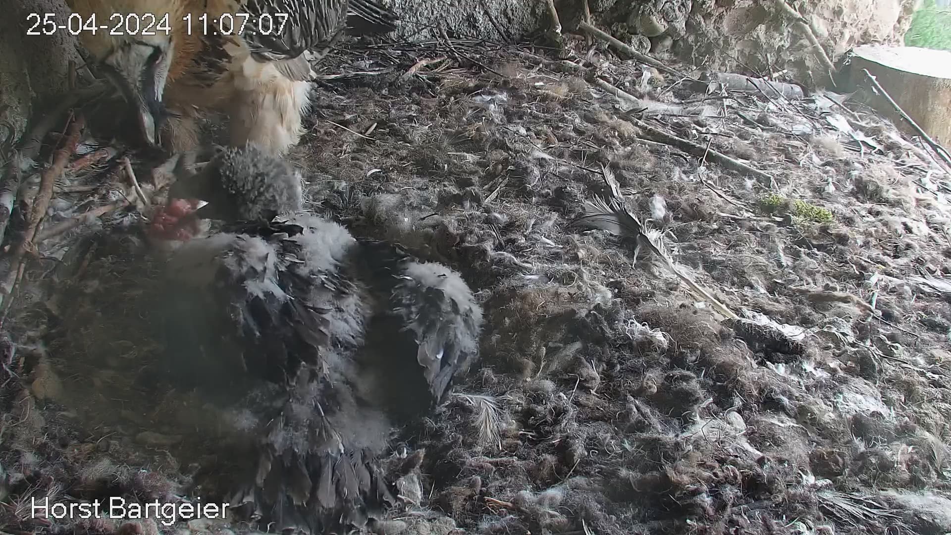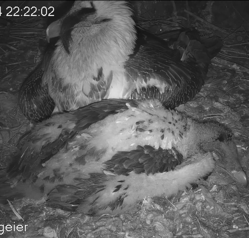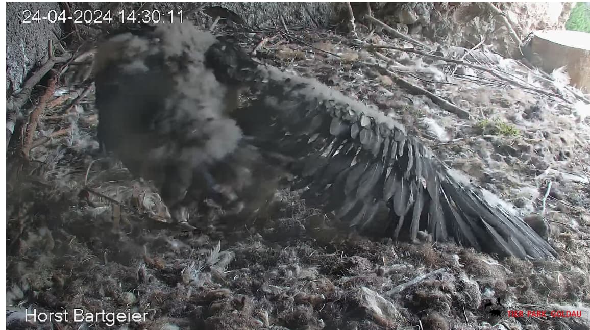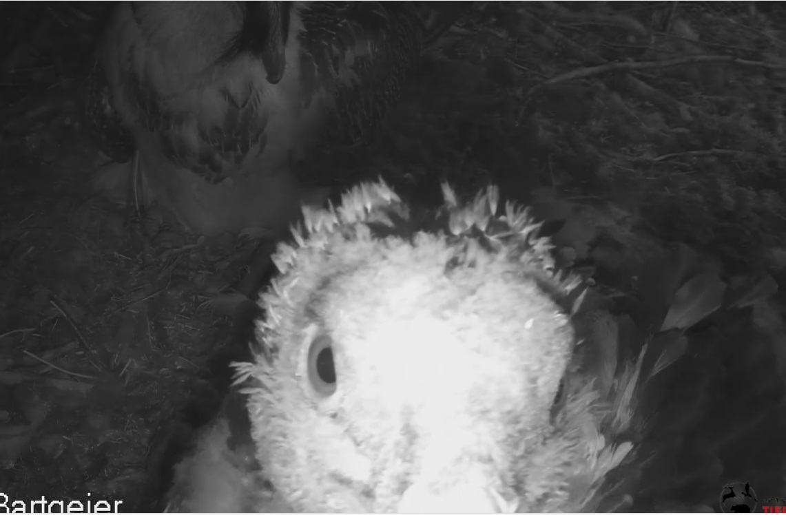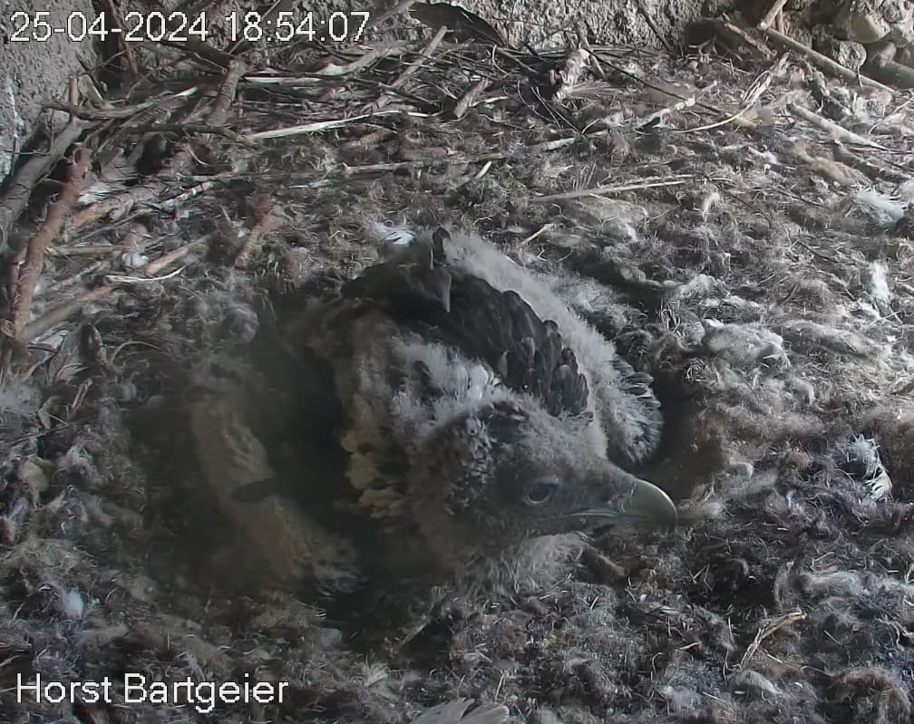 Die endgültige Geschlechtsbestimmung wird soweit ich weiß, erst im Alter von drei Monaten durch einen Gentest gemacht. Dies geschieht kurz vor der Auswilderung oder Aufnahme in die Zuchtstation und wird auch dann erst veröffentlicht. Eine vorherige DNA-Analyse ist wahrscheinlich notwendig für die Planung des Zuchtprogramms und ist daher „nicht abgeschlossen“. Der kleine Bartgeier war vier Wochen alt, als ihm Blut abgezapft wurde, wir konnten dies durch die Kamera teilweise mitverfolgen. Zu dem Zeitpunkt lief bei mir der Live-Stream sowie in der Vergangenheit einwandfrei, seit ein paar Wochen nur noch mit Standbild und Buffering.