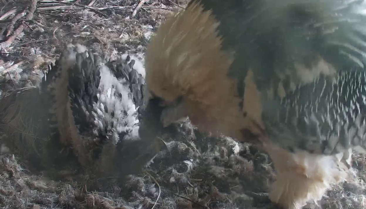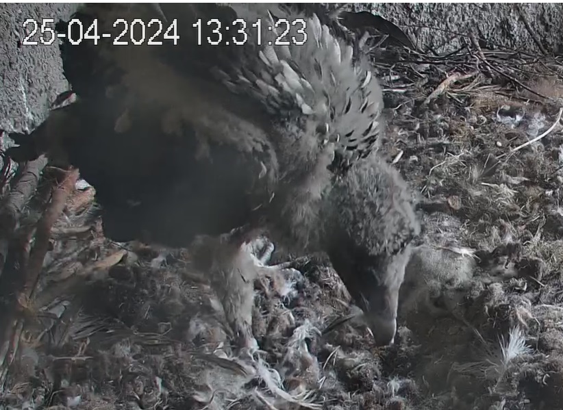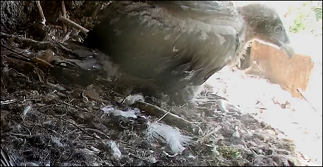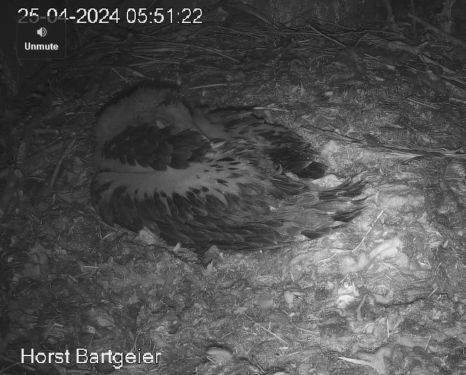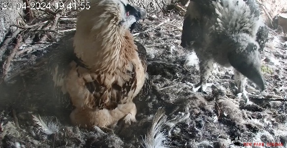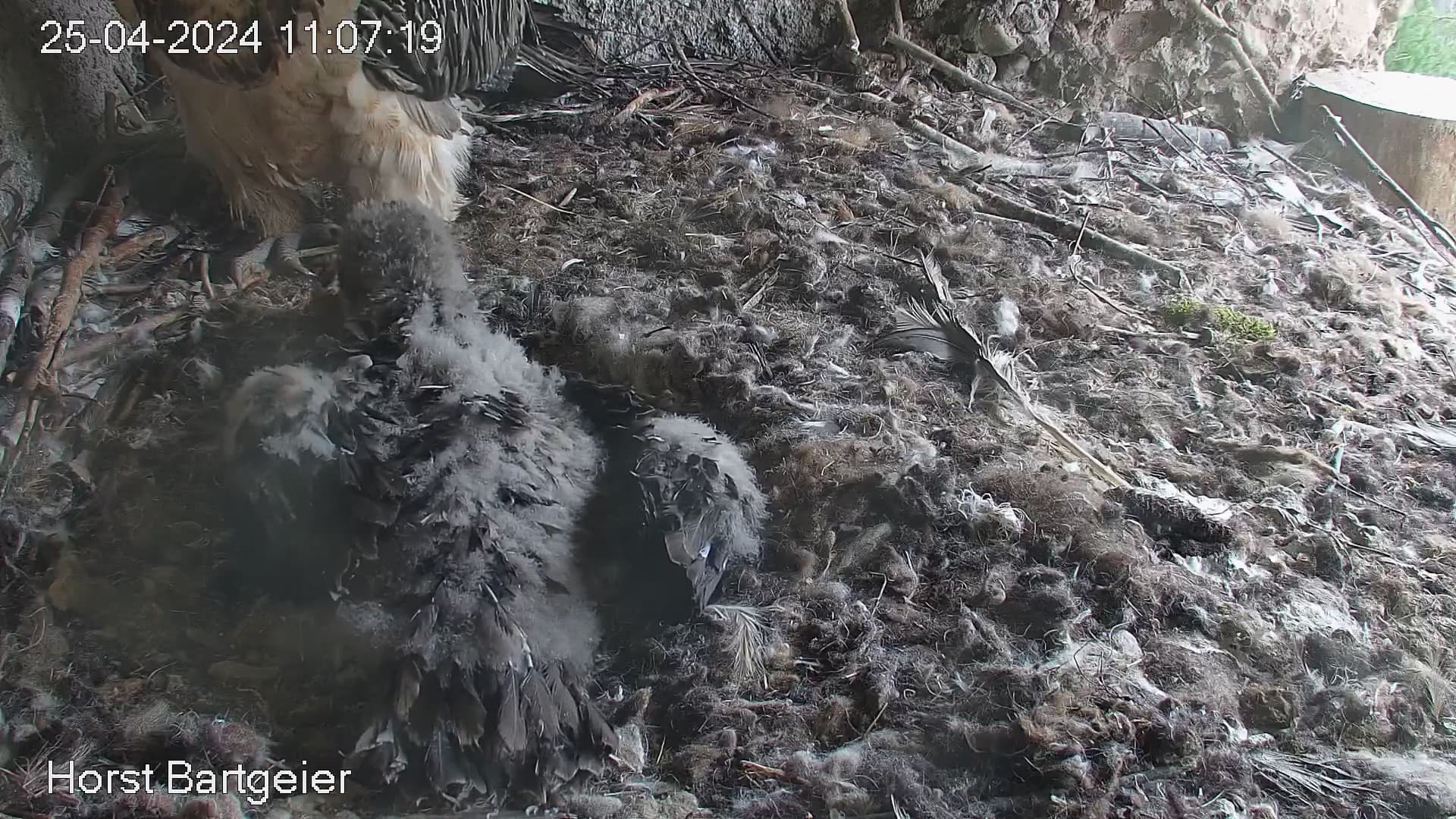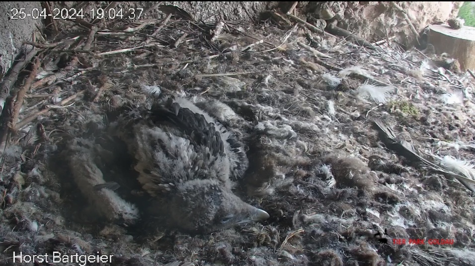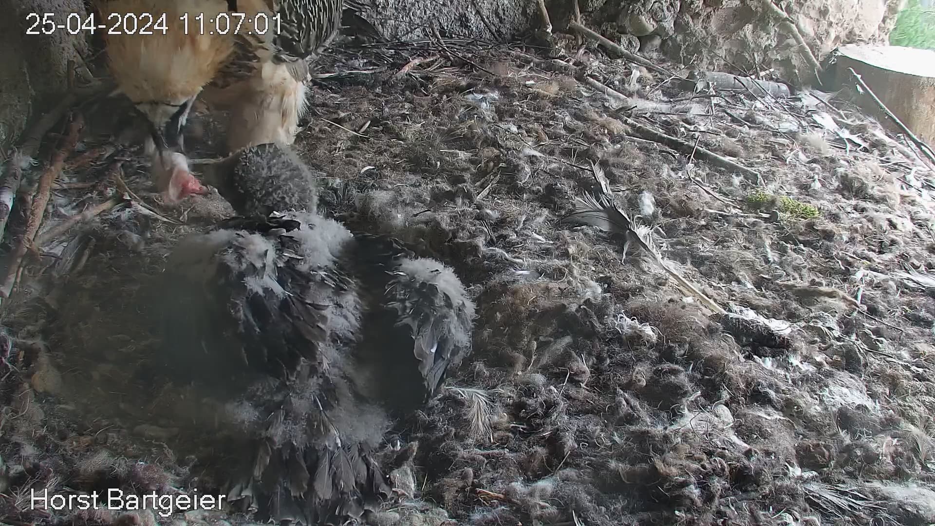 Die endgültige Geschlechtsbestimmung wird soweit ich weiß, erst im Alter von drei Monaten durch einen Gentest gemacht. Dies geschieht kurz vor der Auswilderung oder Aufnahme in die Zuchtstation und wird auch dann erst veröffentlicht. Eine vorherige DNA-Analyse ist wahrscheinlich notwendig für die Planung des Zuchtprogramms und ist daher „nicht abgeschlossen“. Der kleine Bartgeier war vier Wochen alt, als ihm Blut abgezapft wurde, wir konnten dies durch die Kamera teilweise mitverfolgen. Zu dem Zeitpunkt lief bei mir der Live-Stream sowie in der Vergangenheit einwandfrei, seit ein paar Wochen nur noch mit Standbild und Buffering.