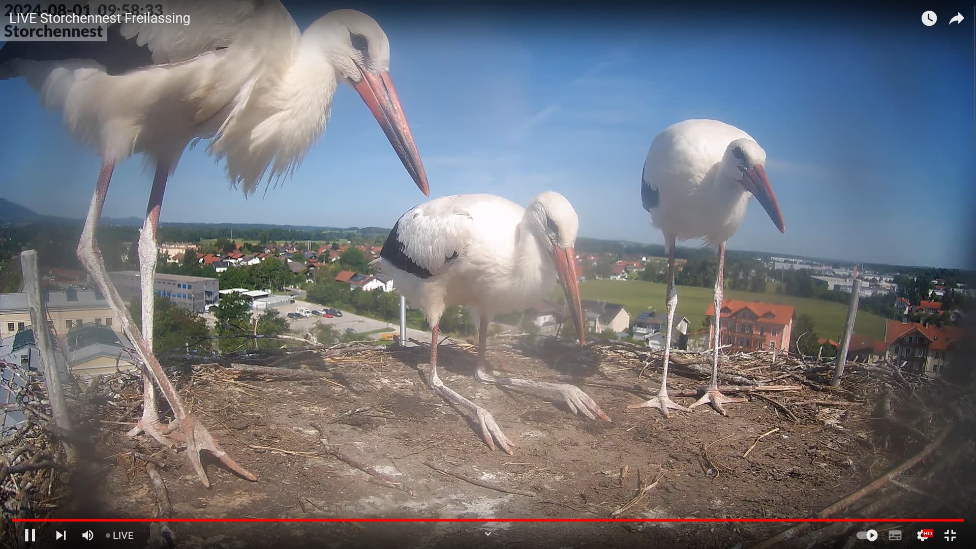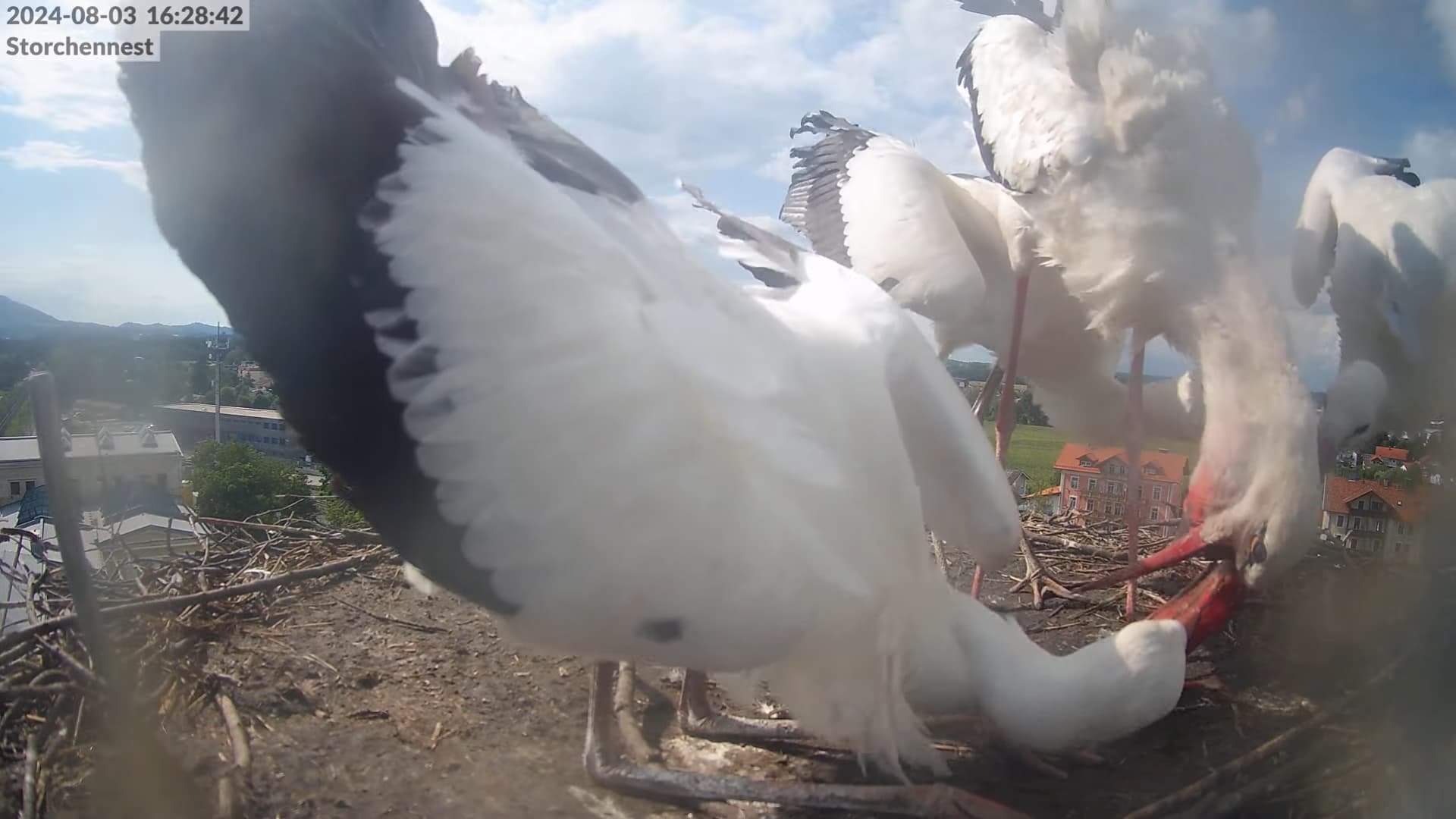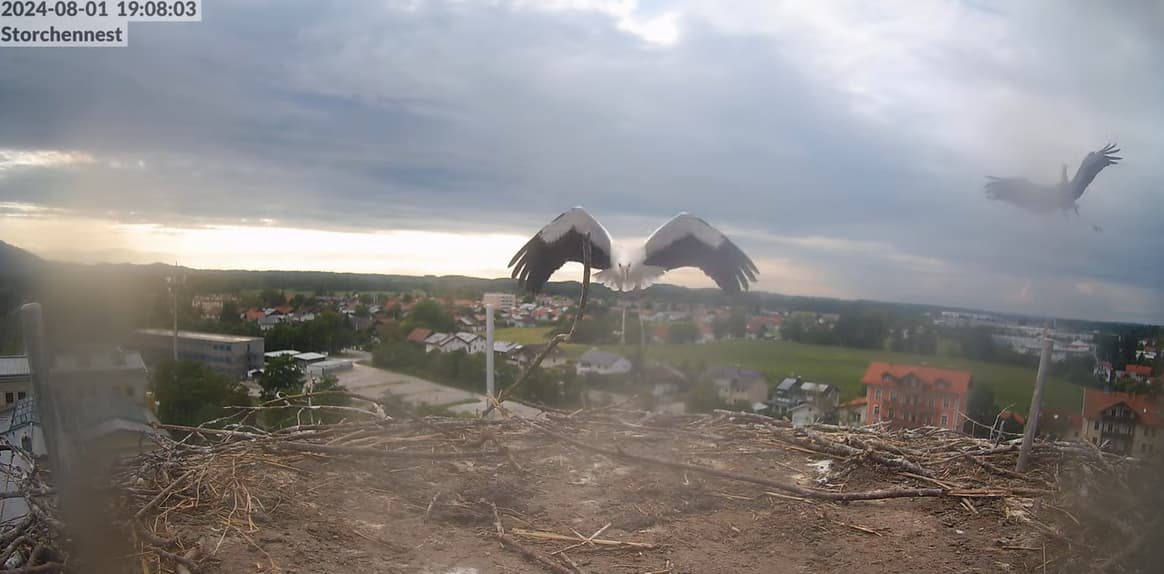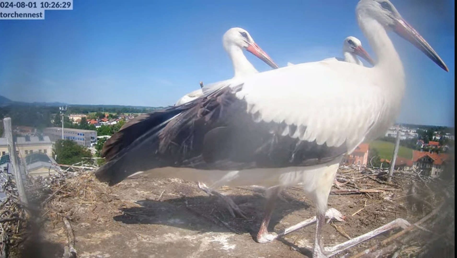 Um 10.26 h ist Korbi abgeflogen, es gab nur noch einen kleinen Snack. Die Jungstörche schauen ihm noch hinterher, kurz danach starten alle drei los, sie müssen sich nun selbst ihr Futter suchen. Seit drei Stunden sind sie nun schon unterwegs.