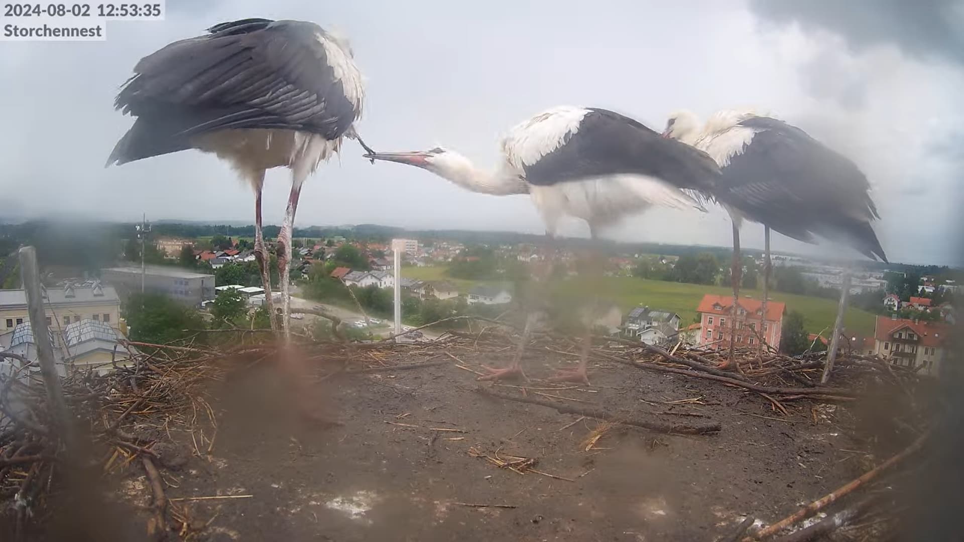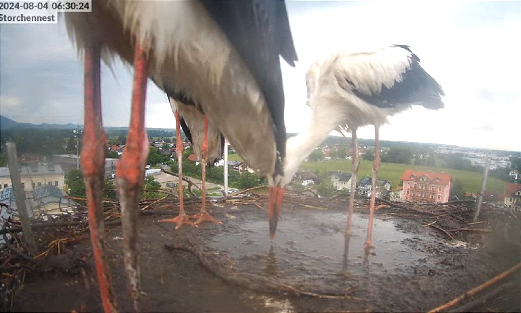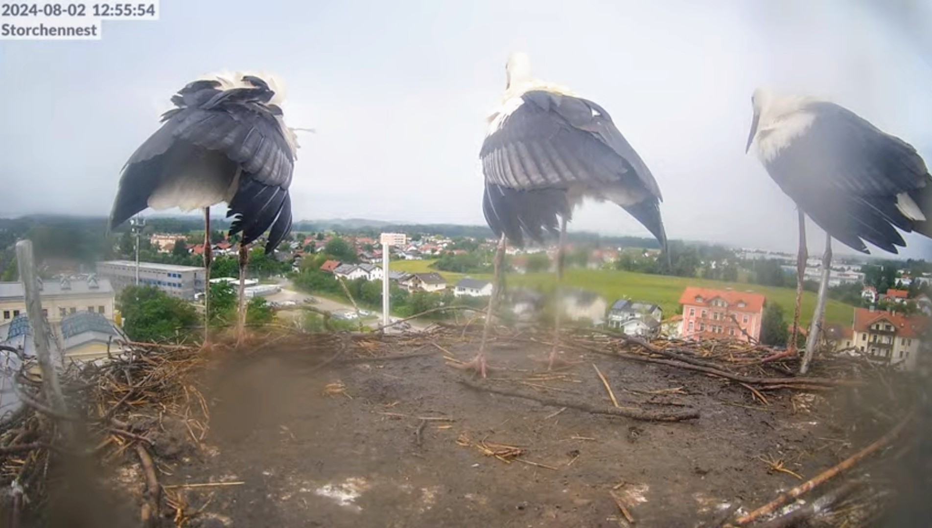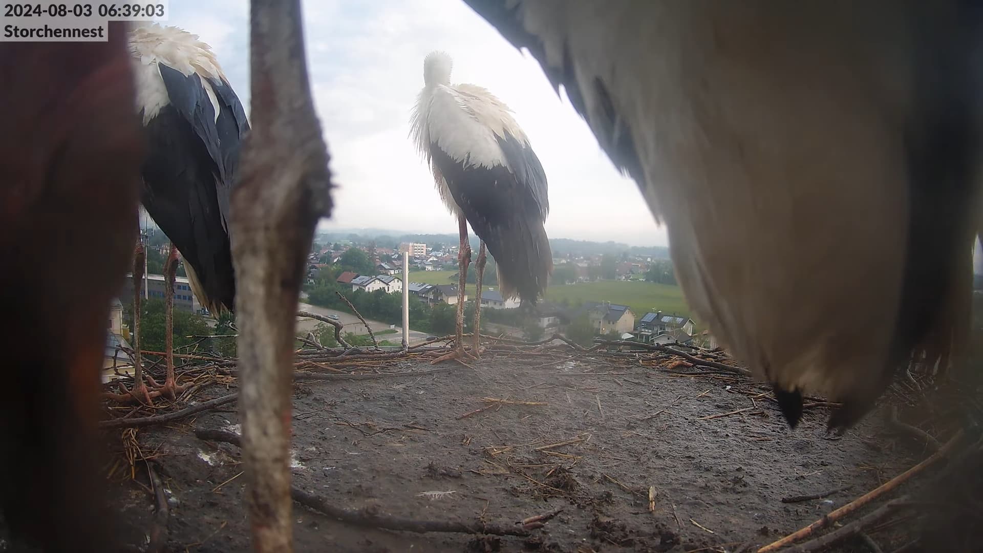 Es fängt immer wieder an zu regnen, kein Flugwetter für die Jungstörche. Sie lassen lieber das Gefieder vom Wind durchpusten und warten auf die Futterlieferung von Korbi.