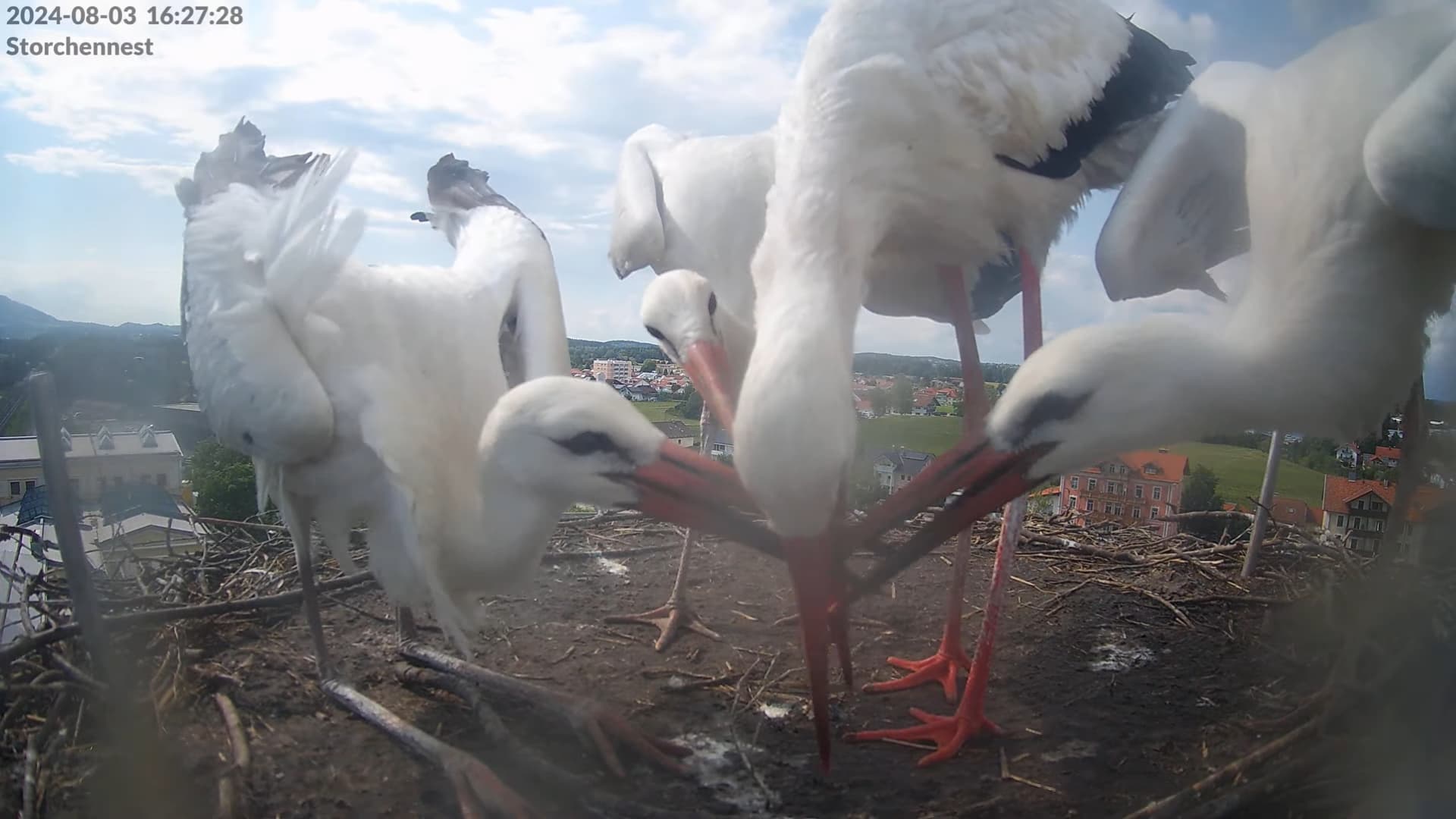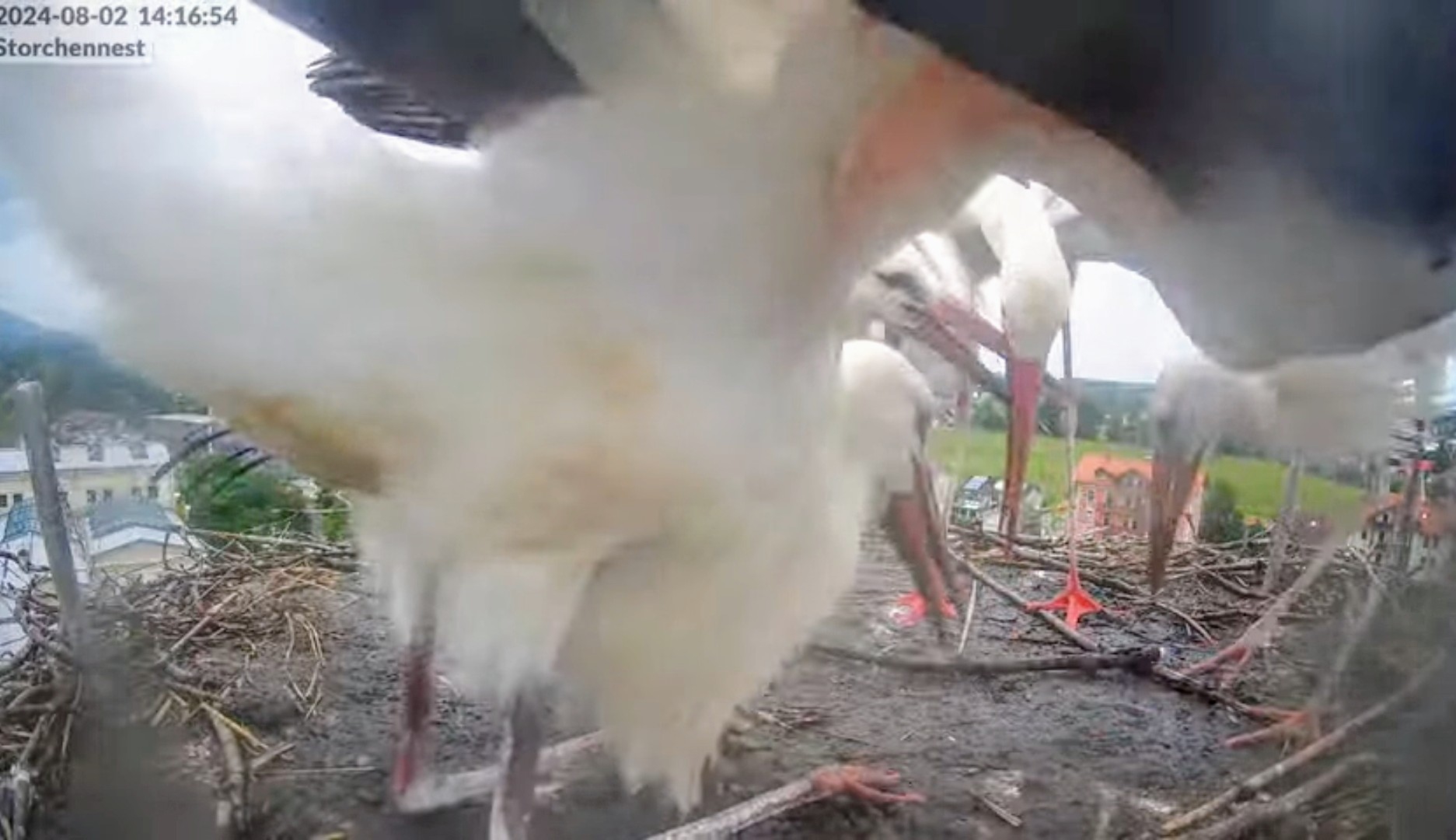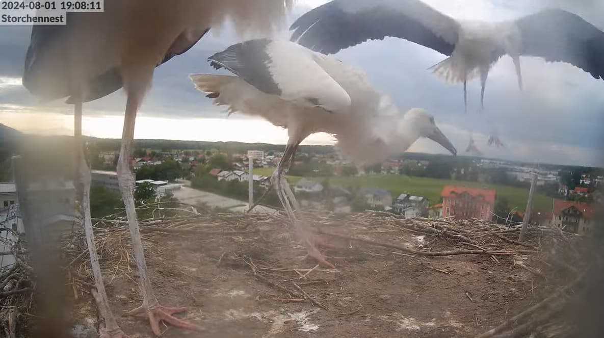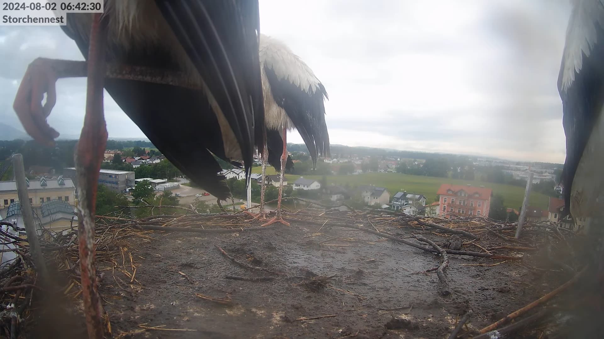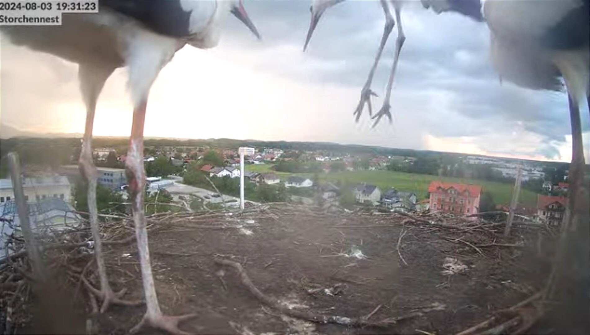 Es fängt immer wieder an zu regnen, kein Flugwetter für die Jungstörche. Sie lassen lieber das Gefieder vom Wind durchpusten und warten auf die Futterlieferung von Korbi.