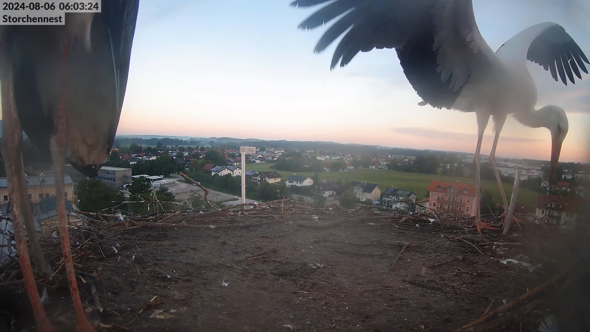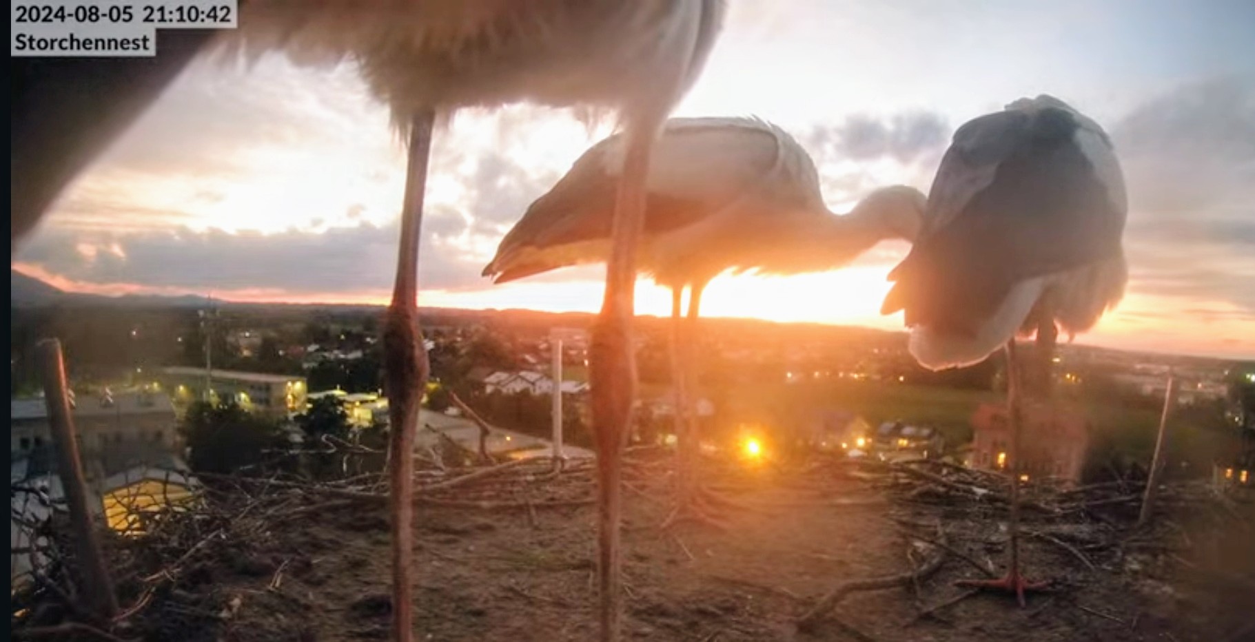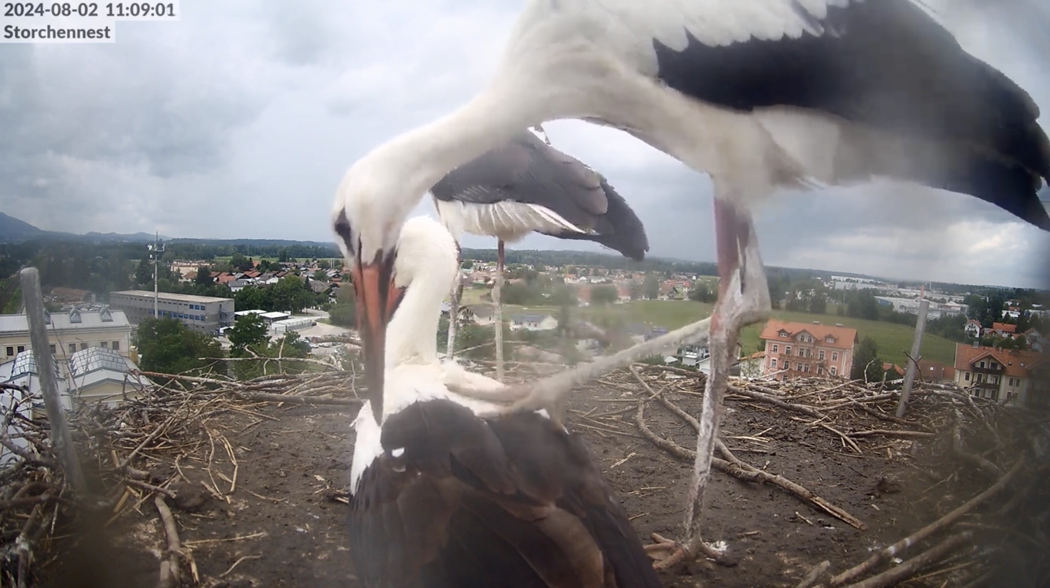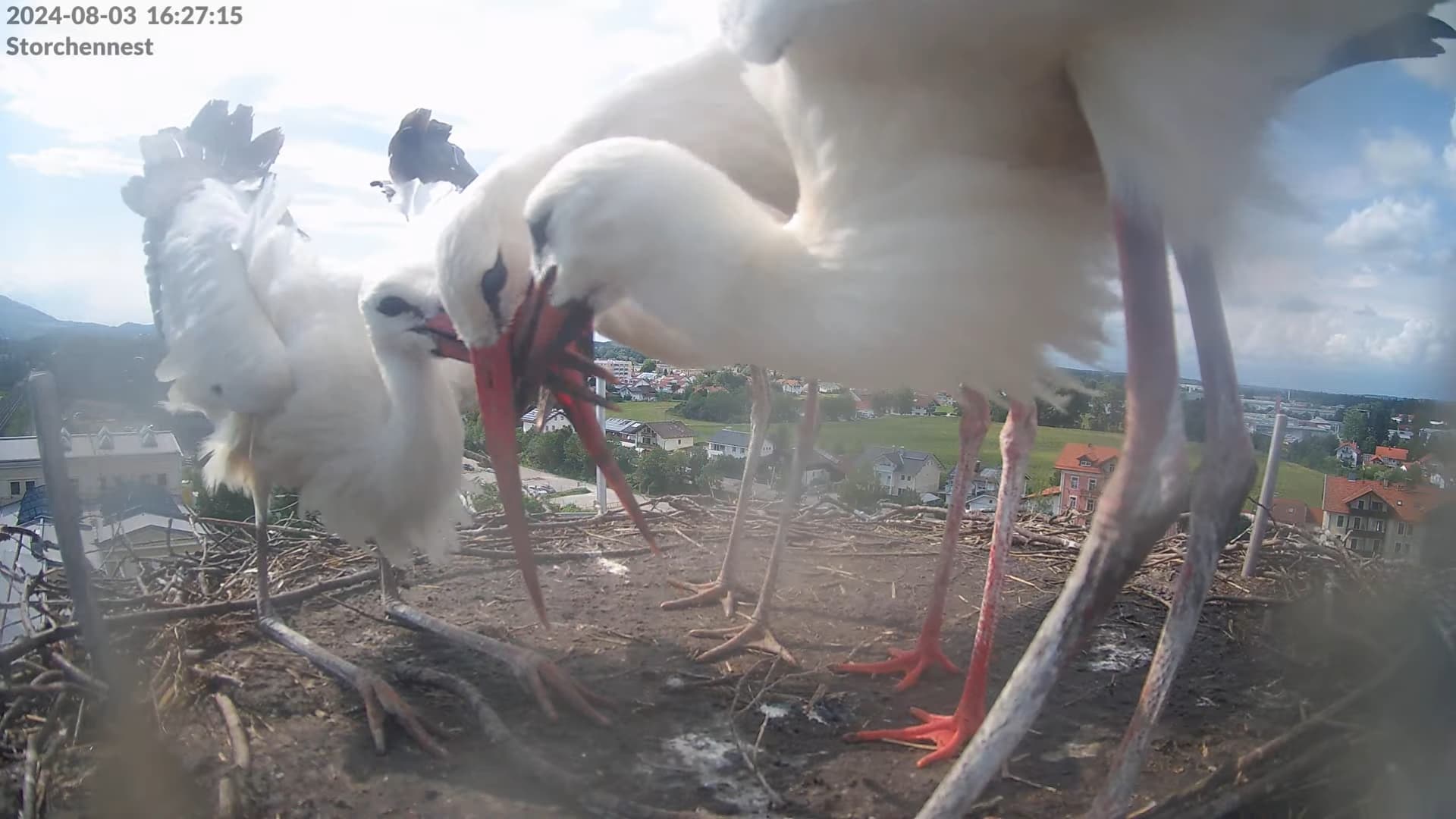 Es fängt immer wieder an zu regnen, kein Flugwetter für die Jungstörche. Sie lassen lieber das Gefieder vom Wind durchpusten und warten auf die Futterlieferung von Korbi.