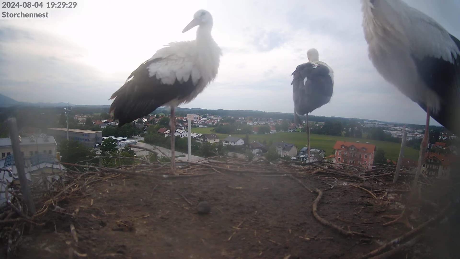 Durch den vielen Regen hat sich im Nest eine große Pfütze gebildet. Mitten in der Nacht, so gegen halb eins, gab es ein Feuerwerk. Alle wurden aufgeschreckt, zwei Jungstörche flogen weg, der dritte und Mama Heidi sind da geblieben. Heute morgen sind die beiden wieder zurück gekommen.