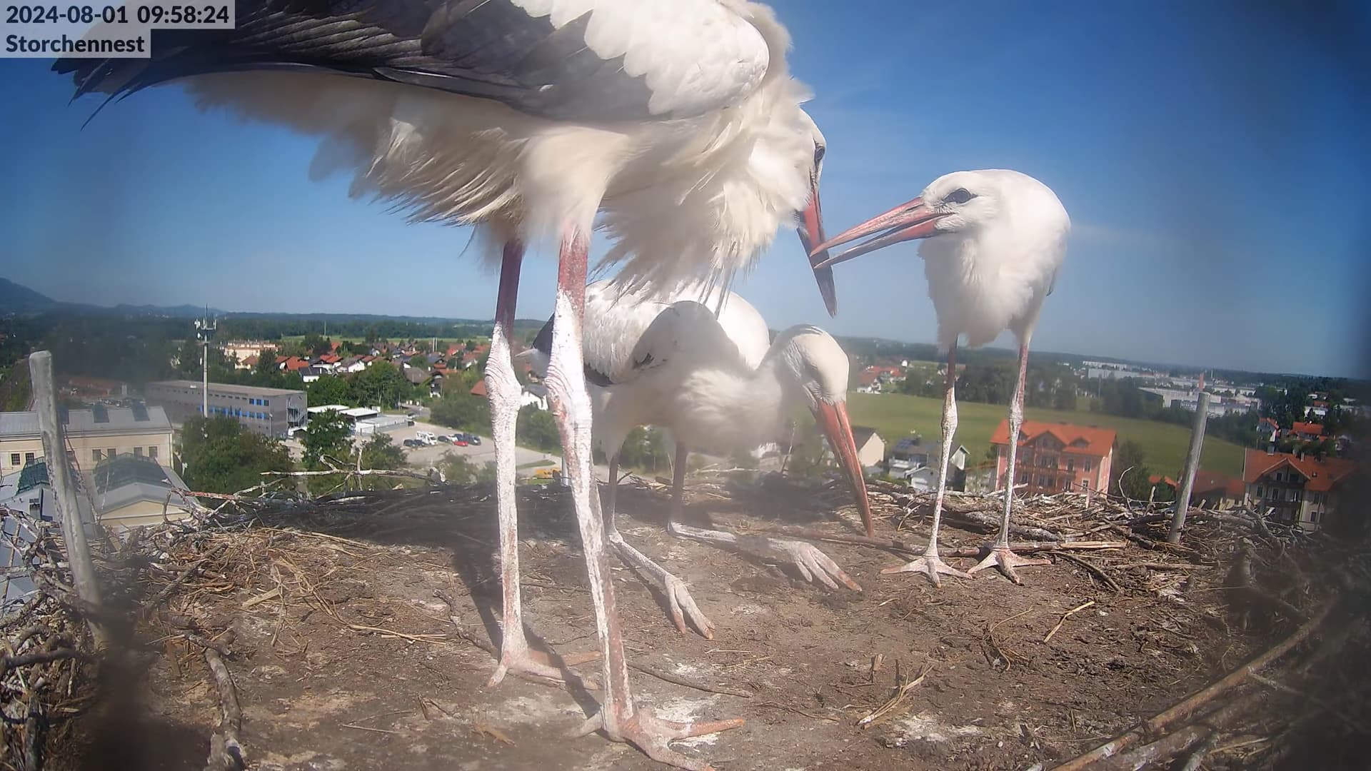 Ich habe den Eindruck, dass dies das einzige Storchennest ist, in dem die Jungstörche noch gefüttert werden. Alle anderen müssen sich ihr Futter schon selbst suchen.