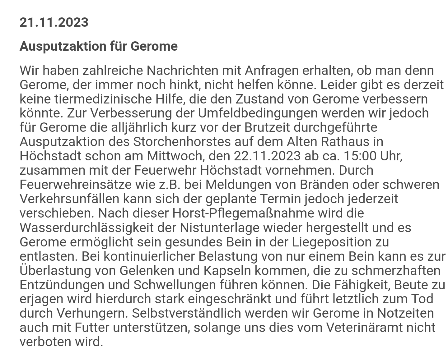 @Susl, wenn du auf der Seite https://storchennest-hoechstadt.de/live-cam nach unten scrollst, findest du Infos zur Ausputzaktion.