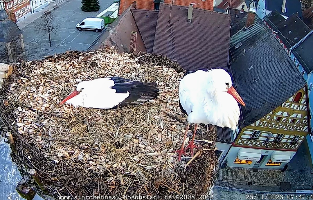 Ein Storchen-Fan bin ich seit Anfang Mai 2023, seit der Schweinebauchschwarte-Geschichte. Dadurch ist ja unser Storchenpaar „berühmt“ geworden (Berichte im bayerischen Radio und TV). Seither verfolge fast täglich das Geschehen im Horst und bin fasziniert von diesen wunderschönen Vögeln. Ich habe mich gefreut, als ich von LisaMarie las, dass beide ihren frisch sanierten Horst besichtigt haben, denn seit der Säuberungsaktion habe ich sie nicht mehr gesehen. Zufällig habe ich reingeschaut, als der „Horst-Beauftragte“ sauber machte - war interessant und schwindelerregend