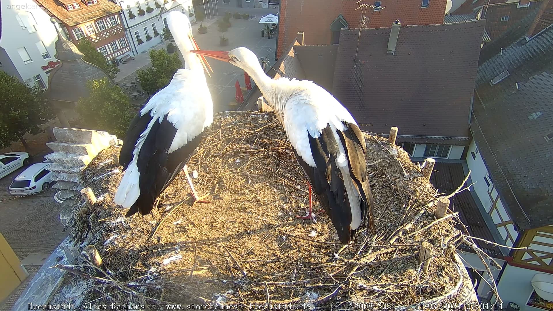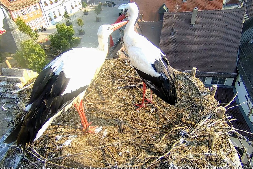 Am Morgen sind die Jungstörche bereits unterwegs, Frieda und Gerome haben nun Zeit für sich.
