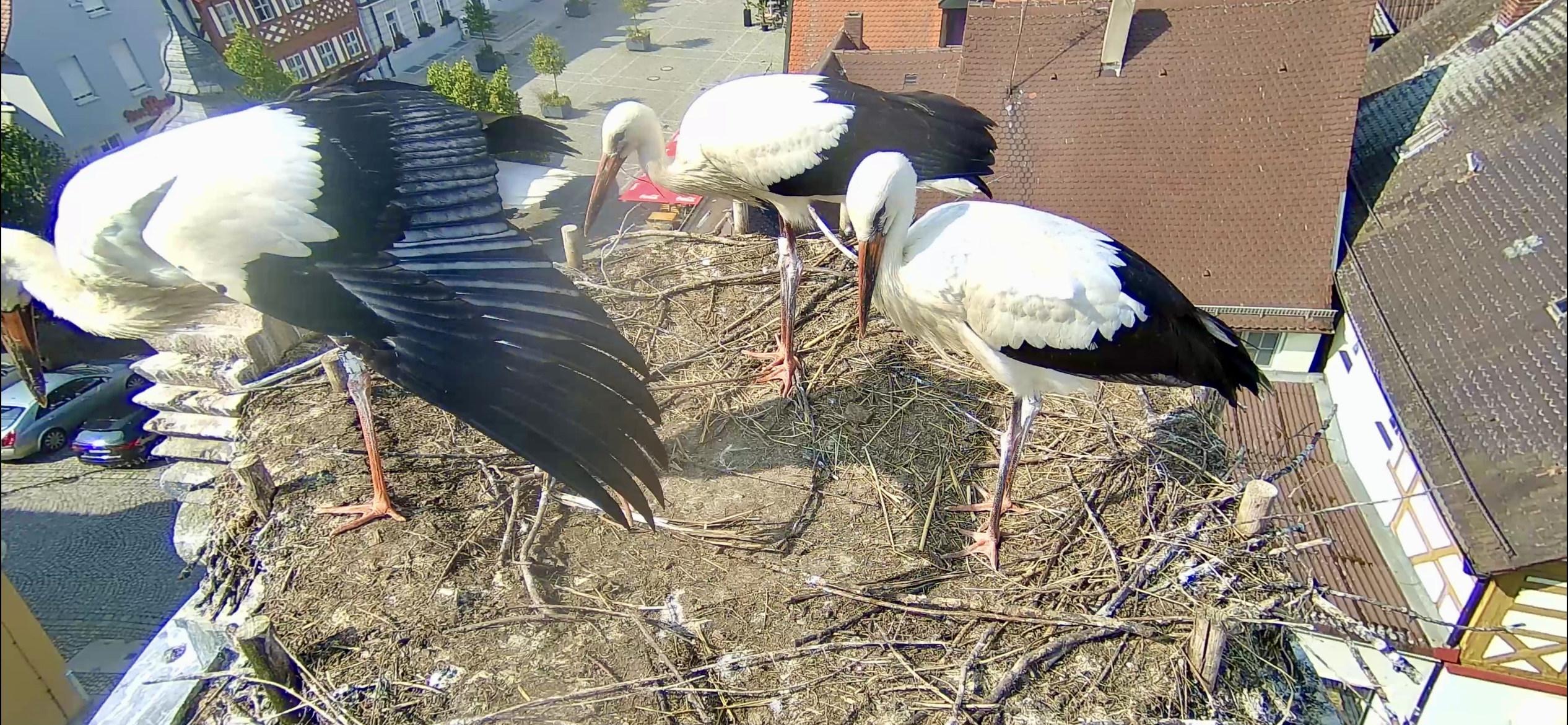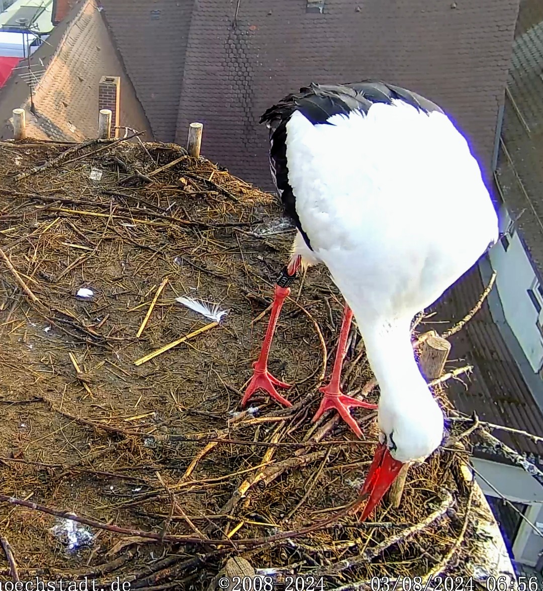 Gerome hat gerade einen Snack gebracht und wurde noch weiter angebettelt. Es sind nur 2 Jungstörche da.