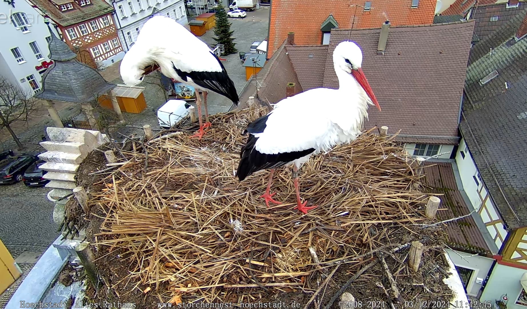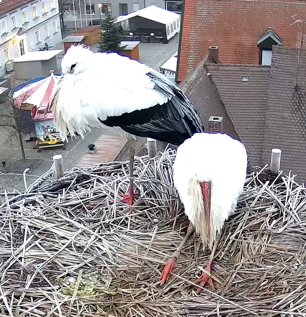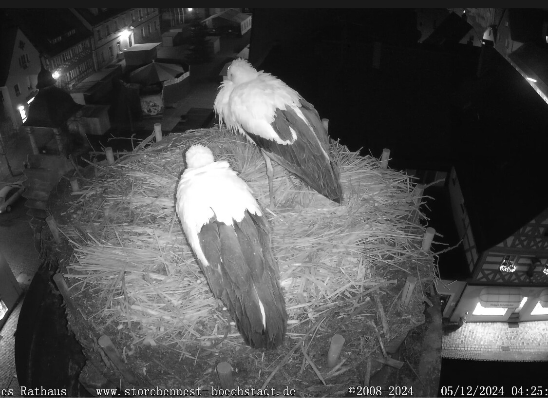 Wahrscheinlich ist der Platz unten zu hell beleuchtet, so dass die Kamera nicht in den Nachtmodus umschaltet. Die Störche sind kaum noch zu erkennen.