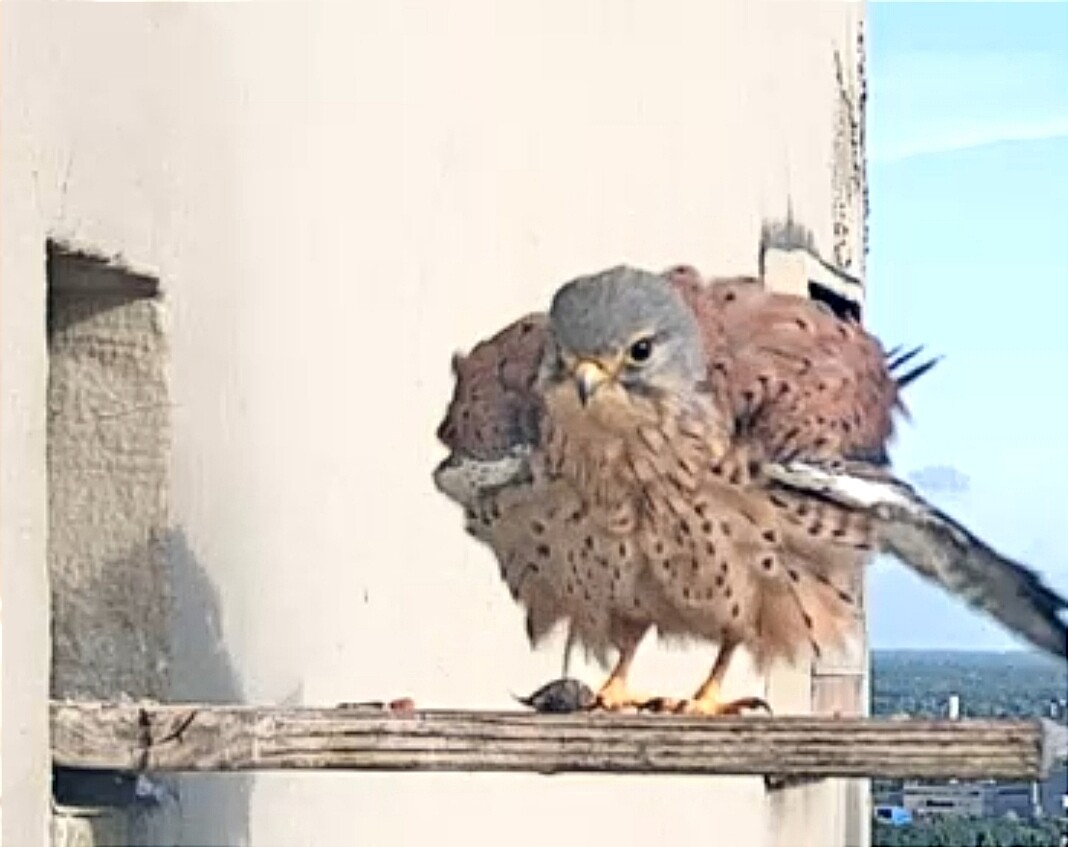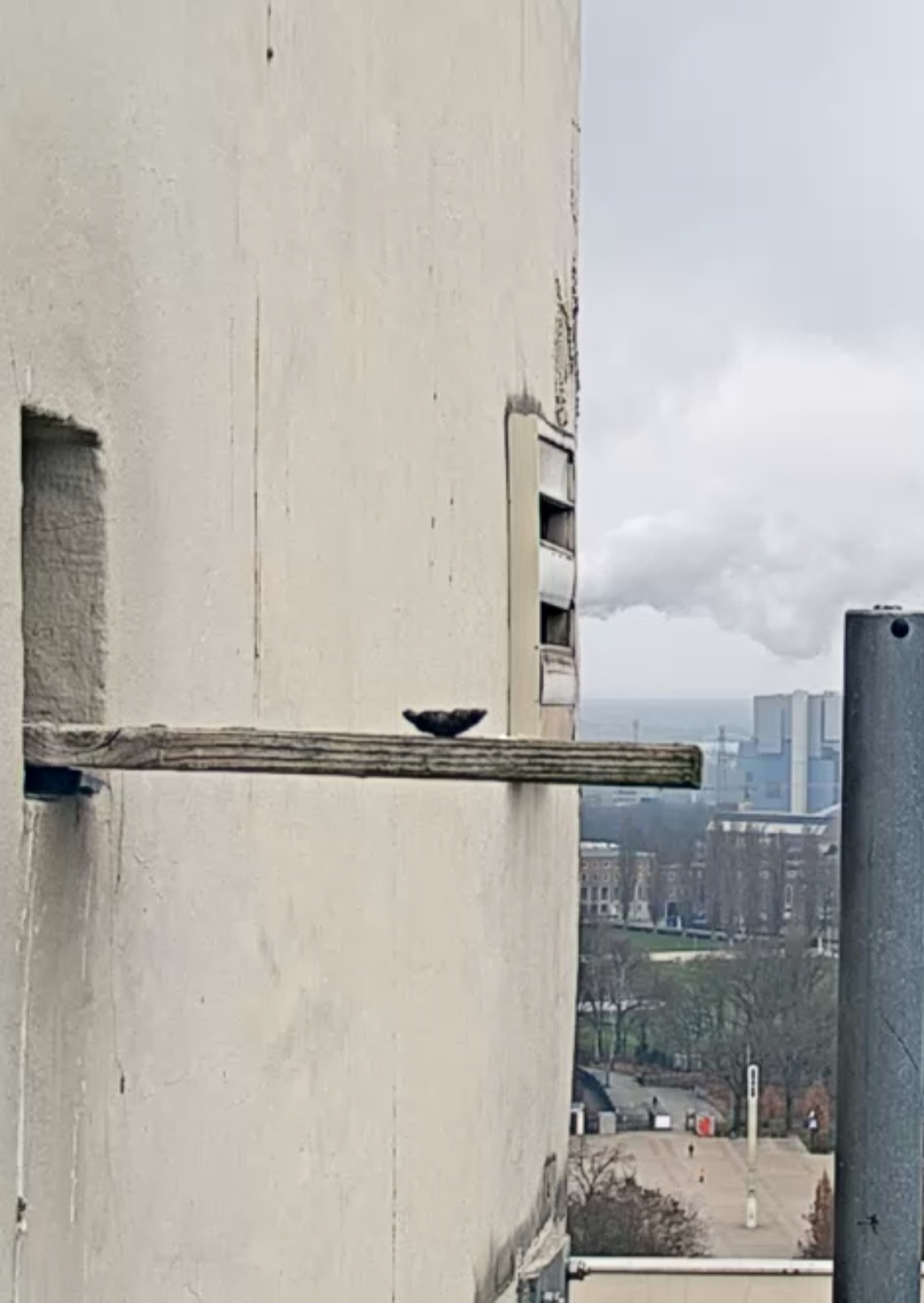 Das Falkenweibchen ist zu einem kurzen Besuch da.