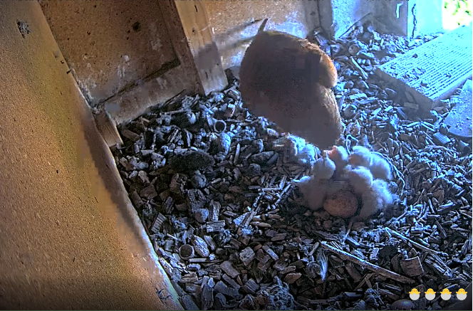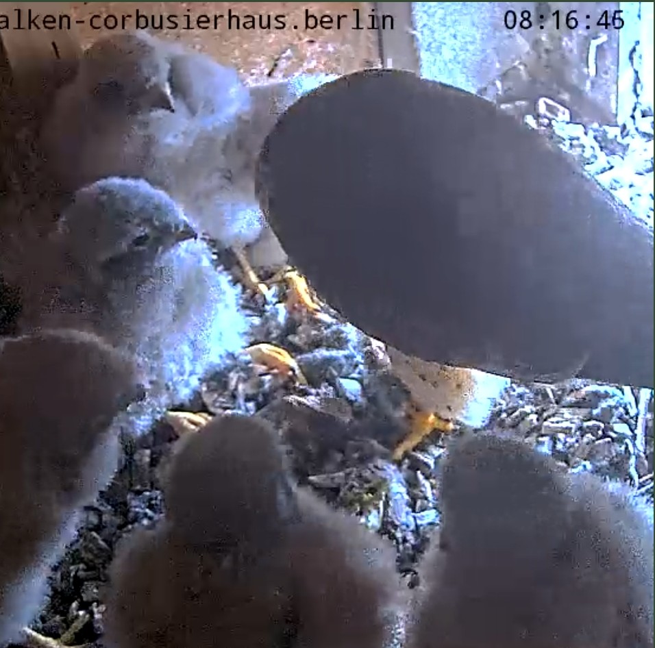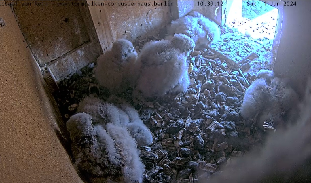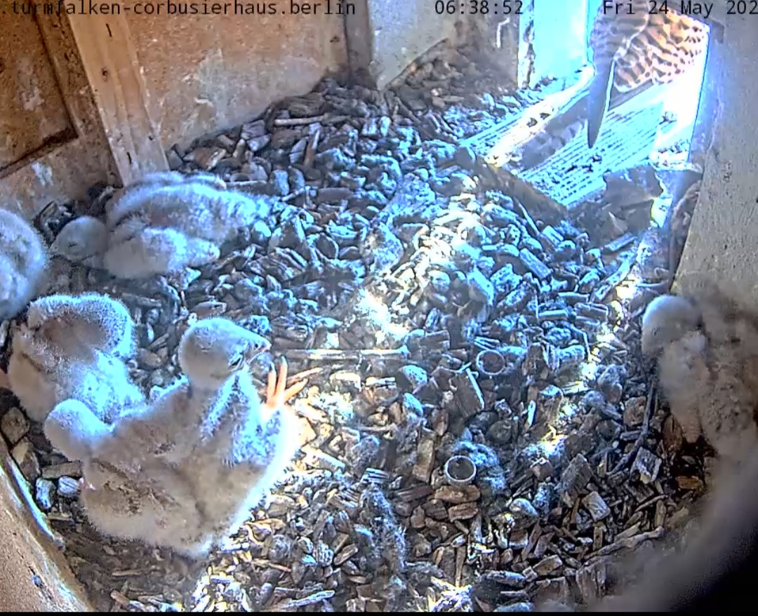 Mama genießt die Morgensonne und die 6 Jungfalken verteilen sich im Kasten ![]()