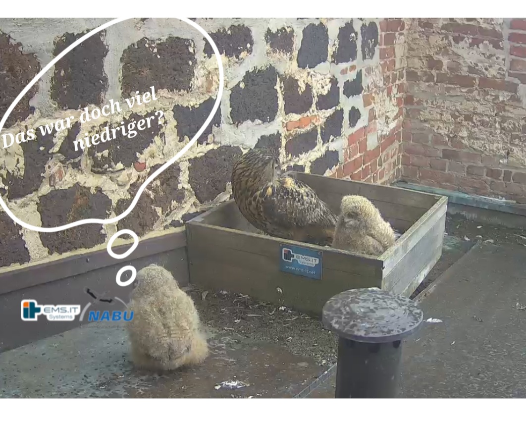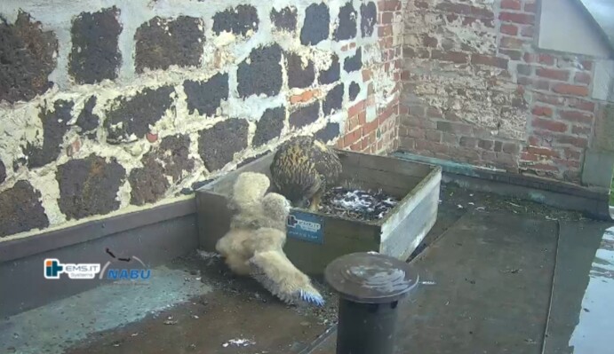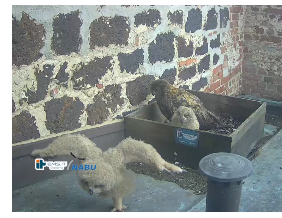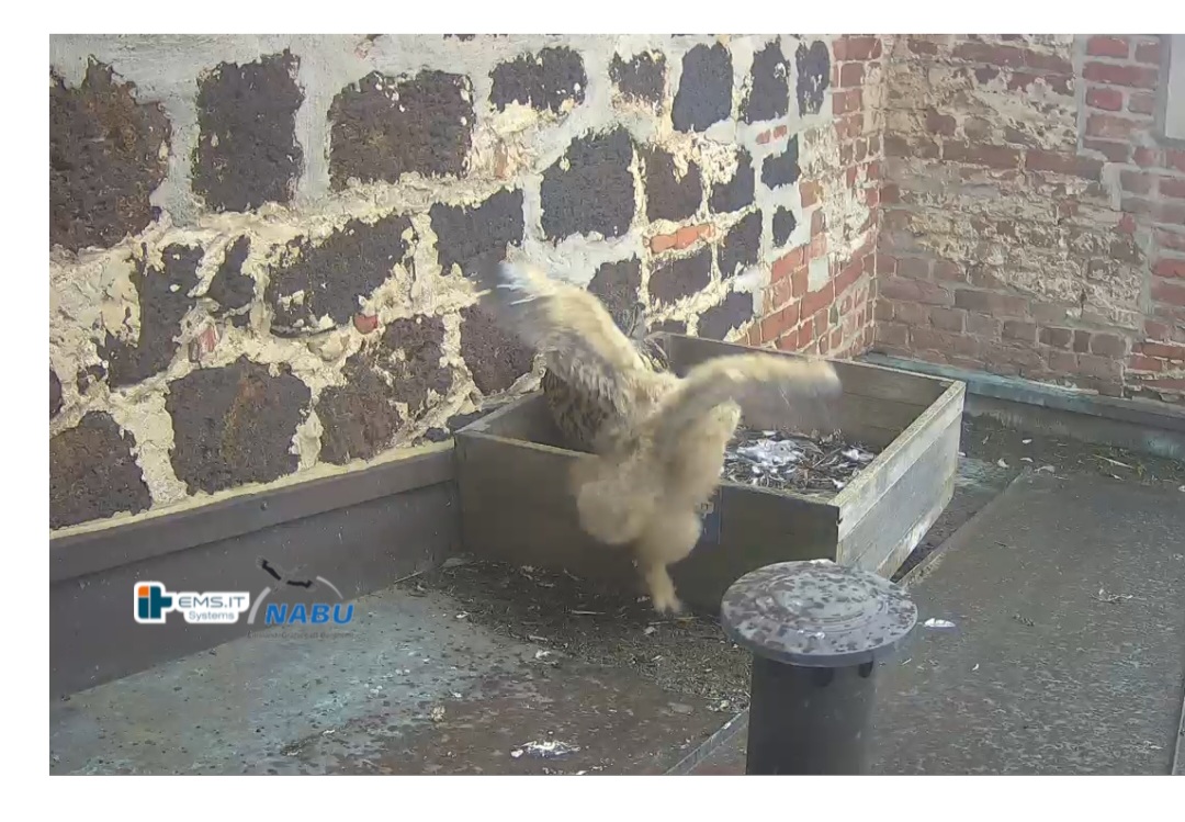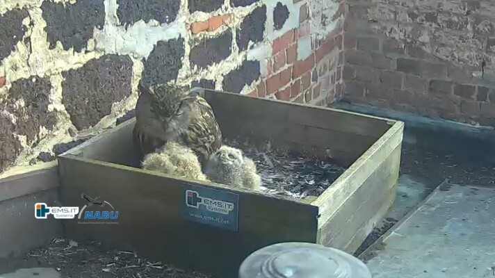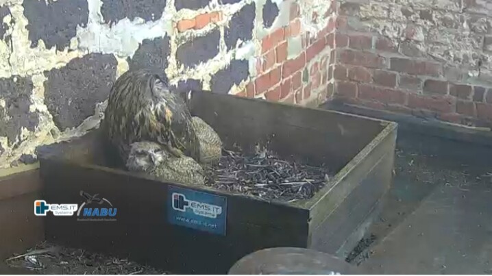 Der kleinere Uhu muss außerhalb der Kiste übernachtet haben und war heute noch nicht zu sehen. Wohl in der unteren linken Ecke.