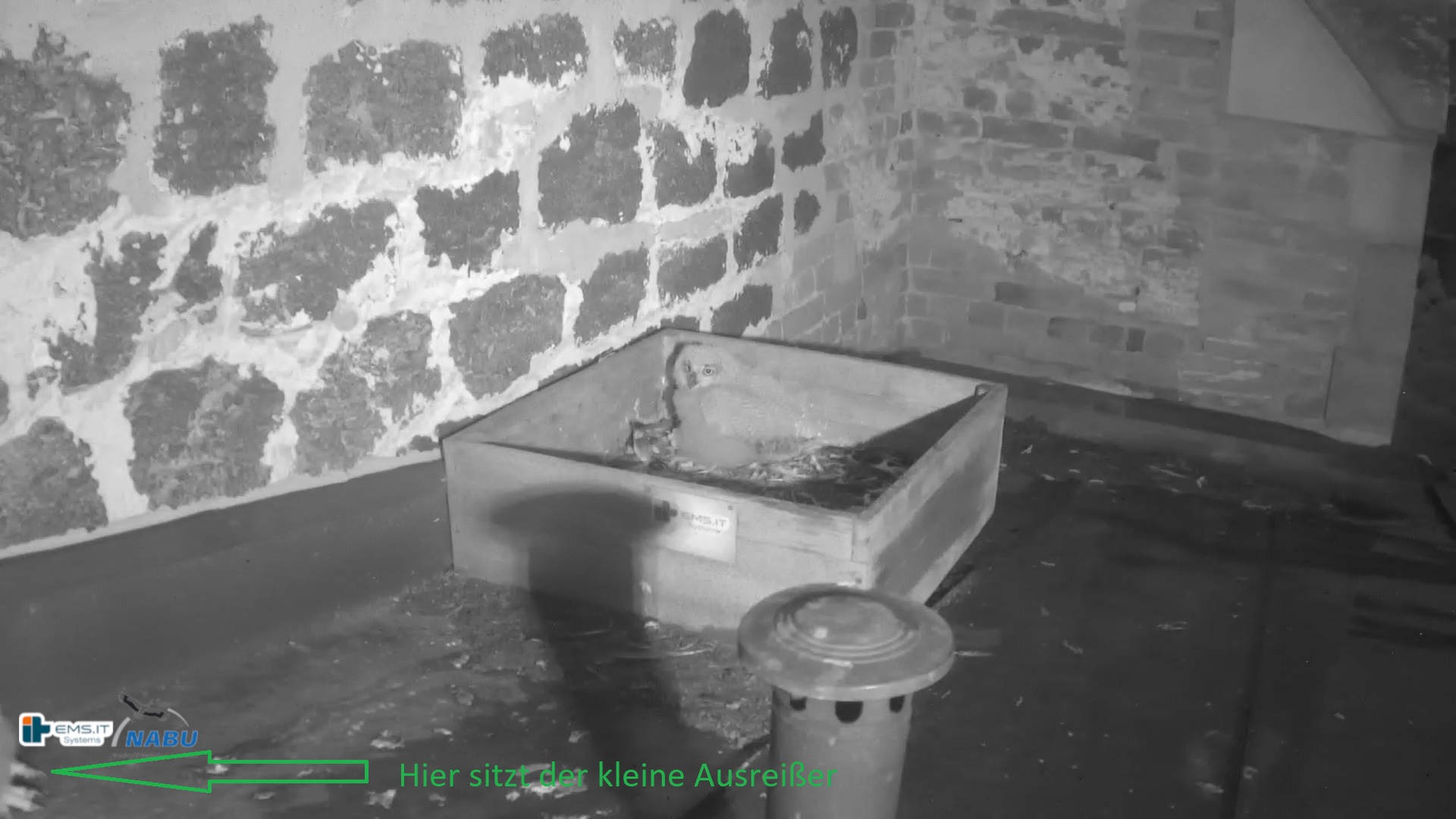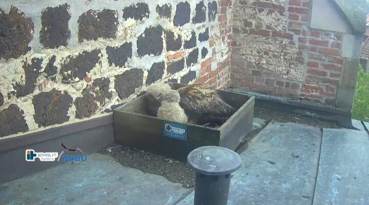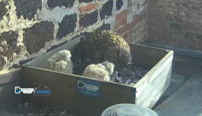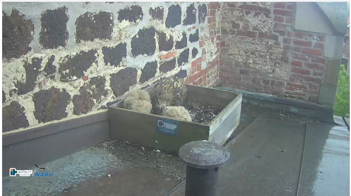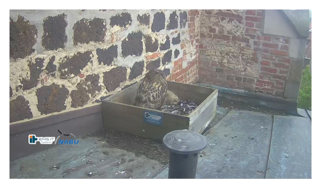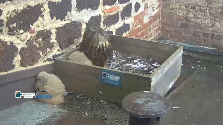 Der kleinere Uhu muss außerhalb der Kiste übernachtet haben und war heute noch nicht zu sehen. Wohl in der unteren linken Ecke.