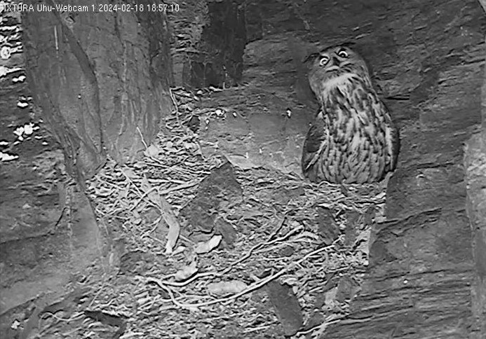Dann höre ich laut und deutlich einen Uhu vor Kamera 1 am Brutplatz in der Felswand im Ahrtal.