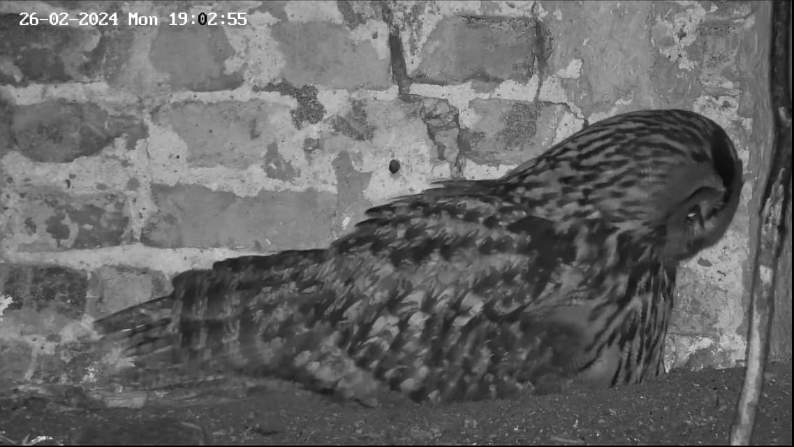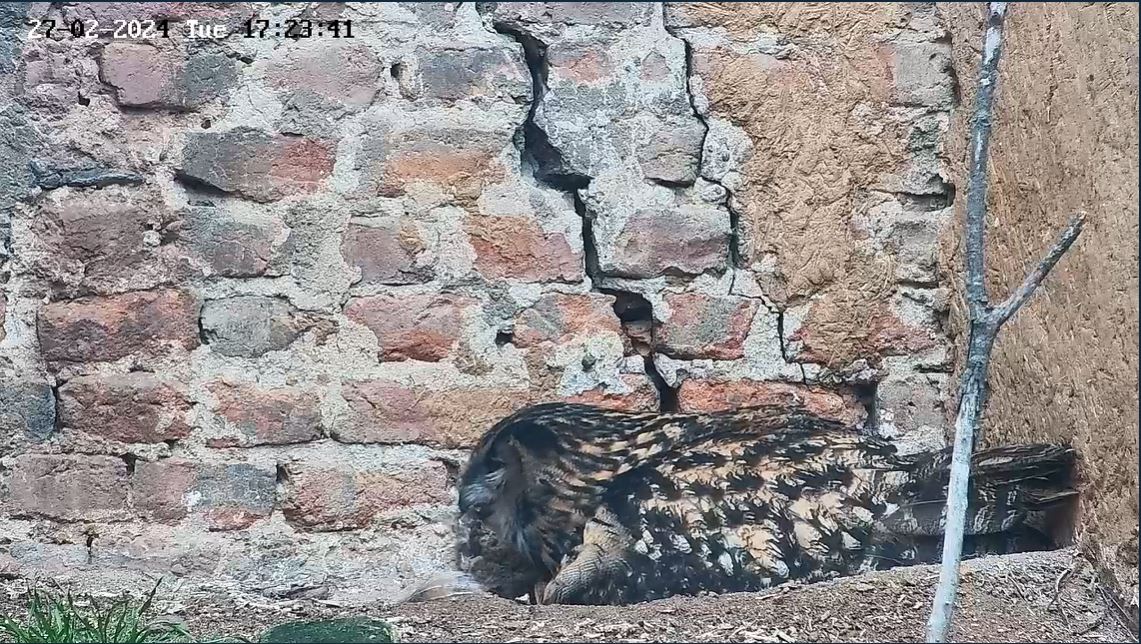 Das brütende Uhu-Weibchen in der Ruine wird gut mit Nahrung versorgt. Gerade hat sie ein weiteres Gewölle hervorgebracht.