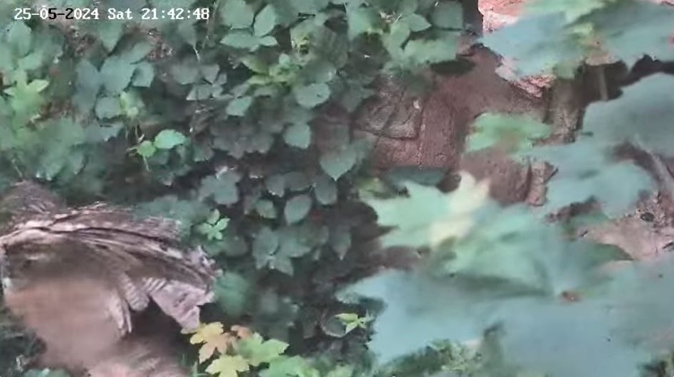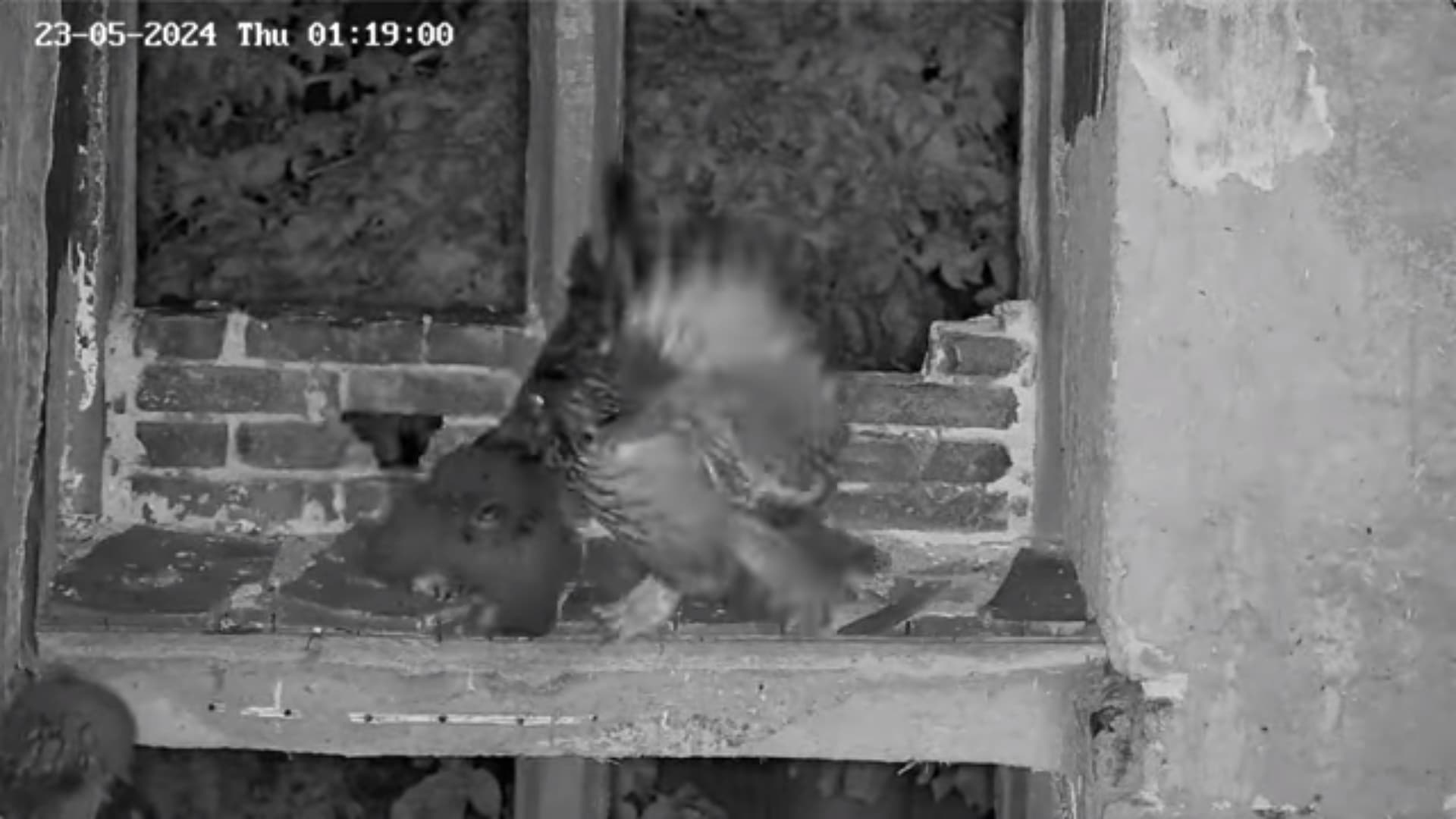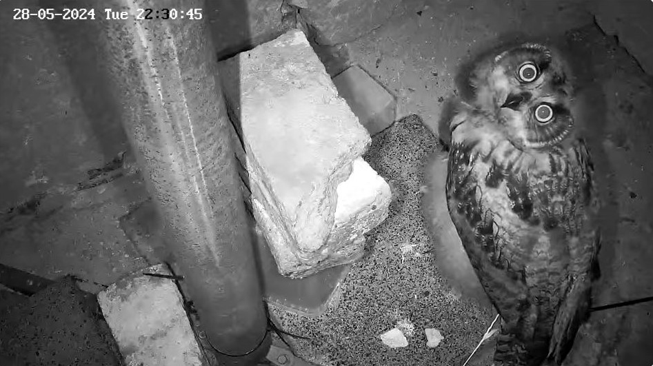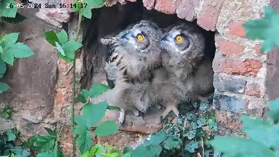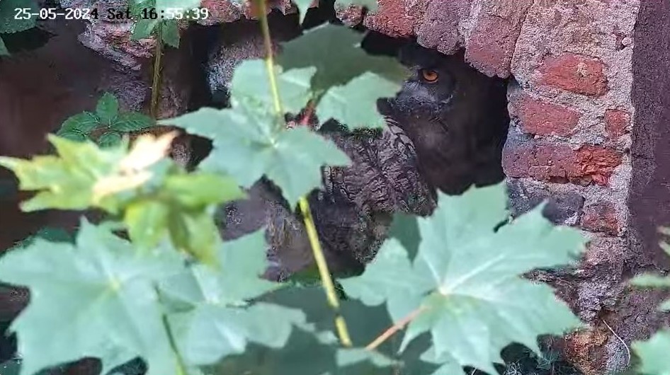 Die Junguhus werden immer geübter und aus Geflattere wird nun langsam Fliegen. Mini erkundet die hochgelegenen Fensternischen, hat auch eine weitere Vorratskammer von Isolde entdeckt und schaut genau in die Cam 3. ![]()