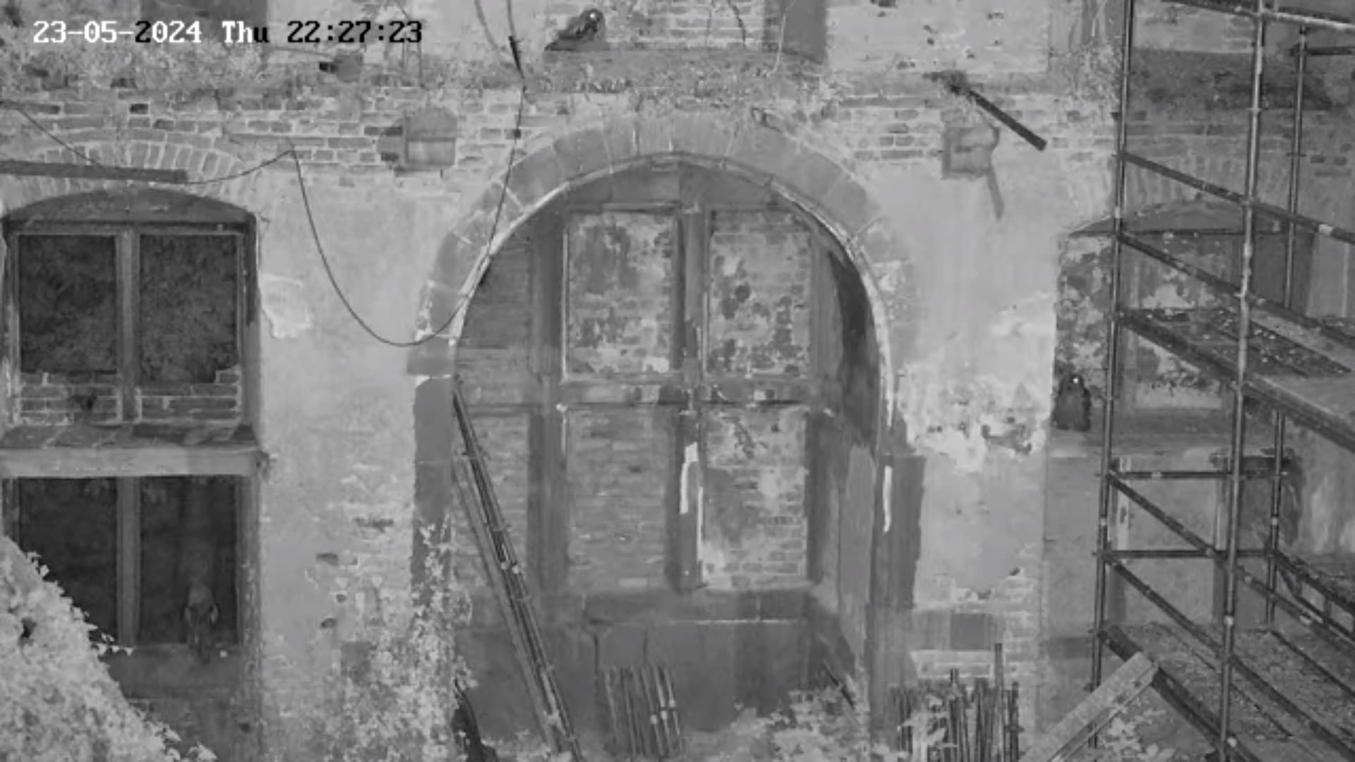 Die liegen schon seit einigen Tagen da - glaube ich. Ist halt ein altes einsturzgefährdetes Gemäuer. Da bröckelt es an allen Enden. Deshalb auch die Gerüste für Sicherungsmaßnahmen. Ich finde es von den Eigentümern des Geländes absolut vorbildlich, dass sie auf die Uhus und die gesamte Brutzeit solche Rücksicht nehmen und die Arbeiten für diese Zeit aussetzen.