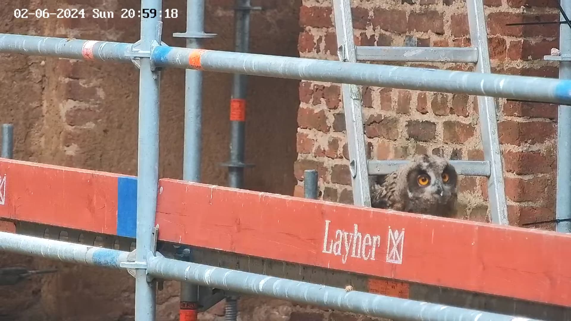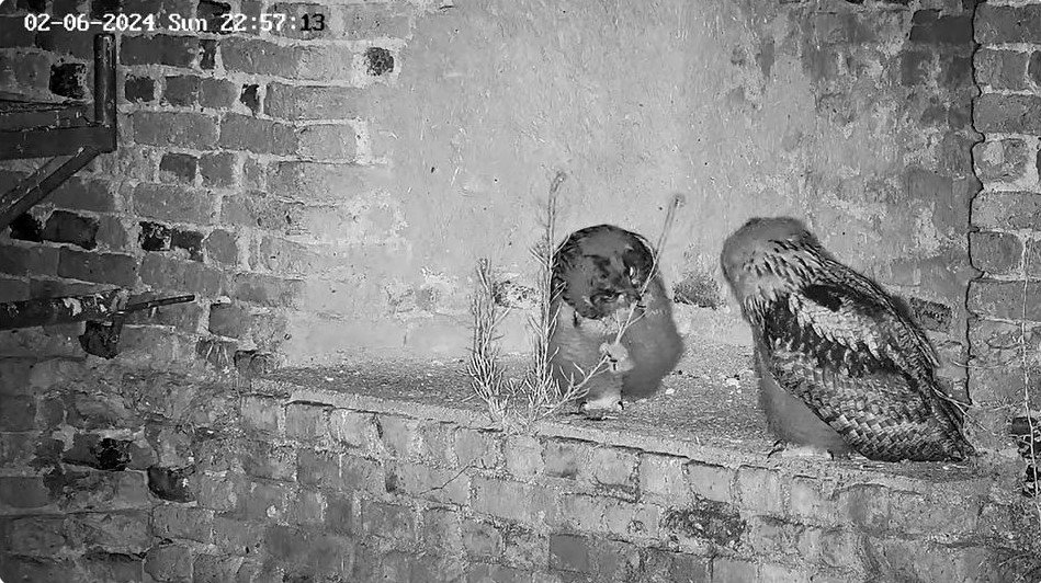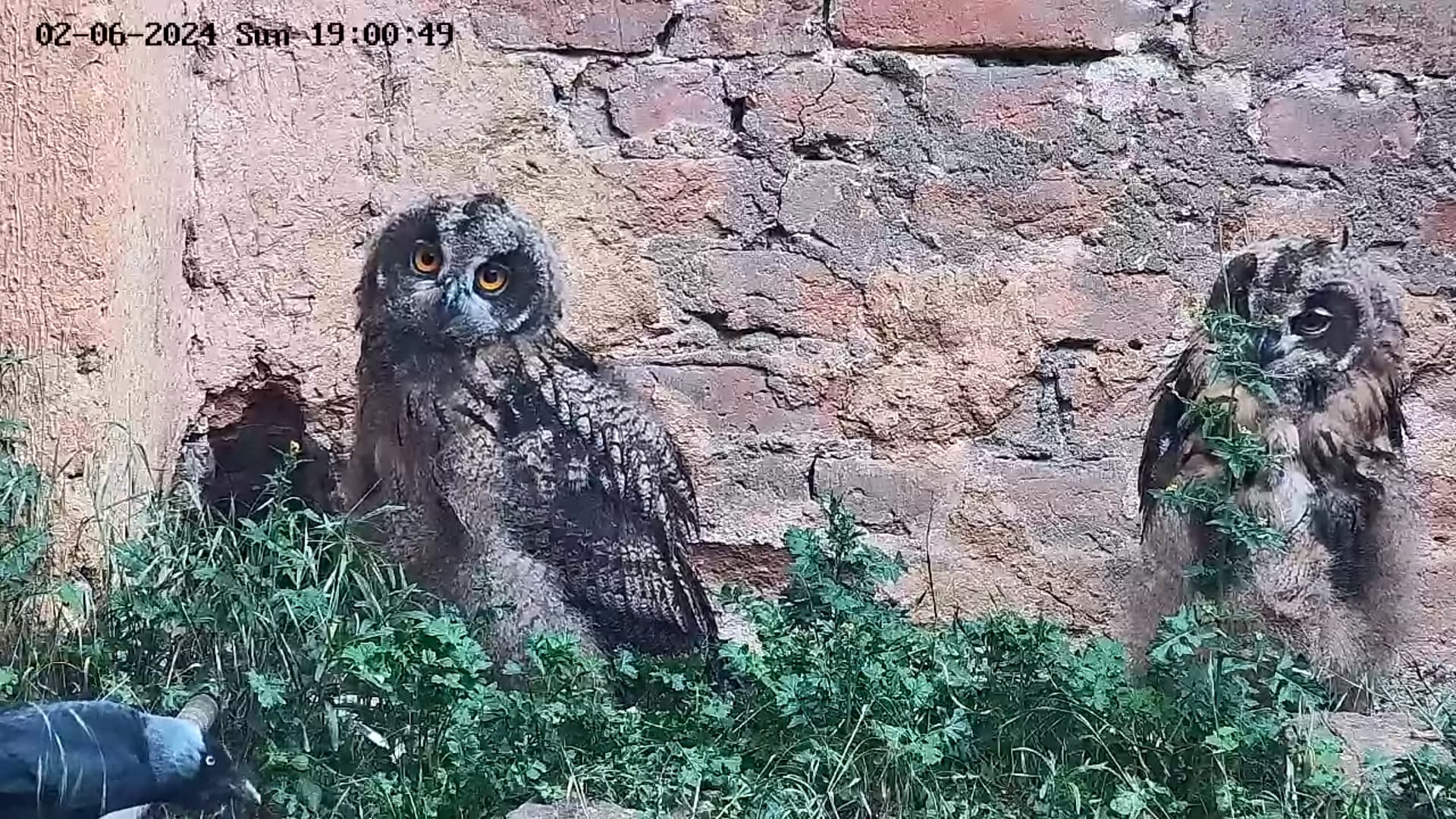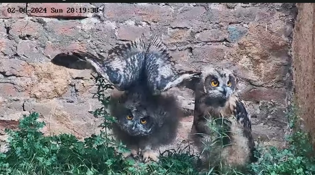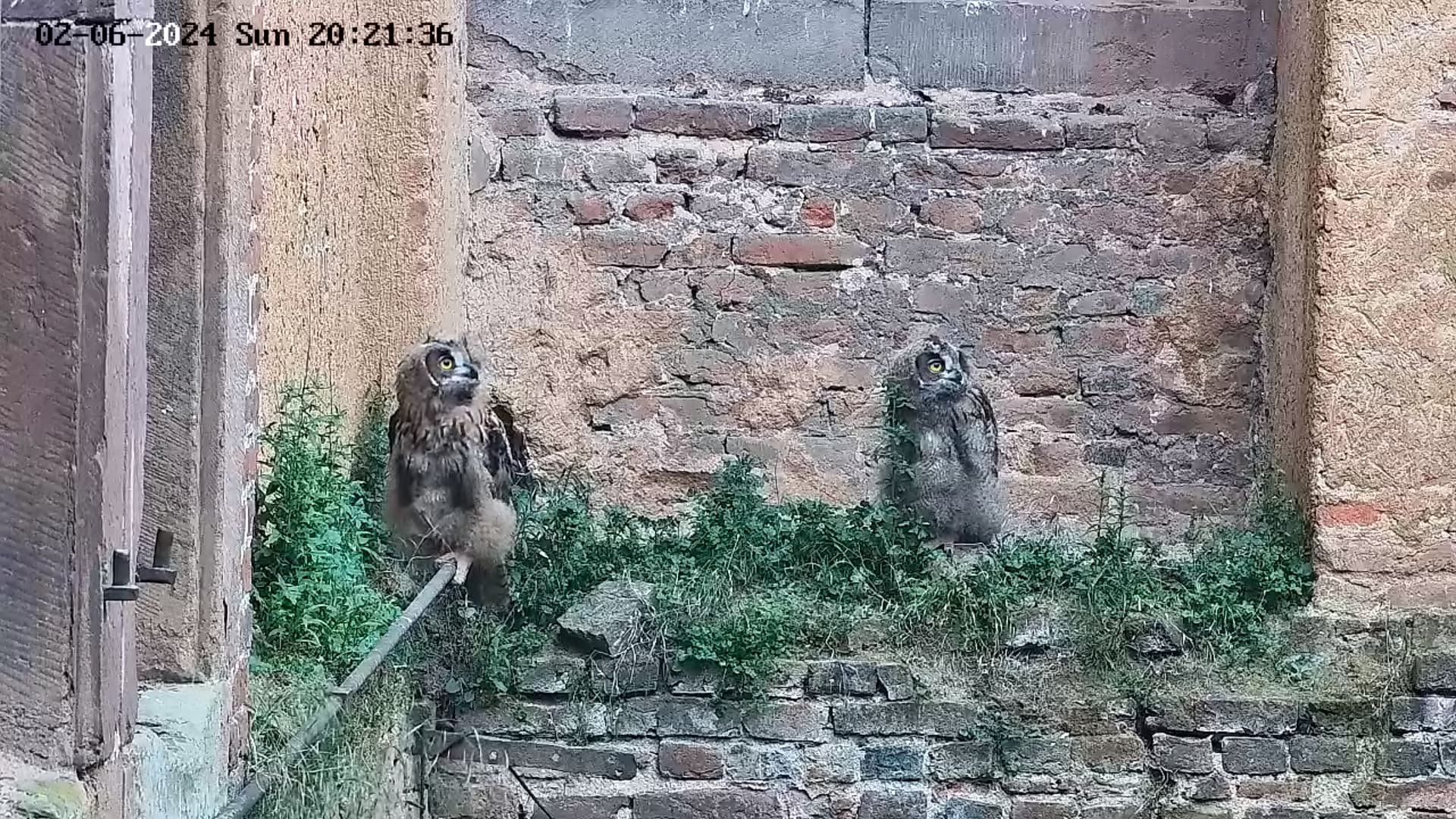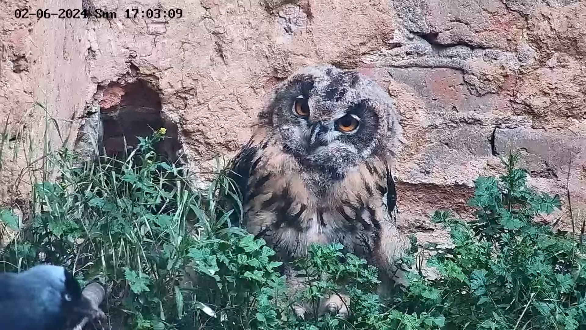 Die Dohlen versuchen wohl den Junguhu aus dieser Fensternische zu locken/zu vertreiben. Da sitzen sie ja gerne, die Dohlen, und Nester sind sicher ganz in der Nähe.