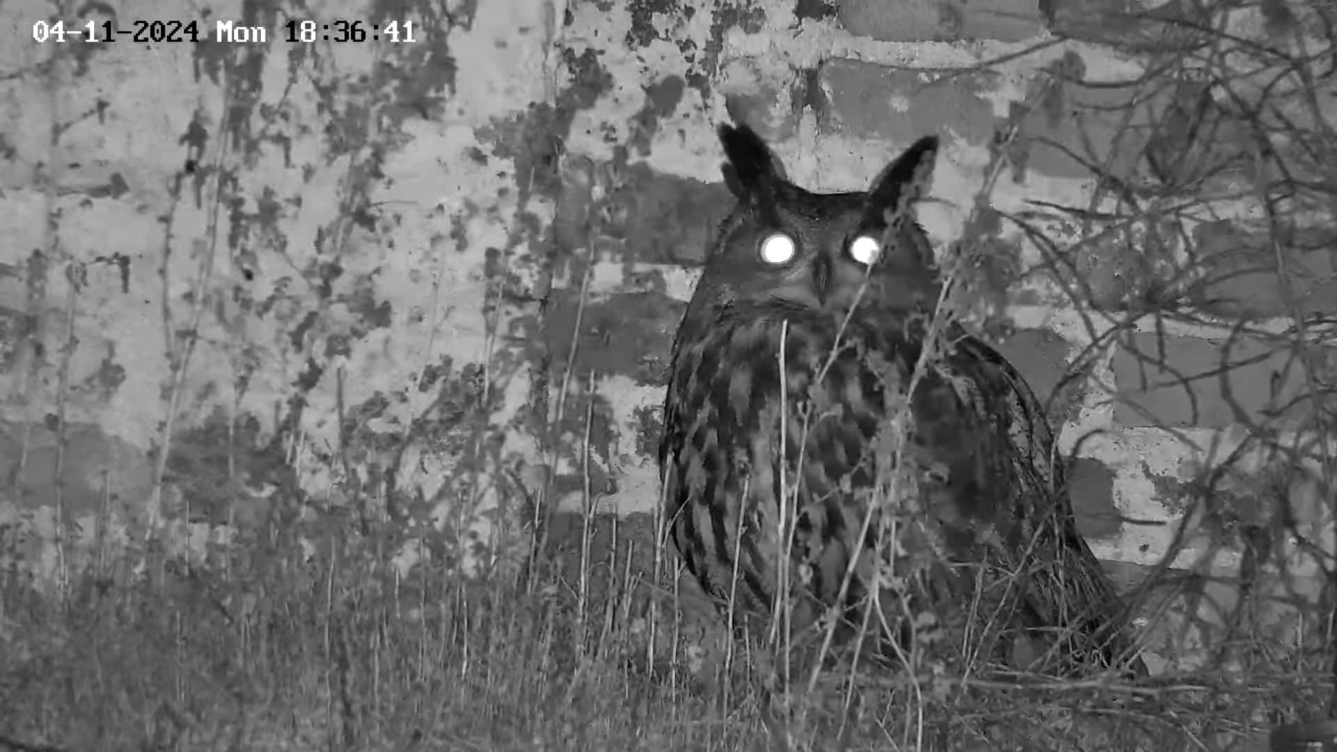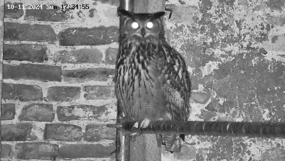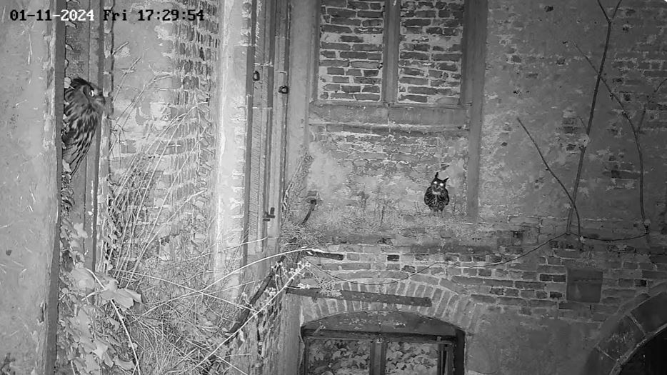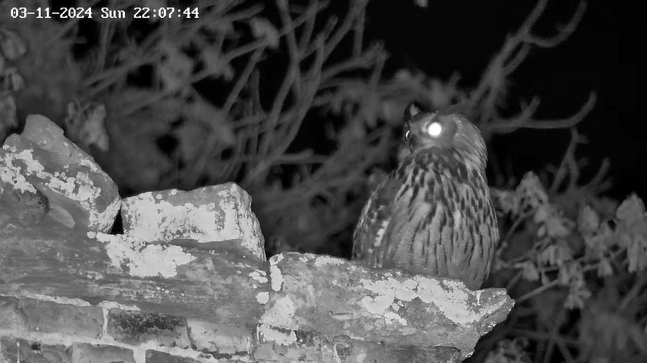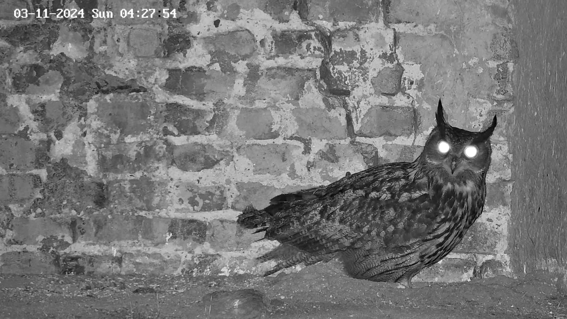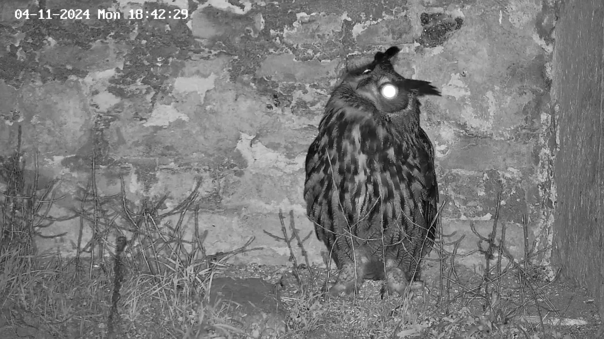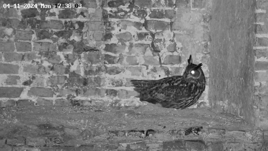 Gestern ließ sich Isolde ja recht früh in der Ruine blicken - heute ist aus Uhu-Sicht ja noch tagschlafende Zeit! Die Kamera läuft ja noch im Tag- Modus. Ihre Rufe sind gut zu hören.