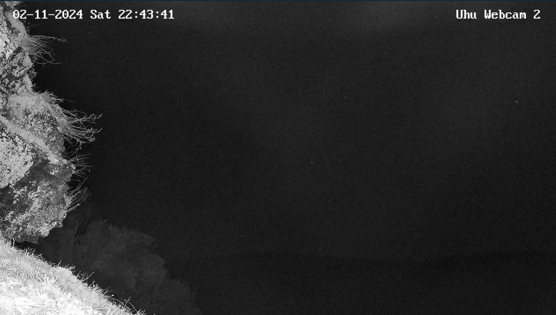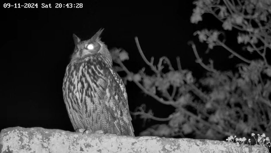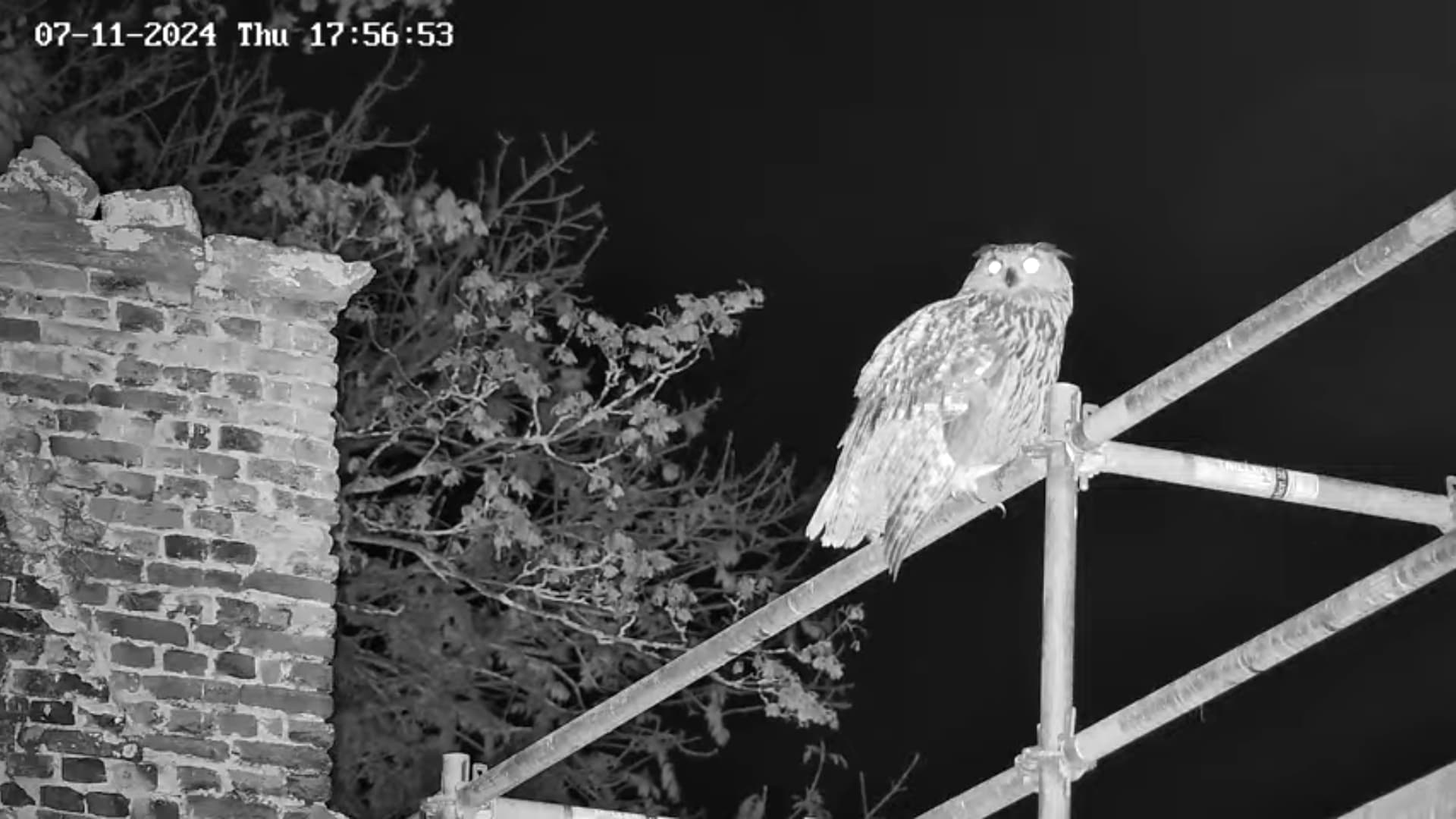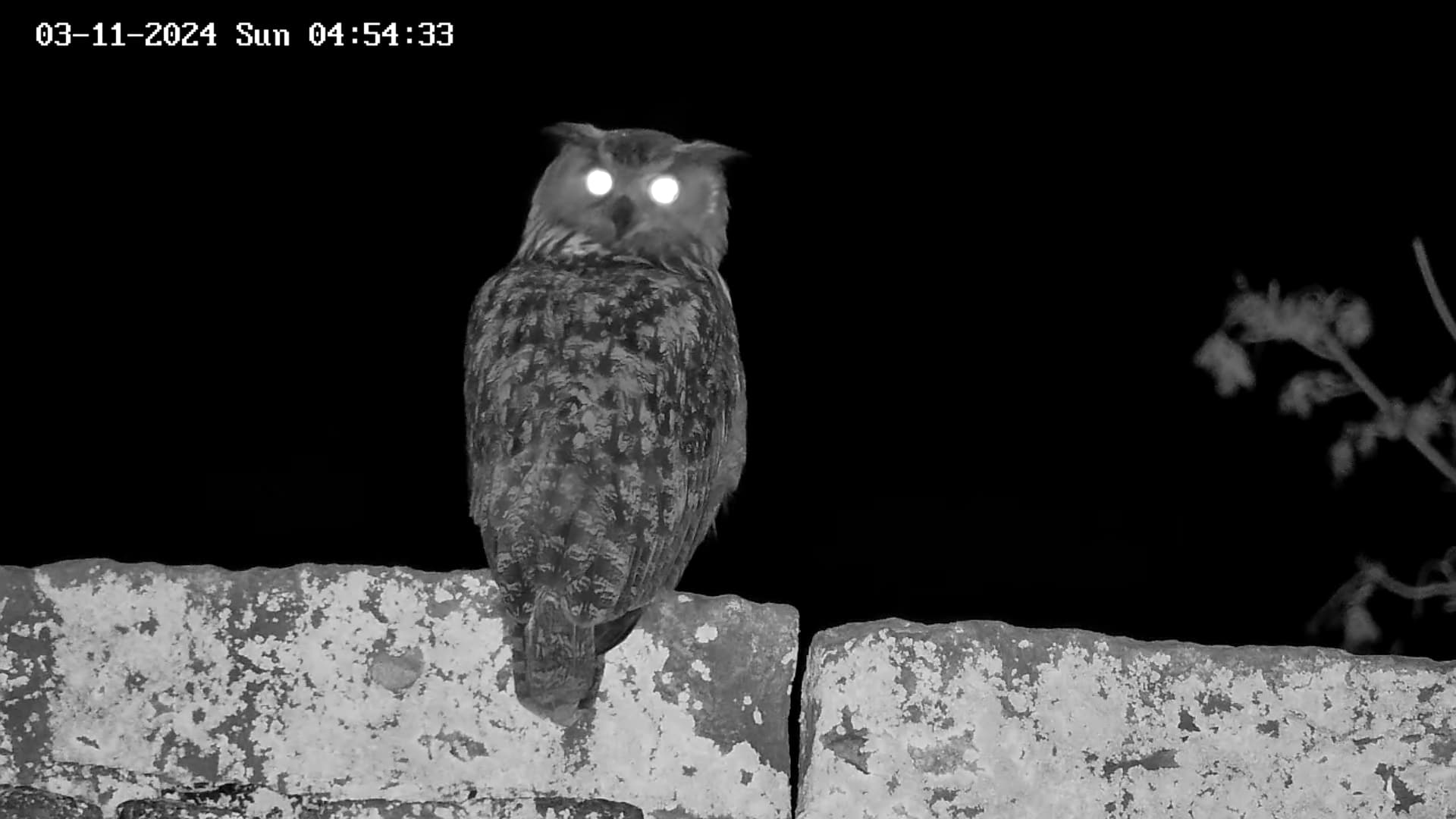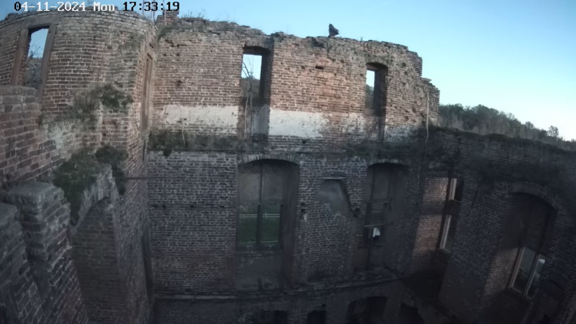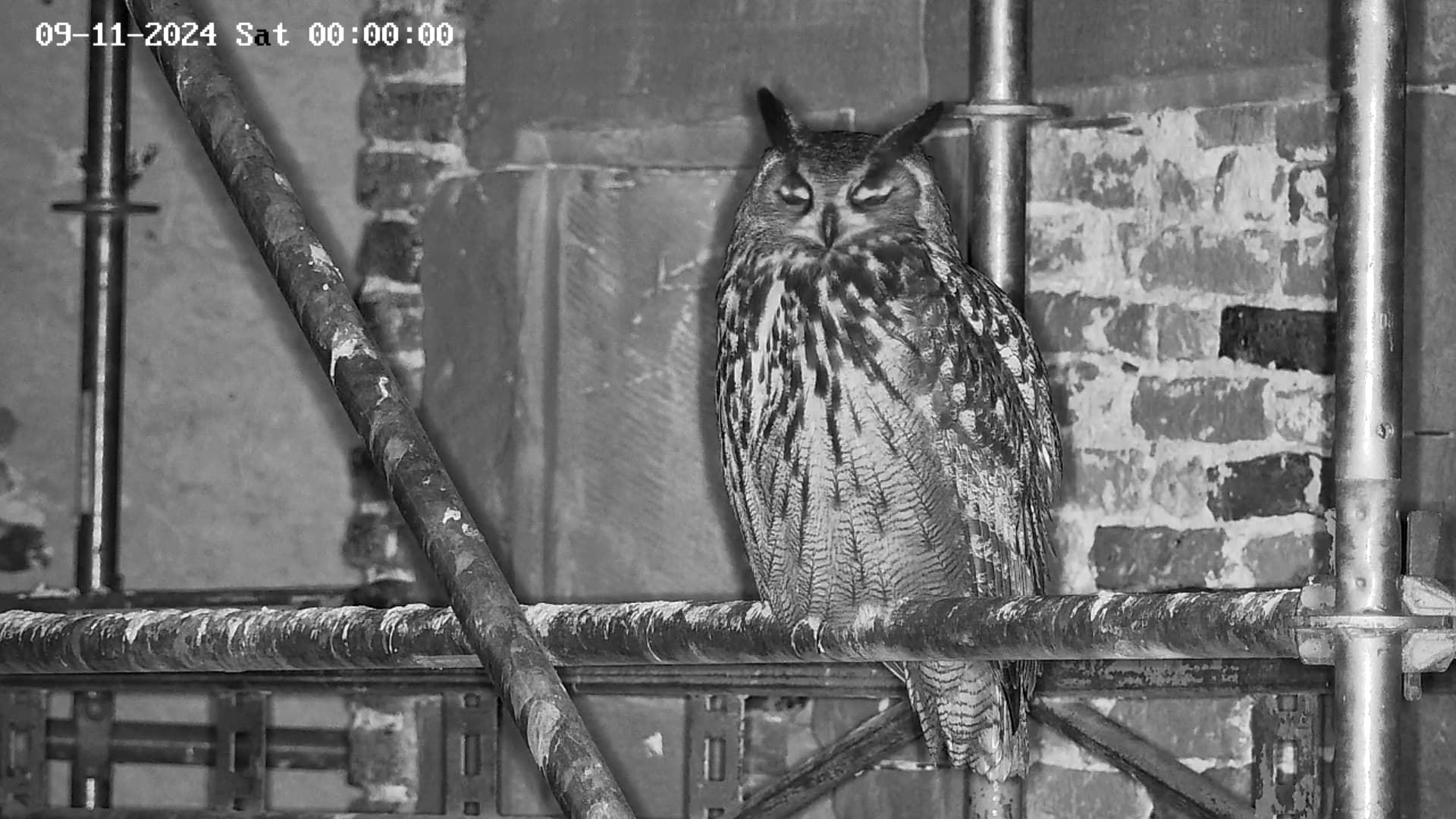 Gestern ließ sich Isolde ja recht früh in der Ruine blicken - heute ist aus Uhu-Sicht ja noch tagschlafende Zeit! Die Kamera läuft ja noch im Tag- Modus. Ihre Rufe sind gut zu hören.