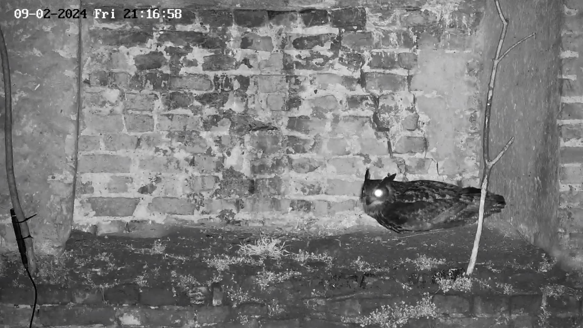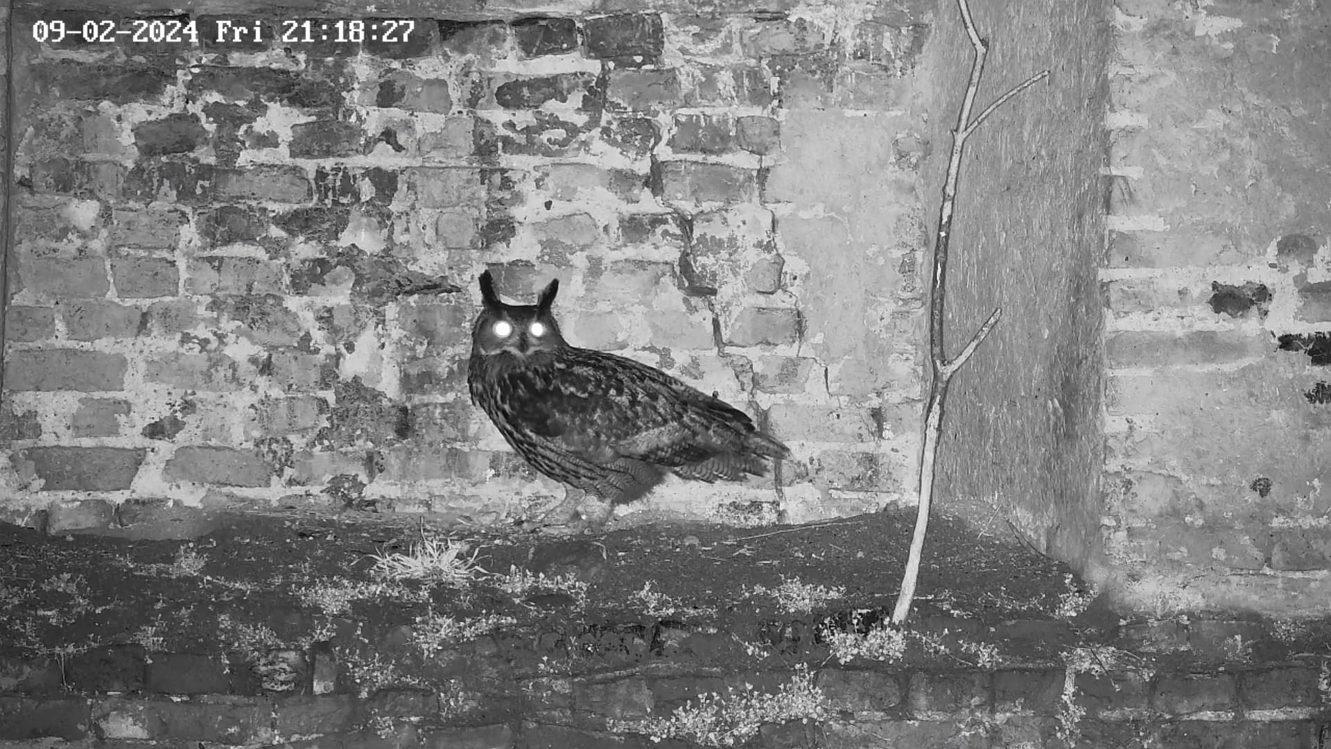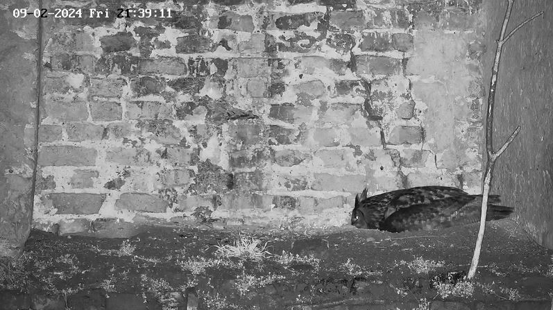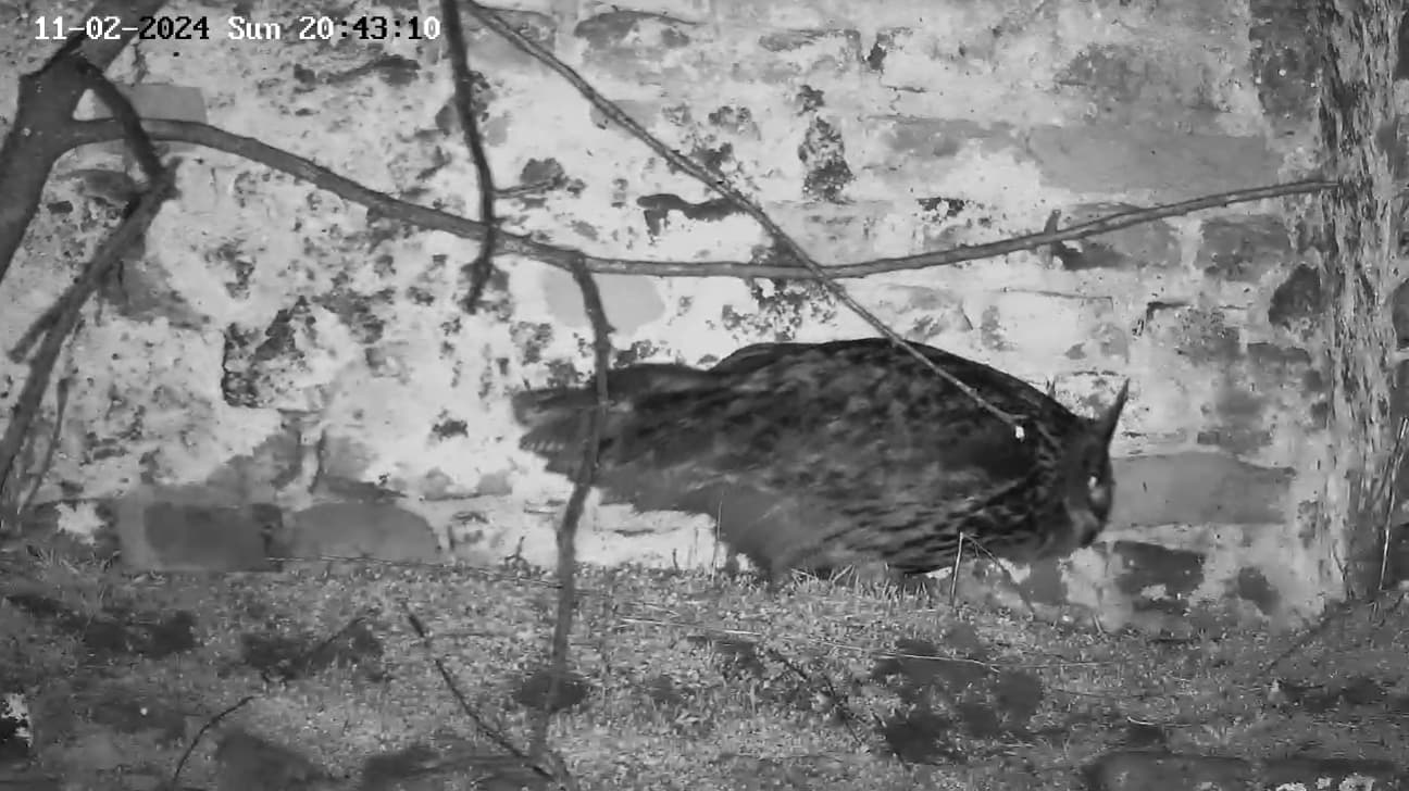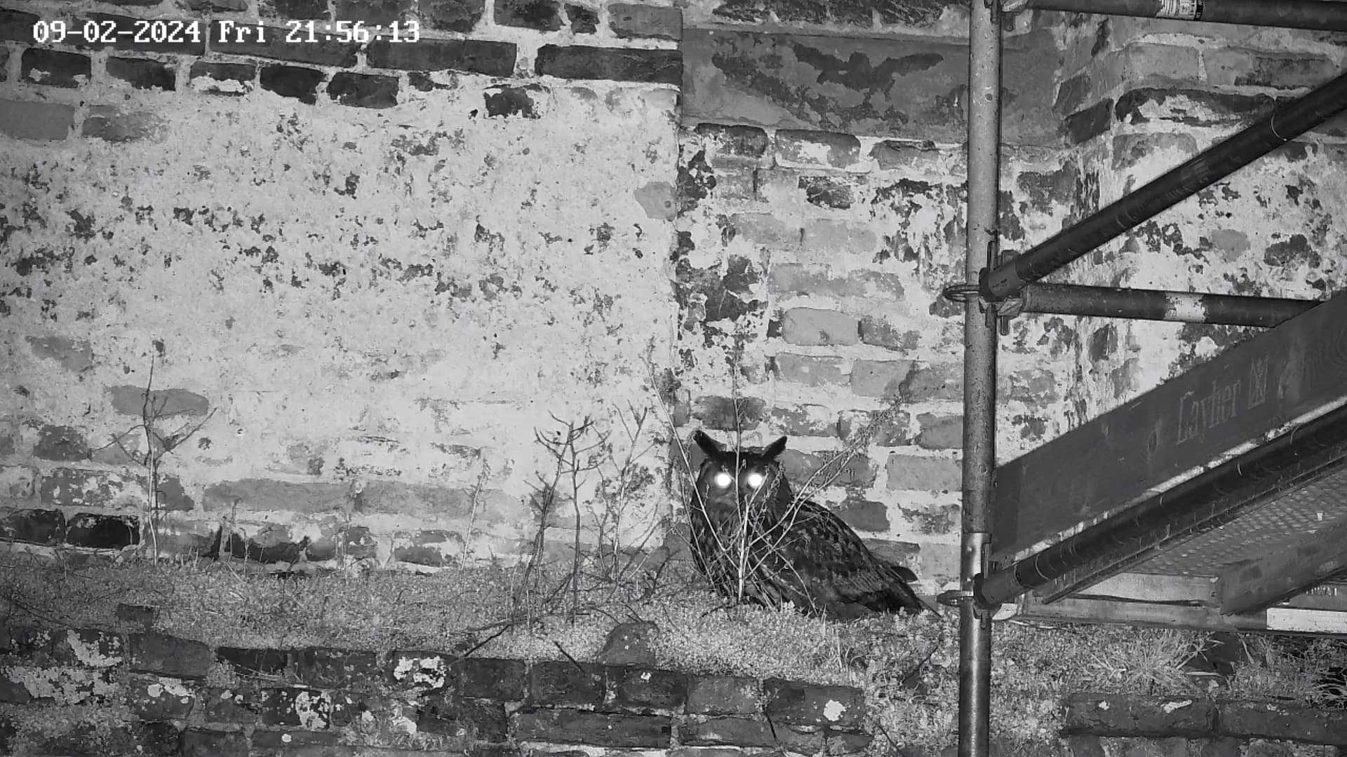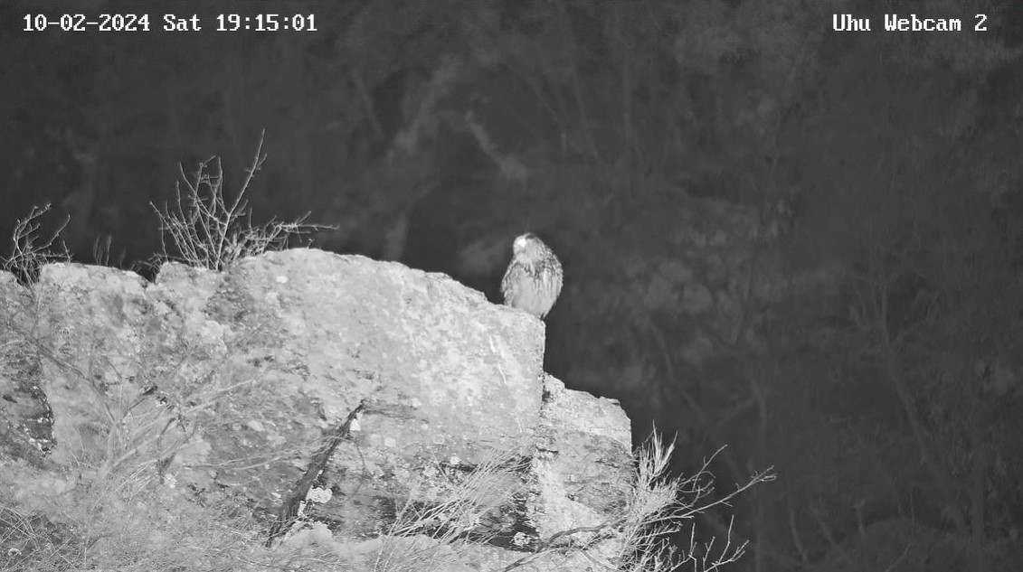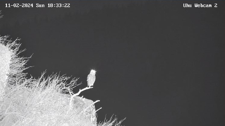 Wie gestern, ist im Ahrtal vor Kamera 2 wieder zuerst ein Uhu zu sehen.