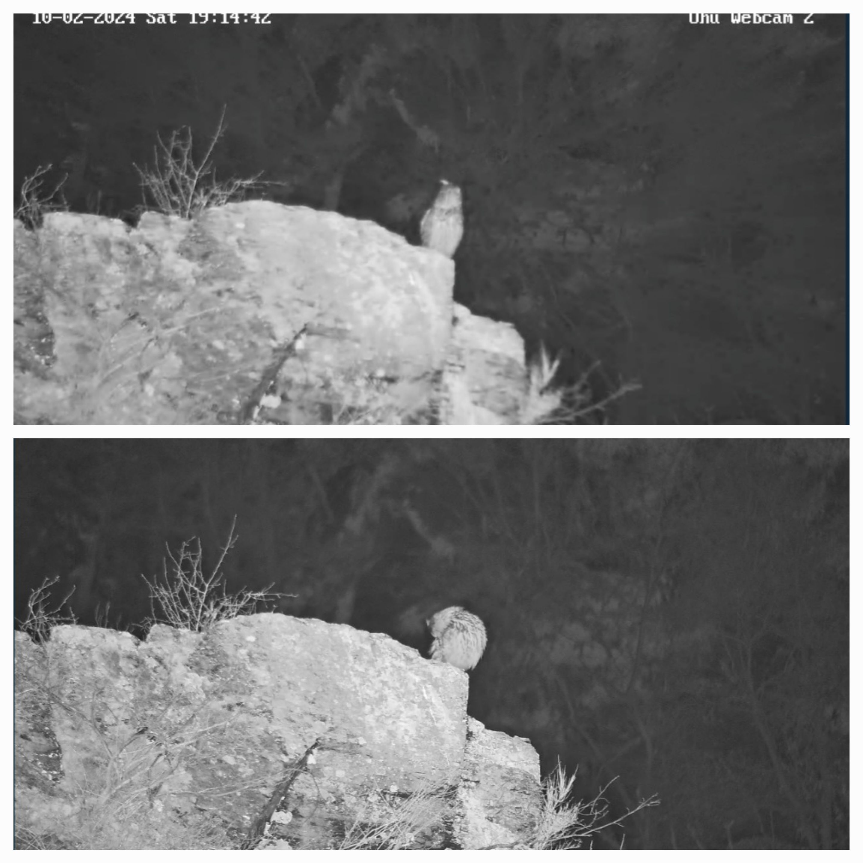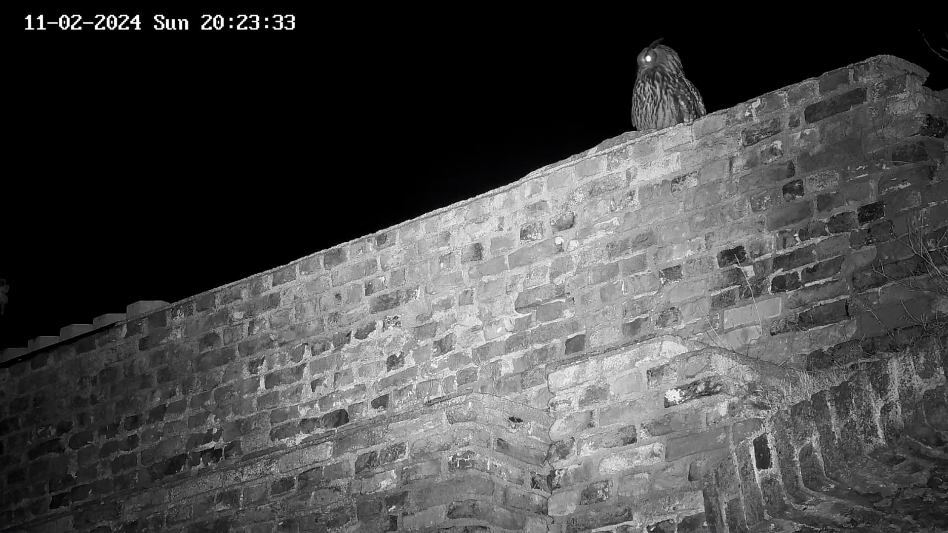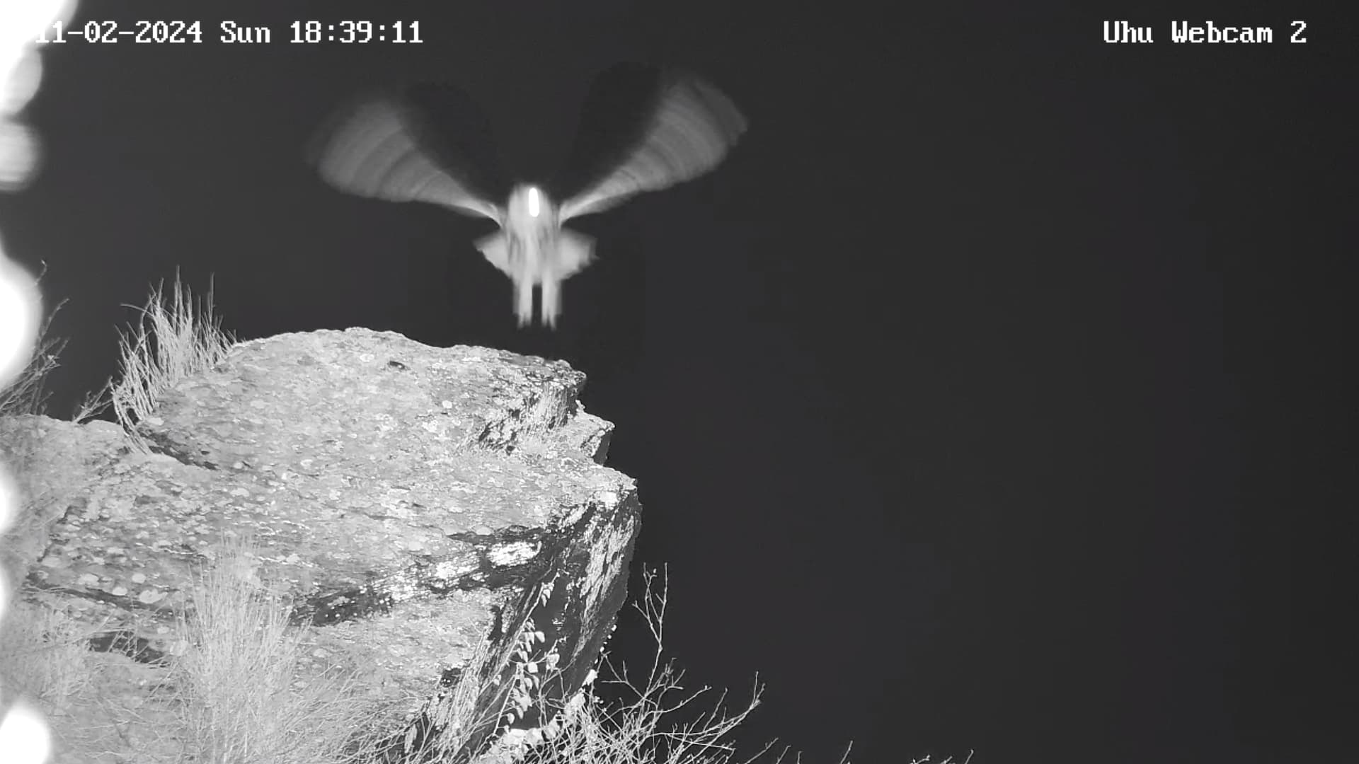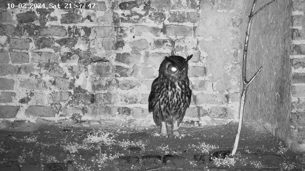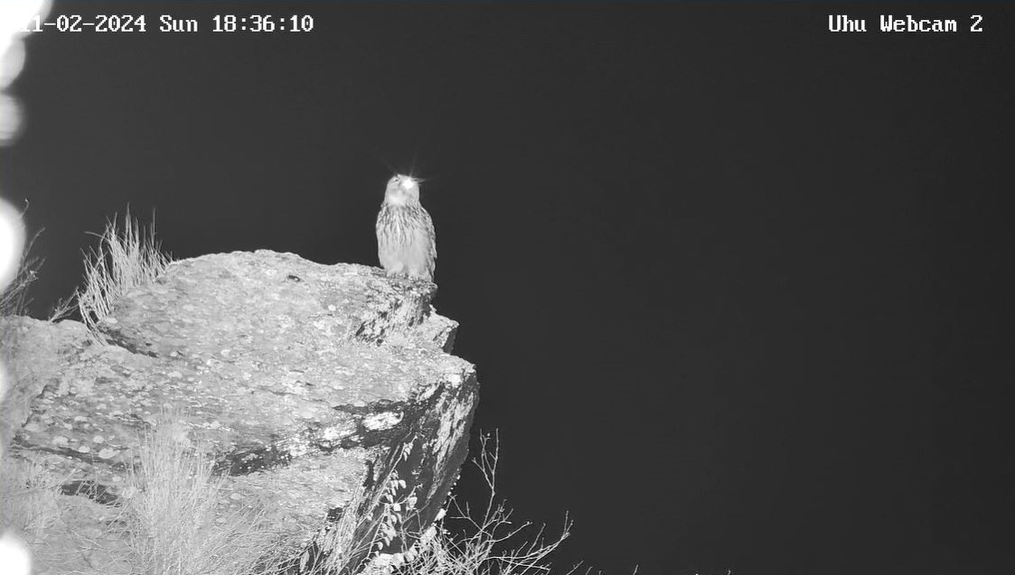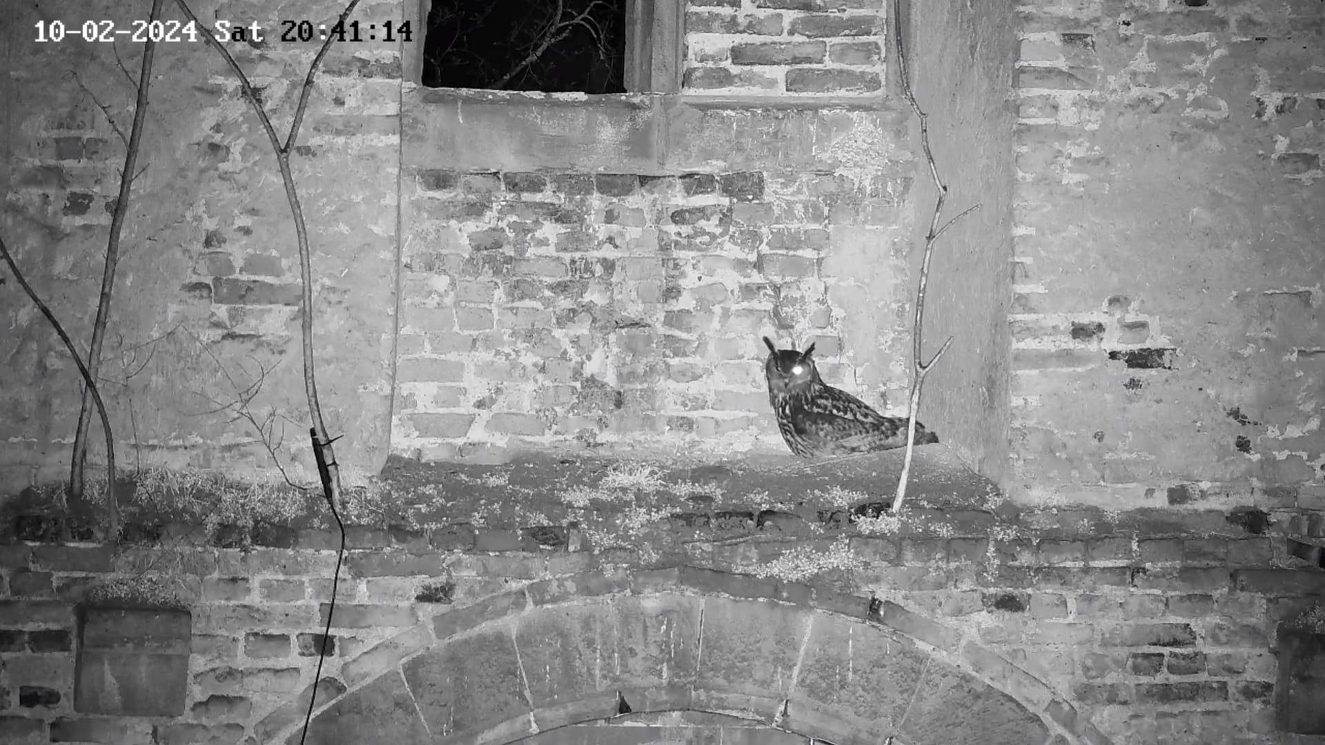 Wie gestern, ist im Ahrtal vor Kamera 2 wieder zuerst ein Uhu zu sehen.