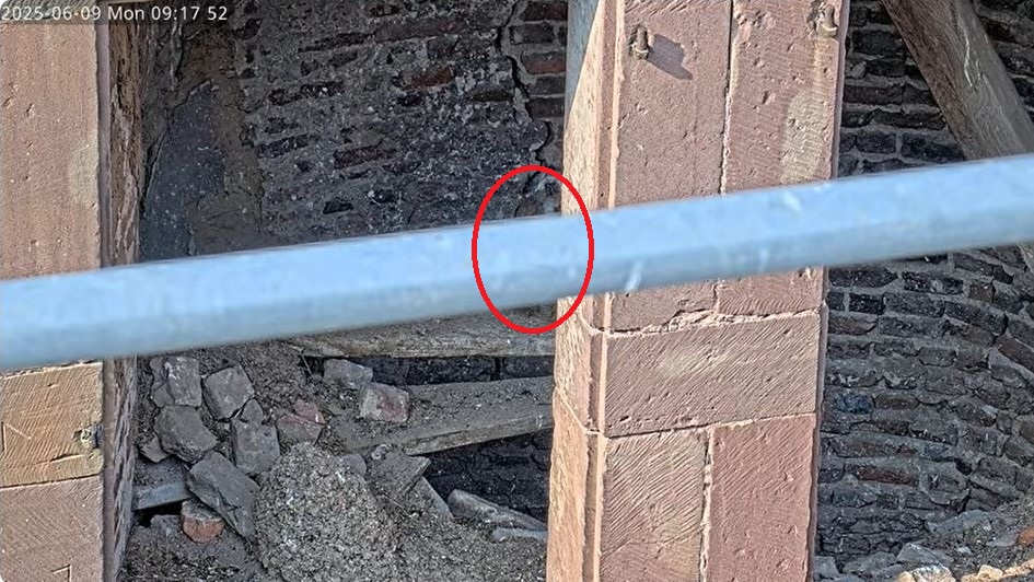 Oberhalb der Gerüststange direkt links von dem Sandstein- Mittelpfosten. Es ist nur der Kopf zu sehen.