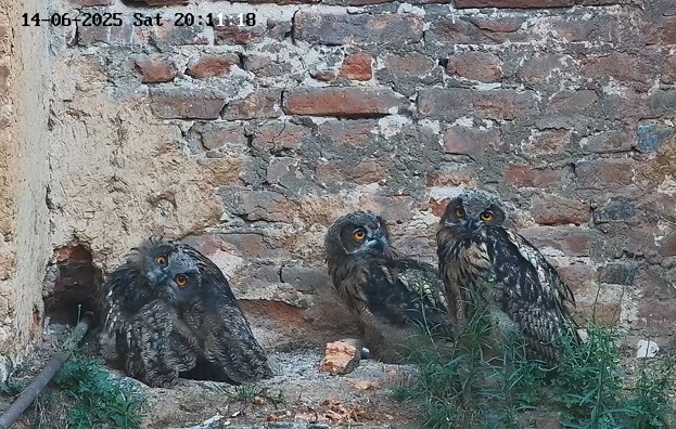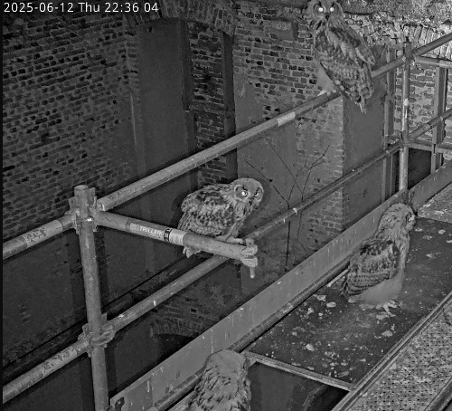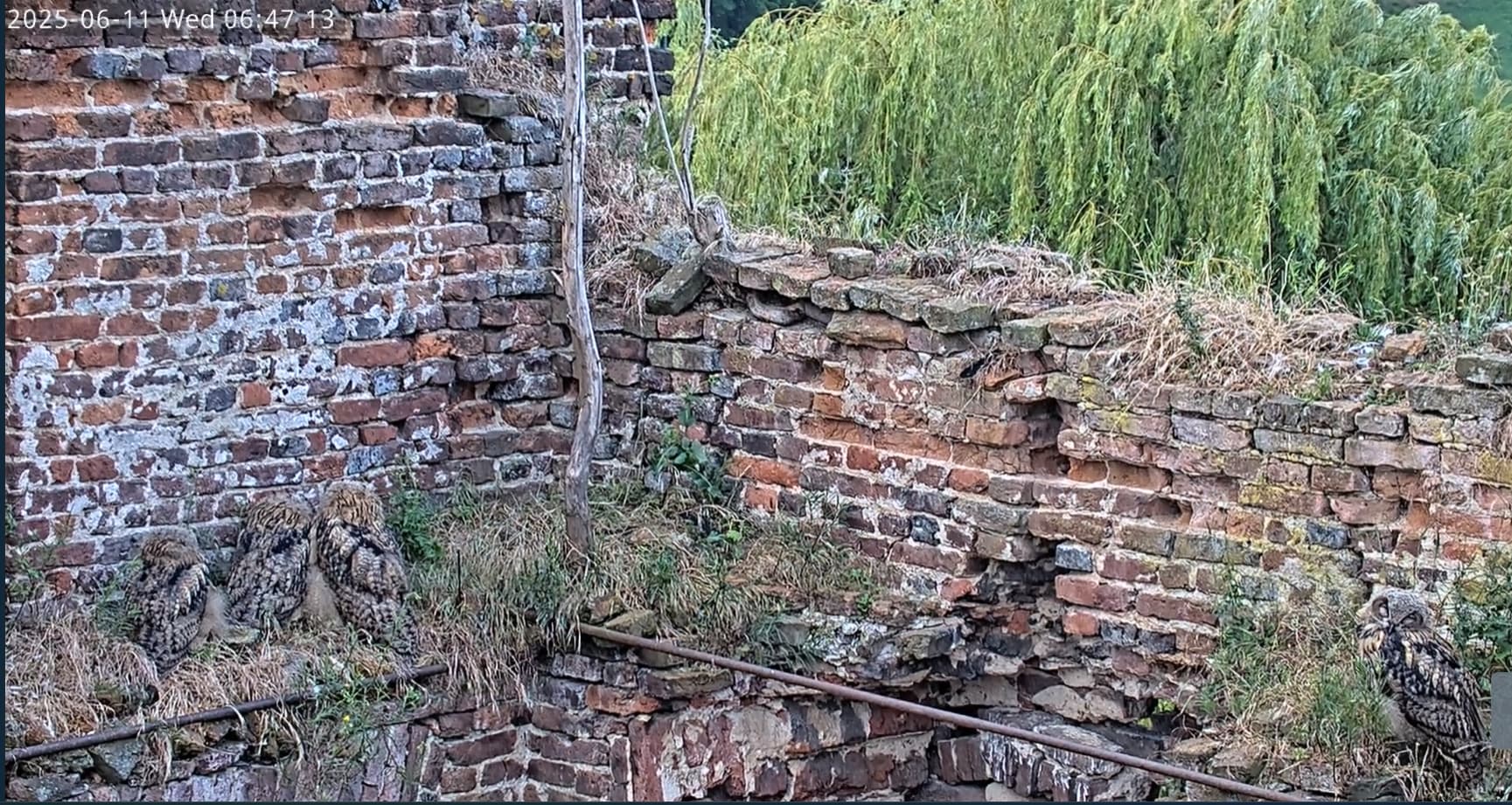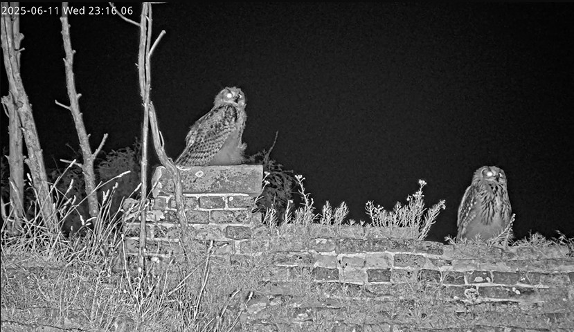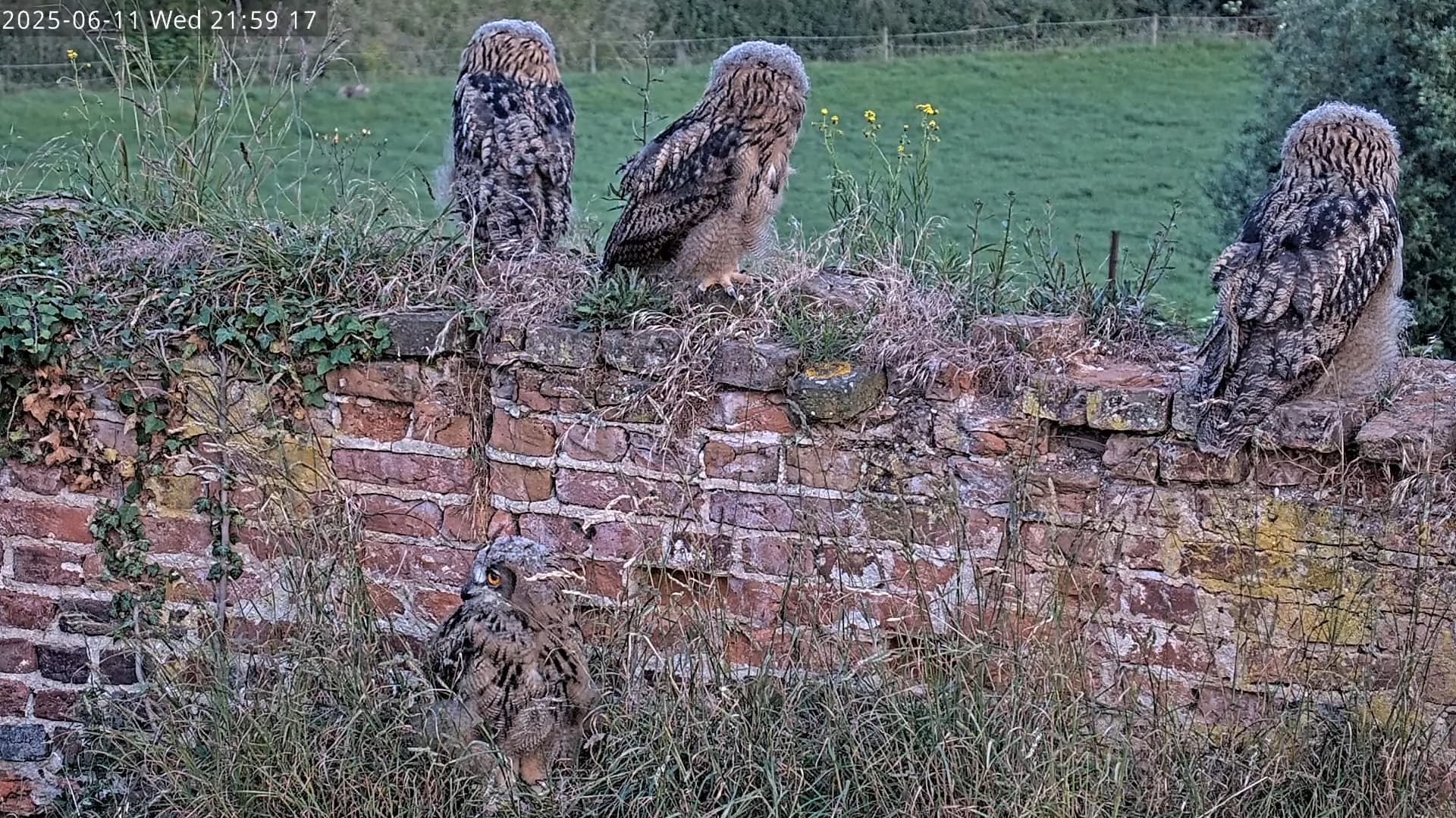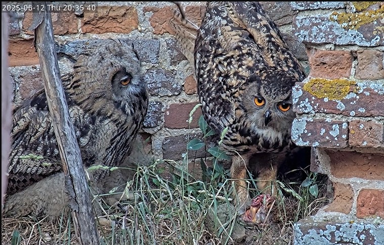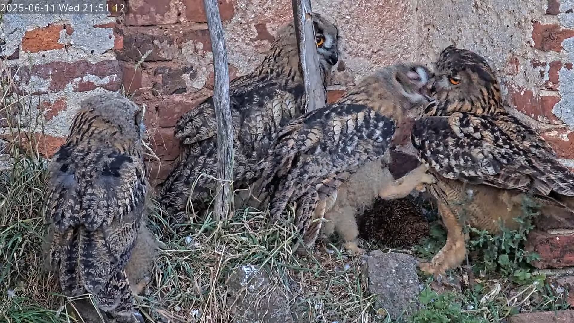 Isolde gibt ihren Igel an 2 Jung-Uhus ab, die damit aber anscheinend noch nicht so zurecht kommen und sich erstmal wieder zurück ziehen