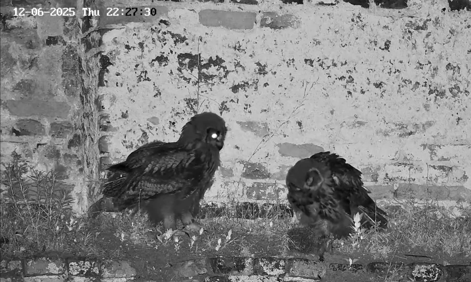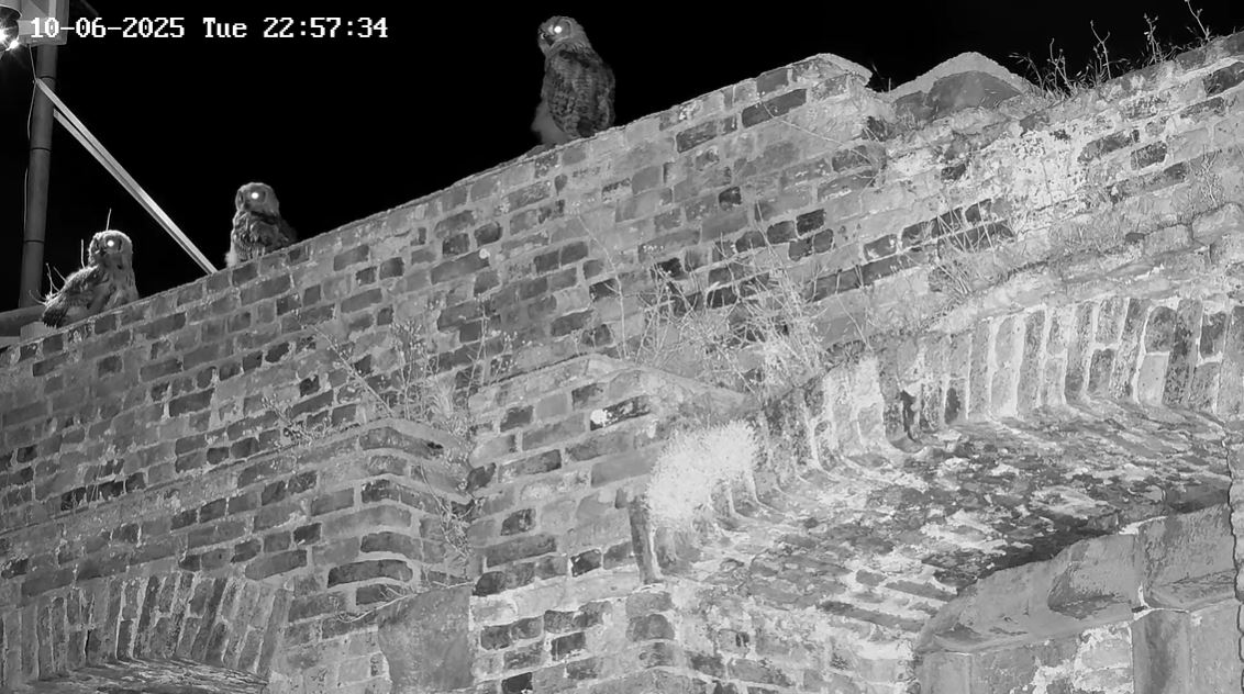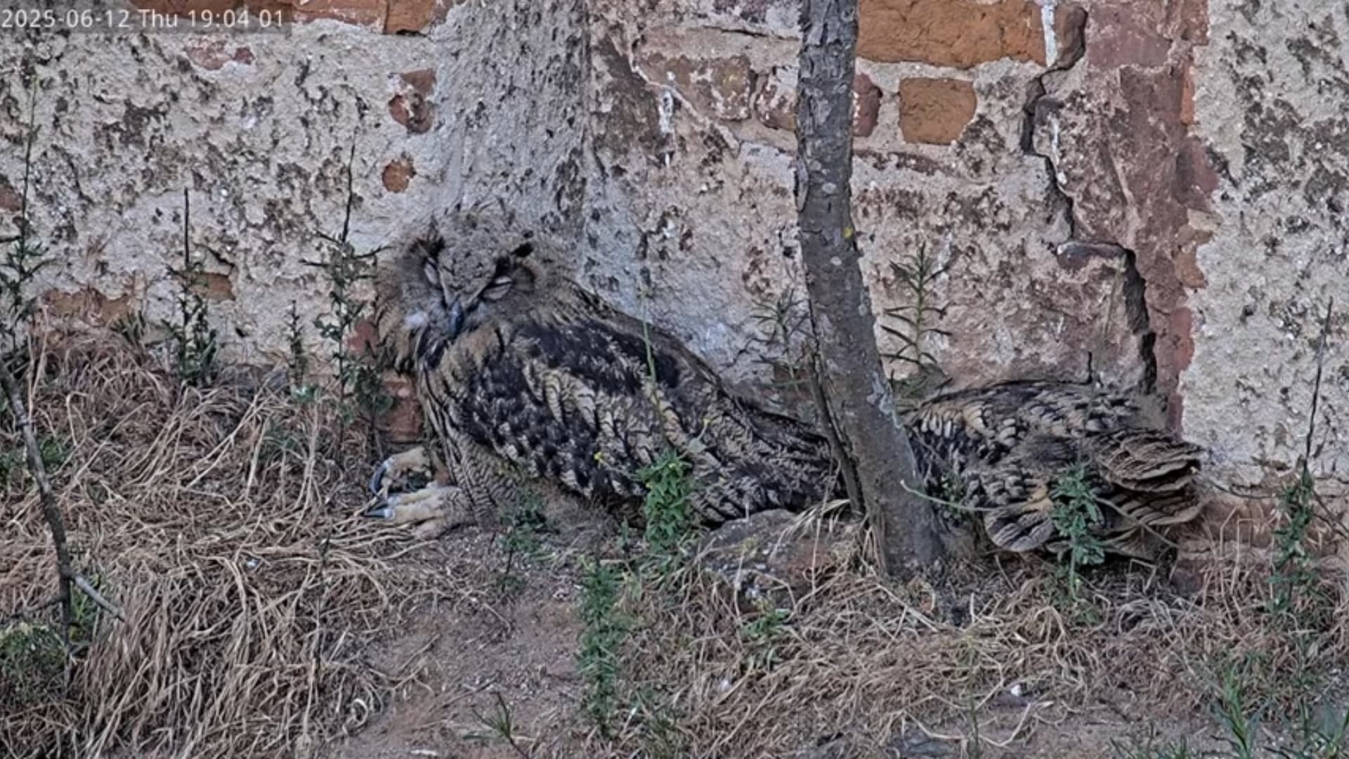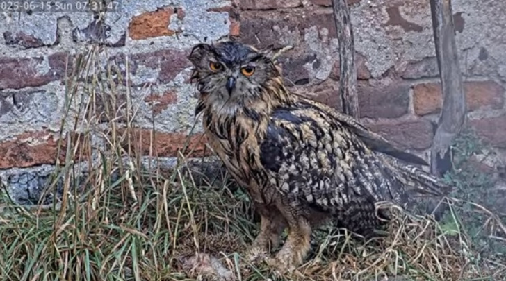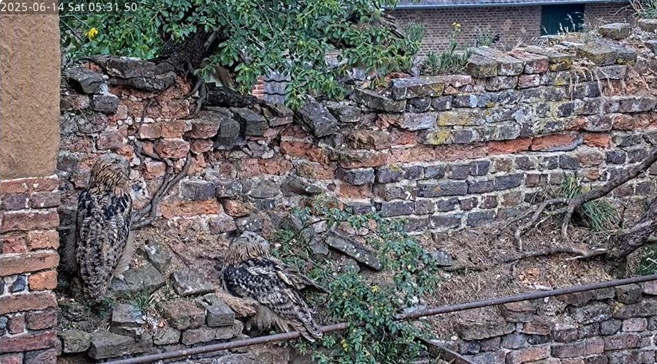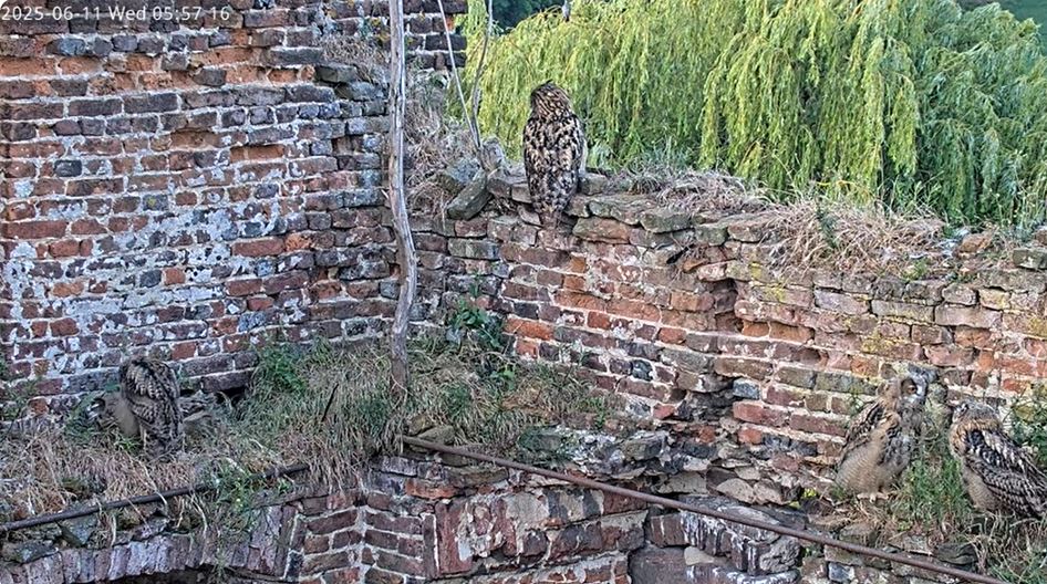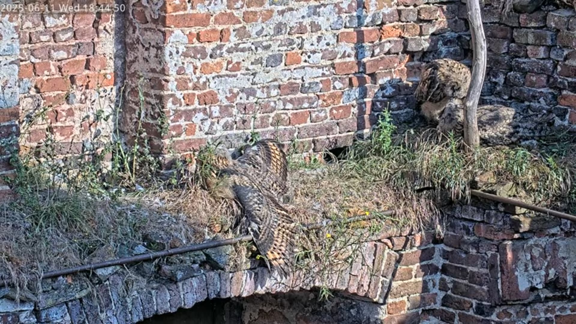 Isolde gibt ihren Igel an 2 Jung-Uhus ab, die damit aber anscheinend noch nicht so zurecht kommen und sich erstmal wieder zurück ziehen