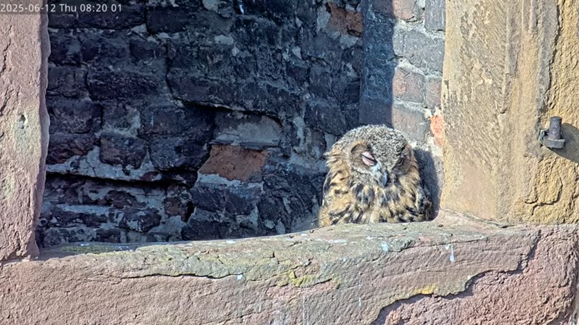 Im Chat steht dazu, dass der europäische Uhu im Alter von 82 bis 86 Tagen nackte, grell-rosa Augenlider zeigt.