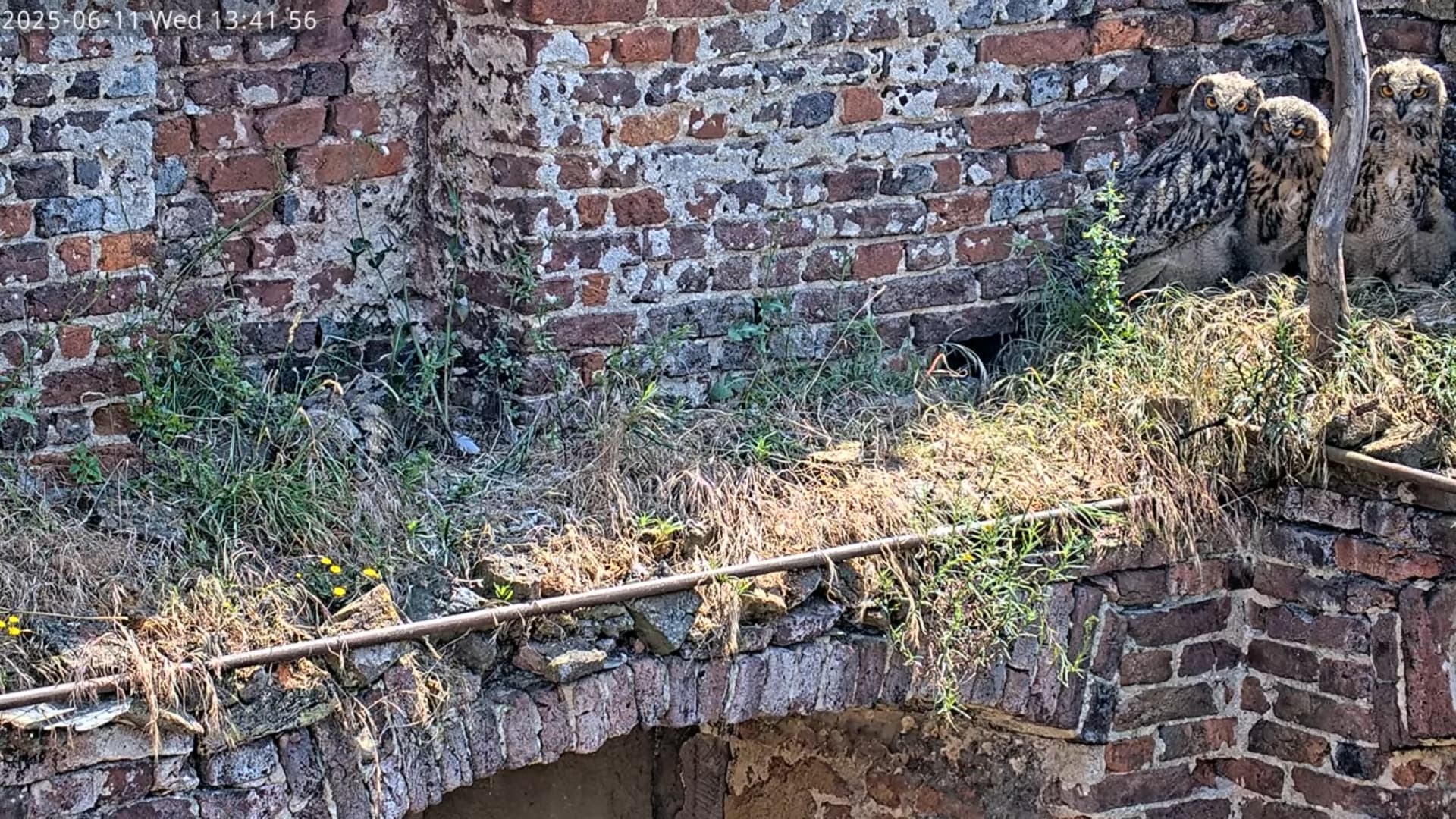 Drei Junguhus. Der linke schaut gerade von der Gefiederpflege auf.